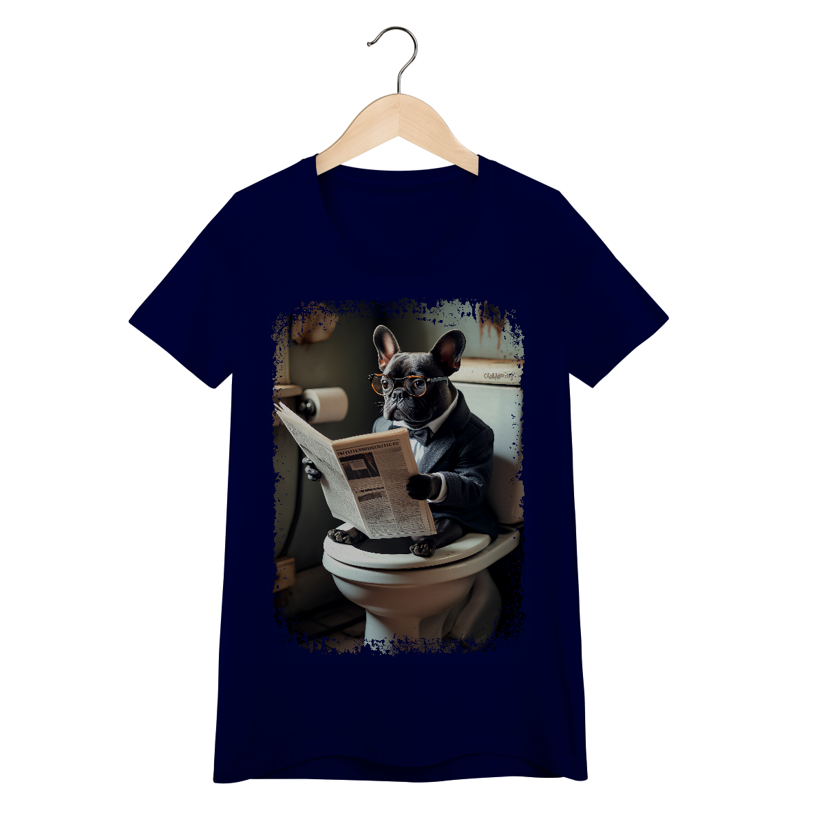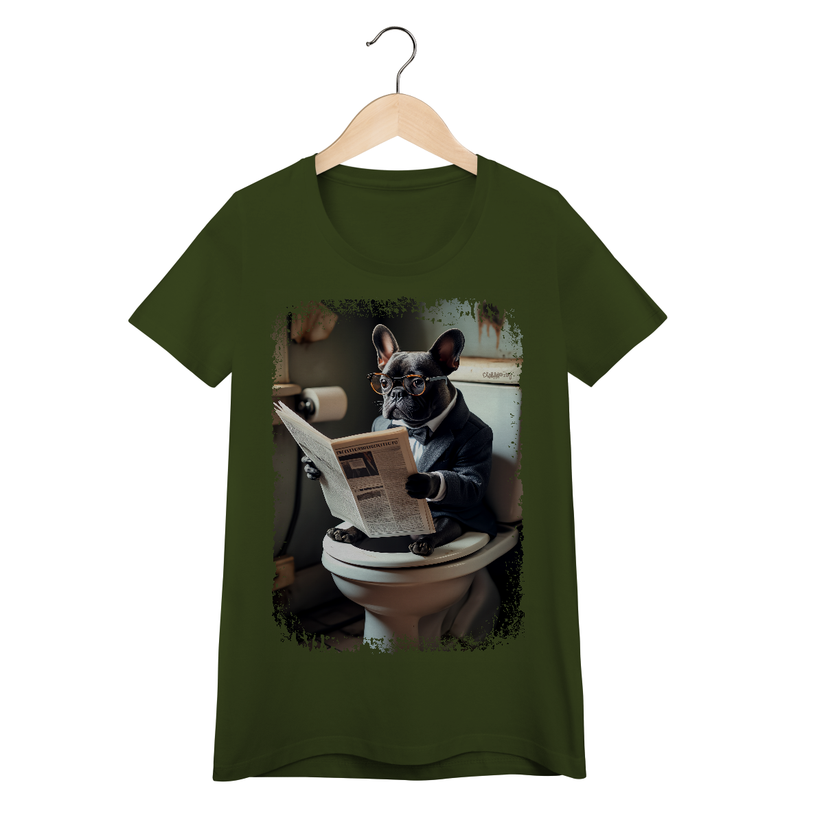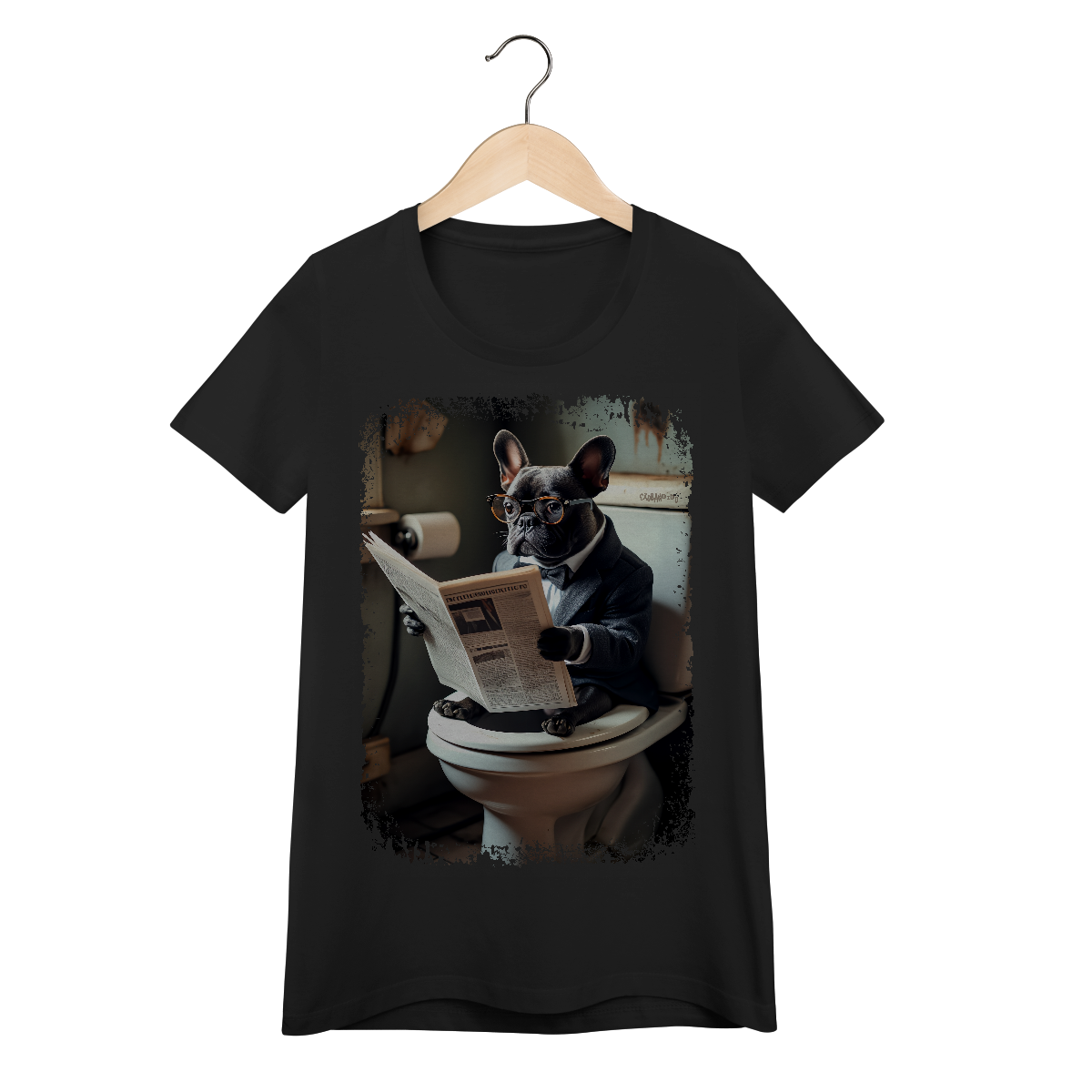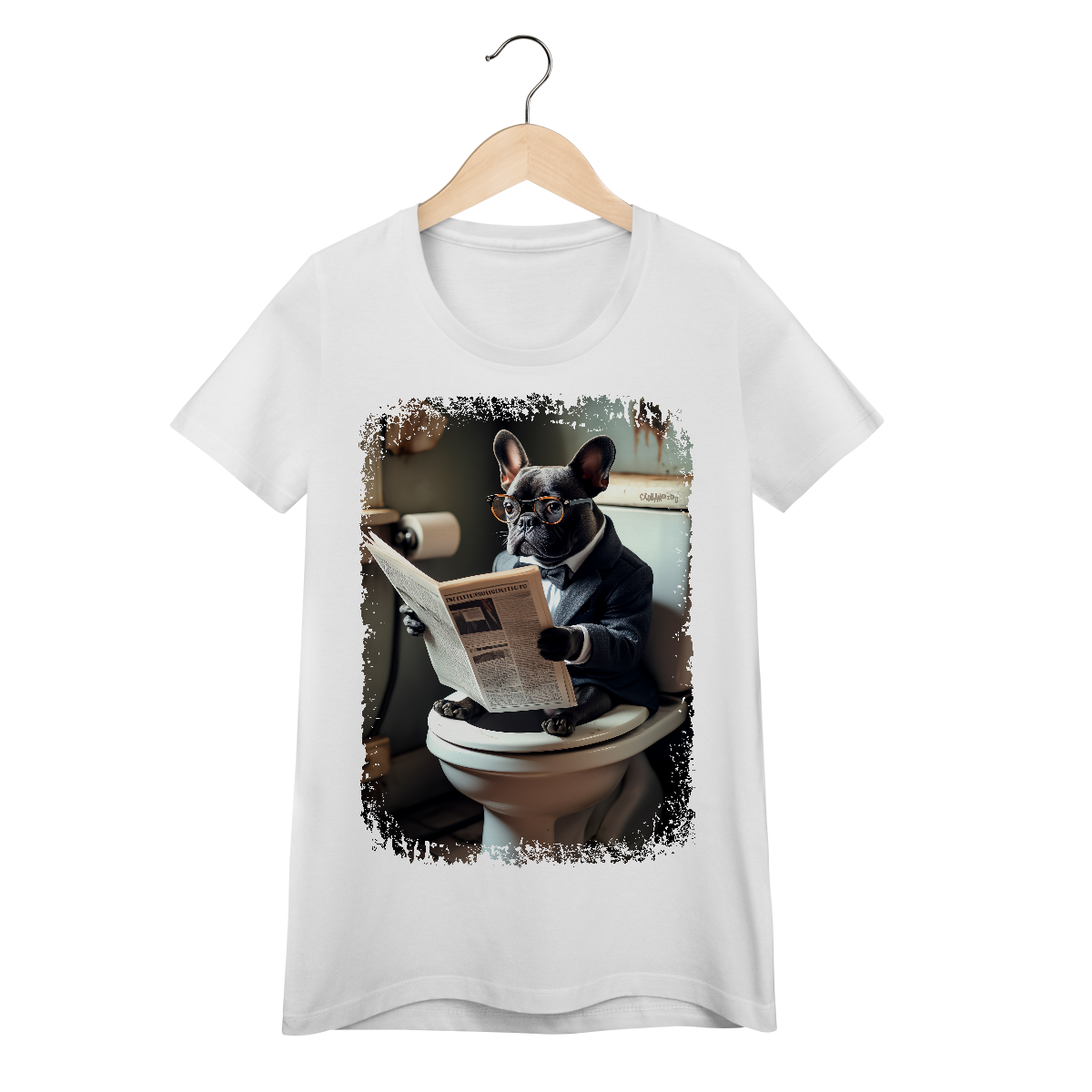 Camiseta Feminina com Buldogue Francês no banheiro, ele está sentado na privada e lendo jornal.