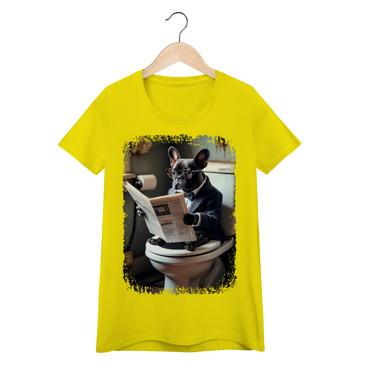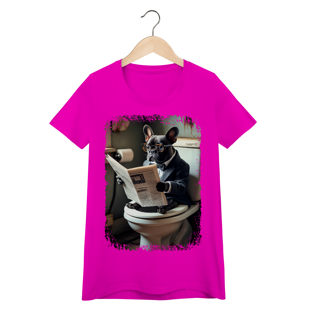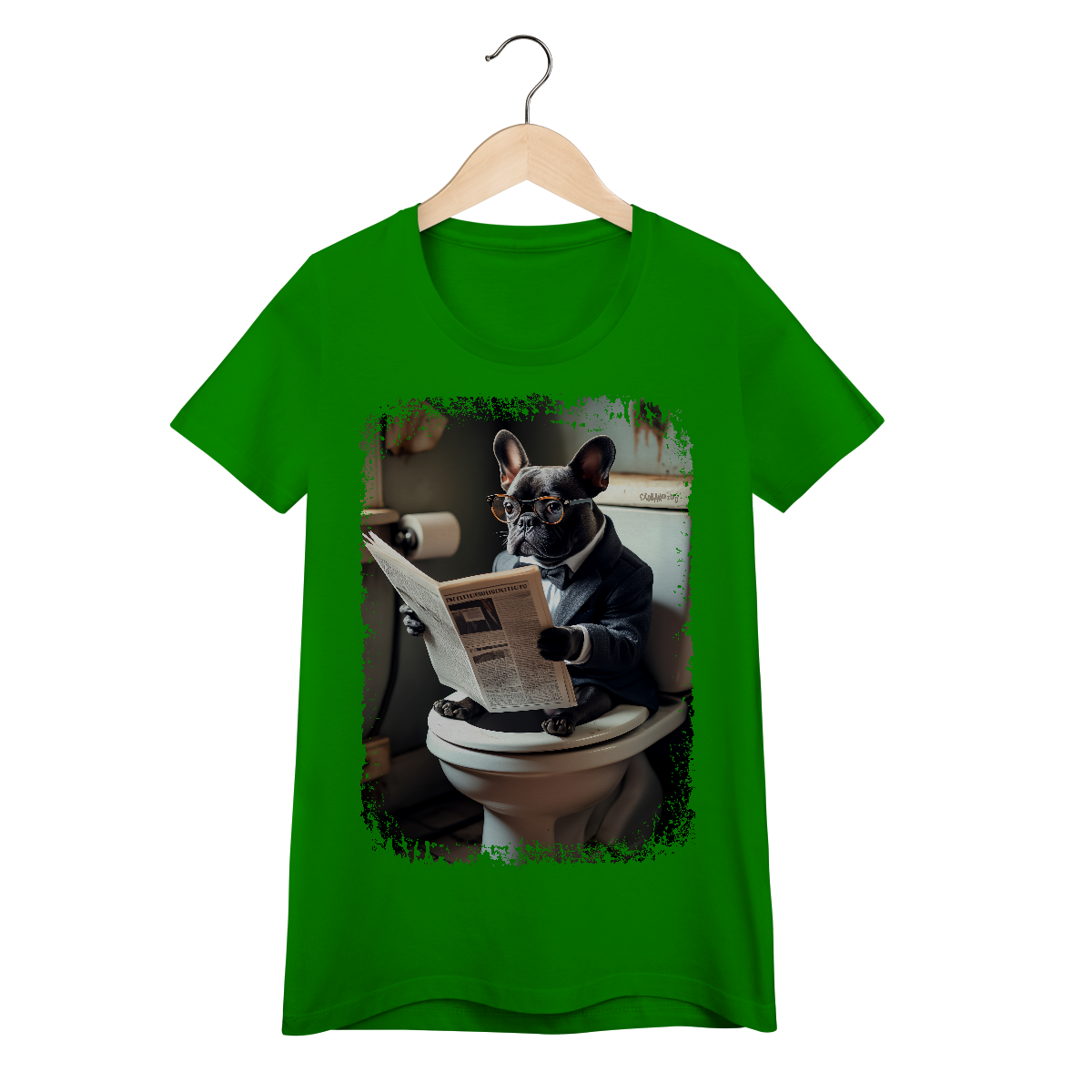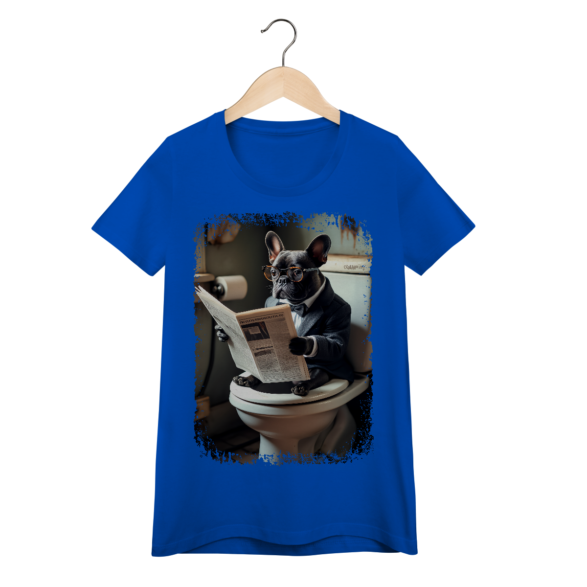 Camiseta Feminina com Buldogue Francês no banheiro, ele está sentado na privada e lendo jornal.