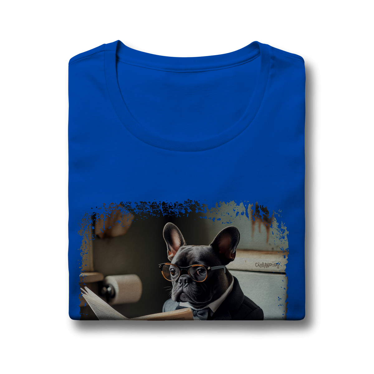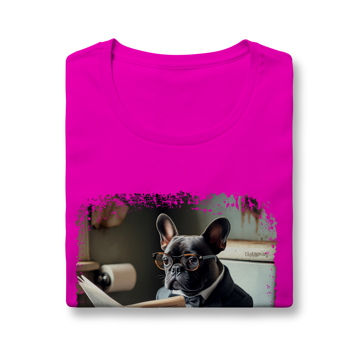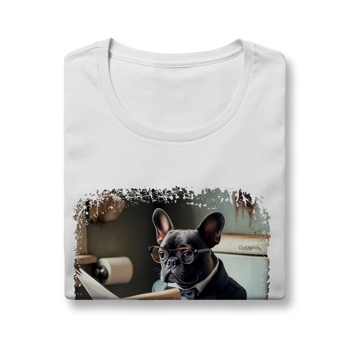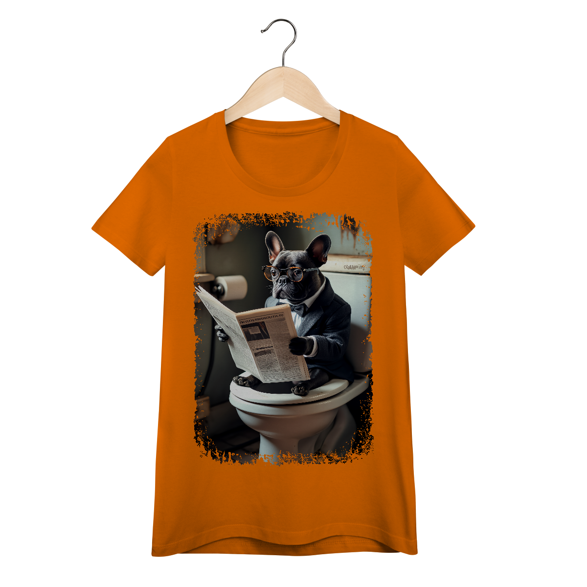 Camiseta Feminina com Buldogue Francês no banheiro, ele está sentado na privada e lendo jornal.