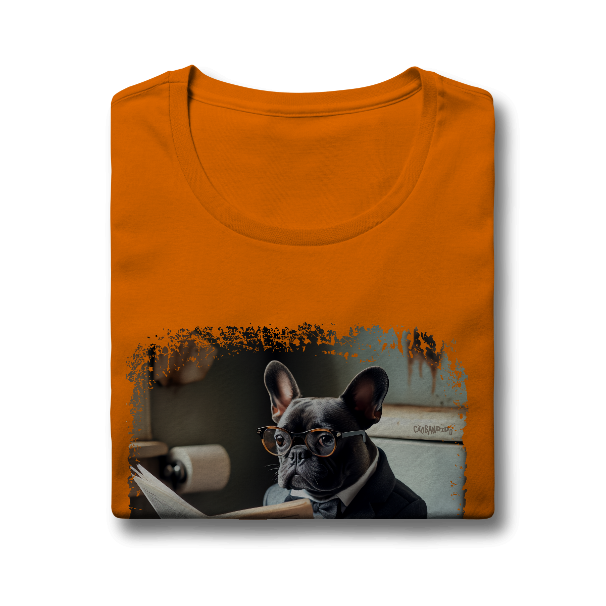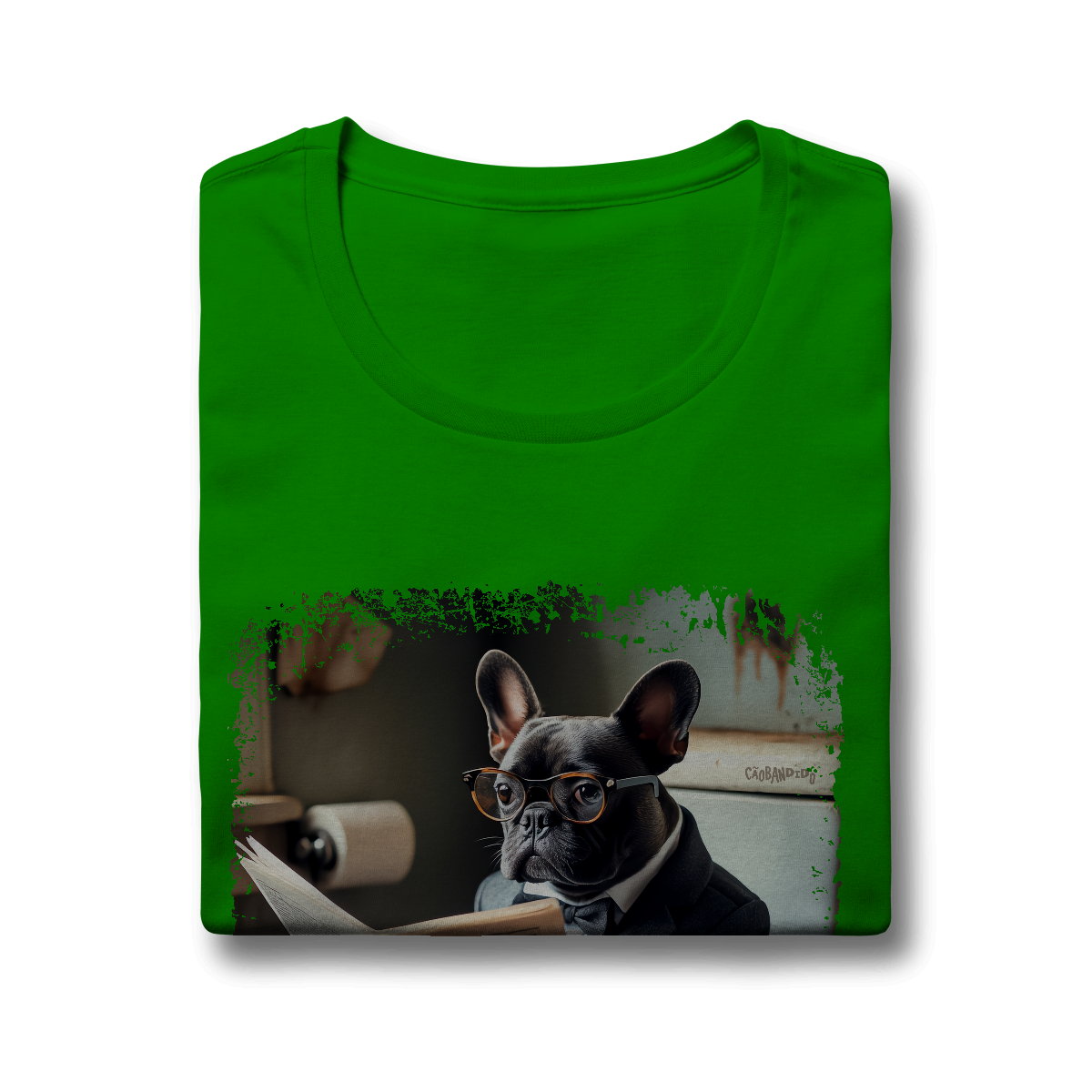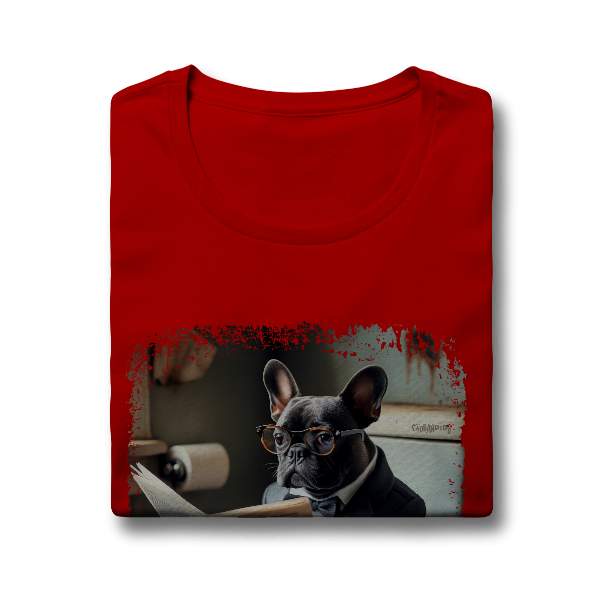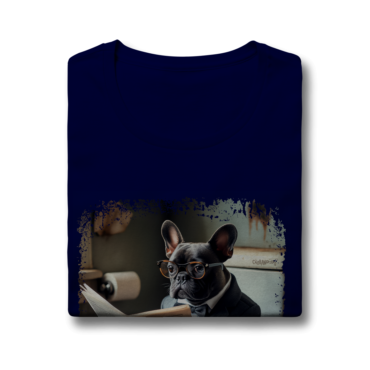 Camiseta Feminina com Buldogue Francês no banheiro, ele está sentado na privada e lendo jornal.