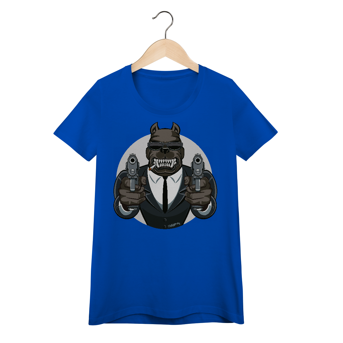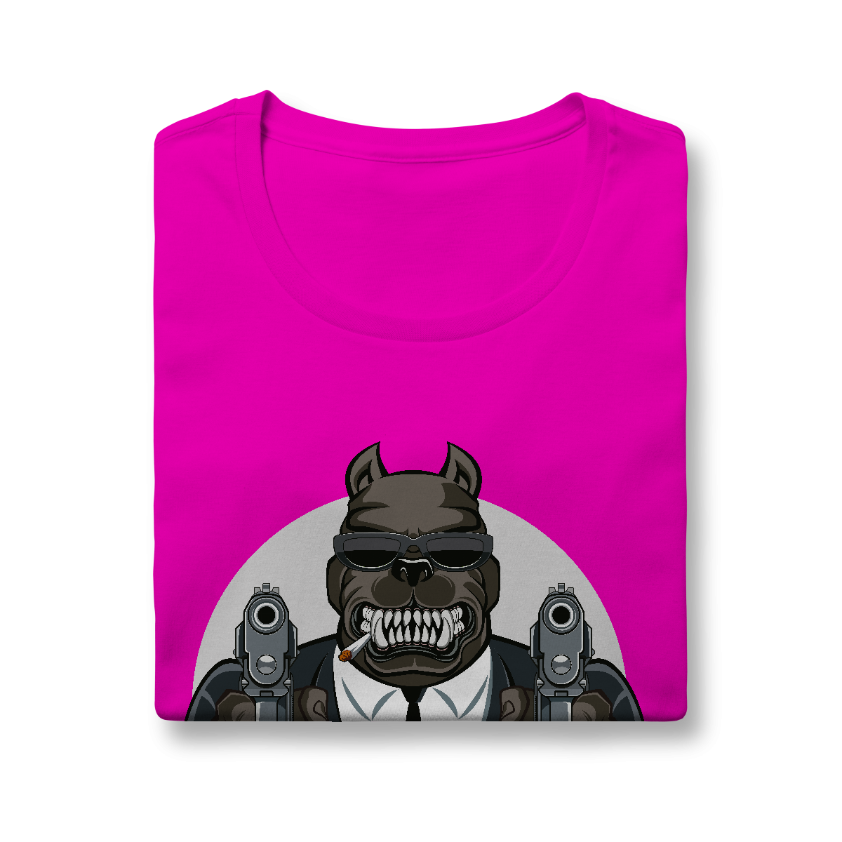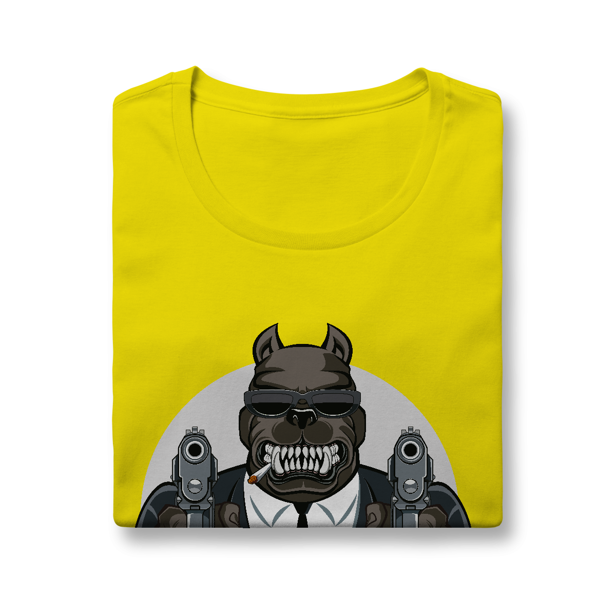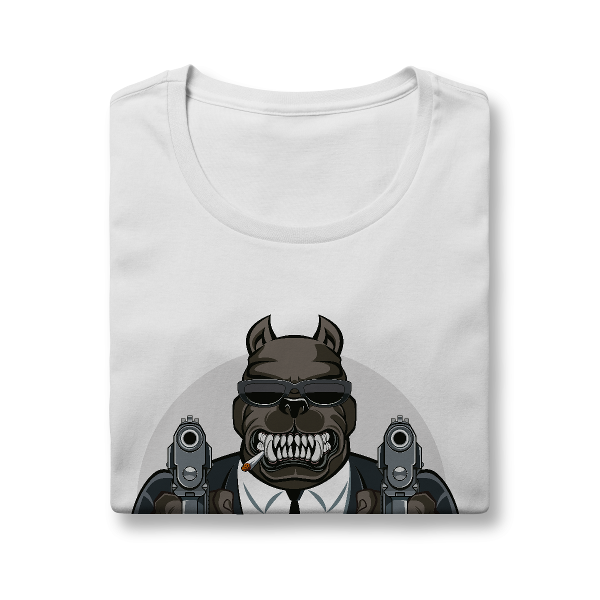 Estampa irada com um cachorro Pitbull segurando duas armas e fumando, bem no estilo mafioso.