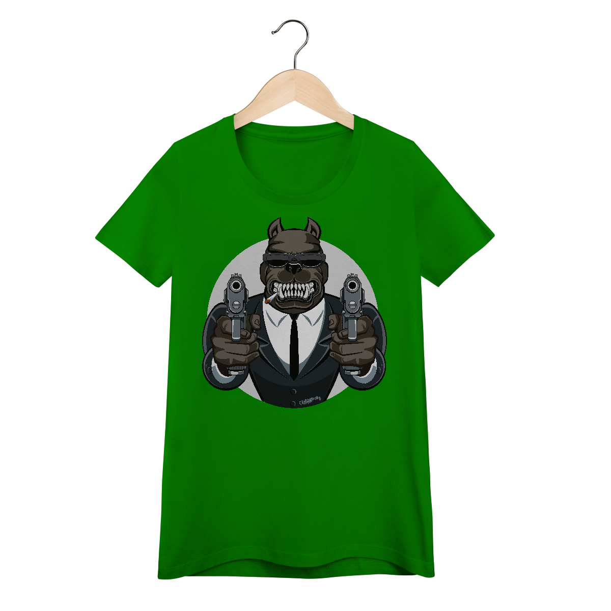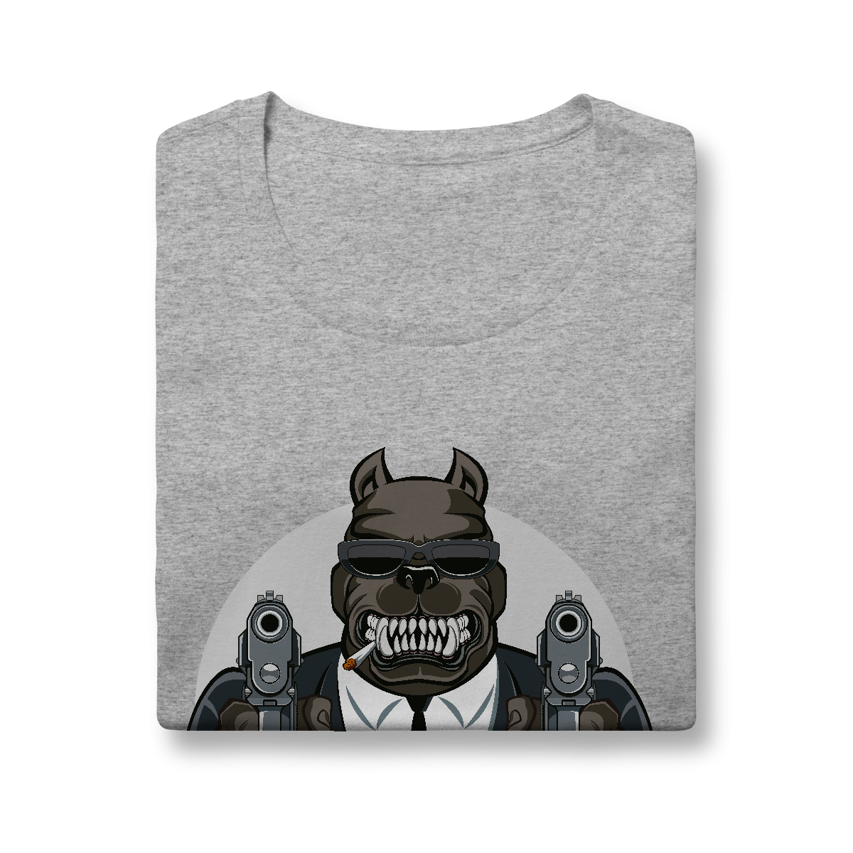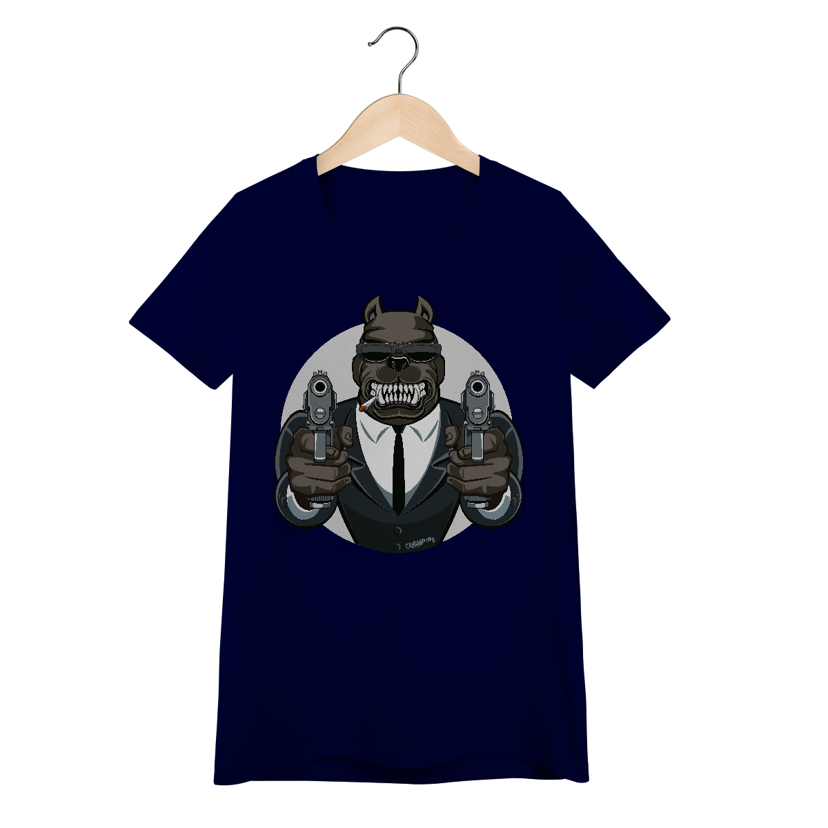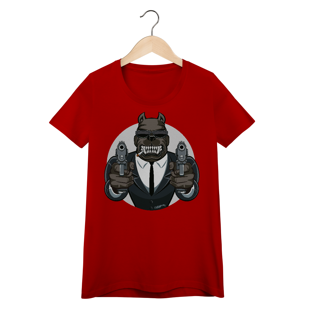 Estampa irada com um cachorro Pitbull segurando duas armas e fumando, bem no estilo mafioso.