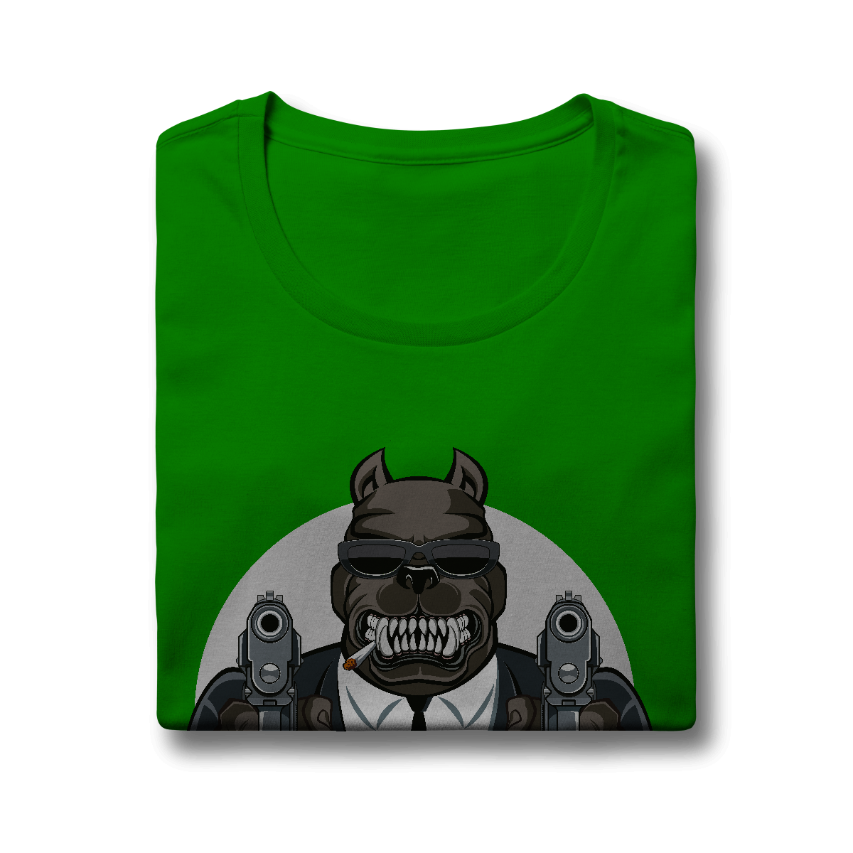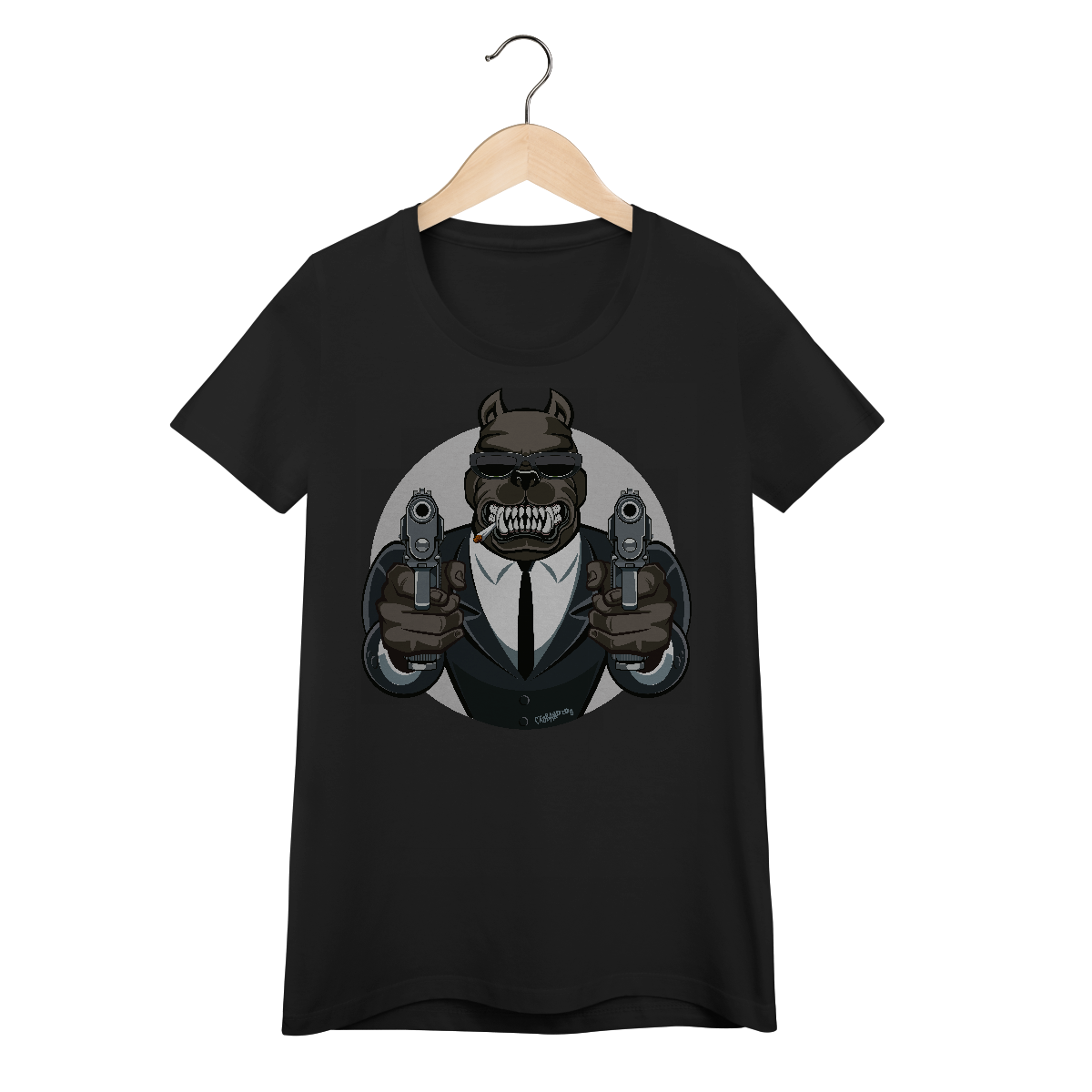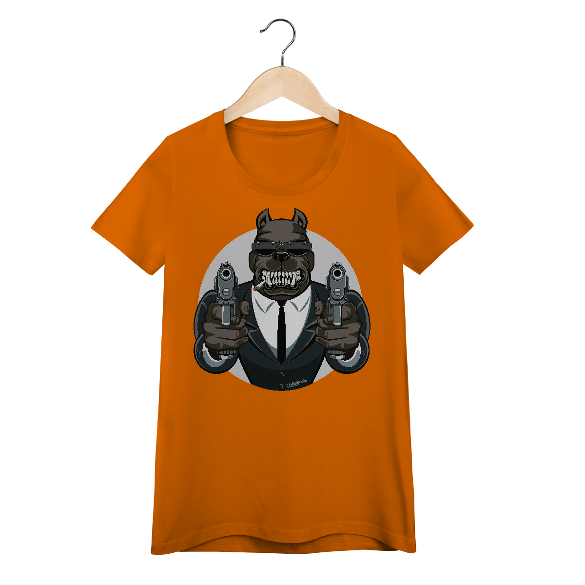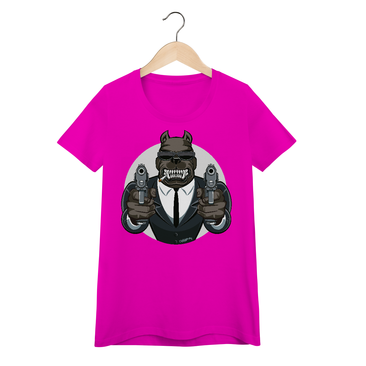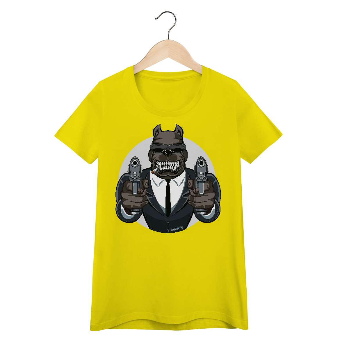 Estampa irada com um cachorro Pitbull segurando duas armas e fumando, bem no estilo mafioso.