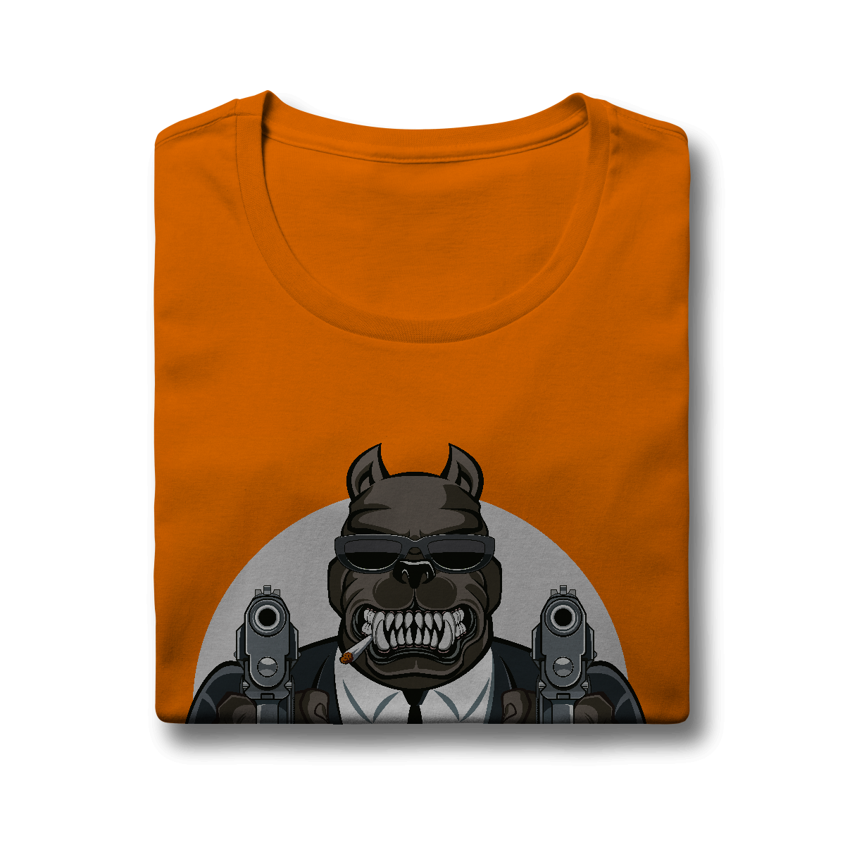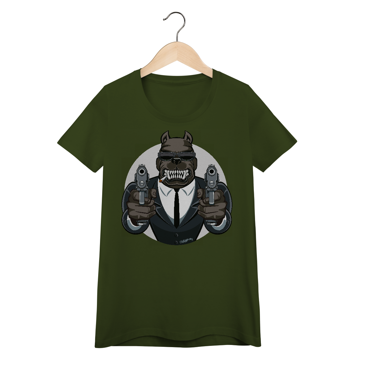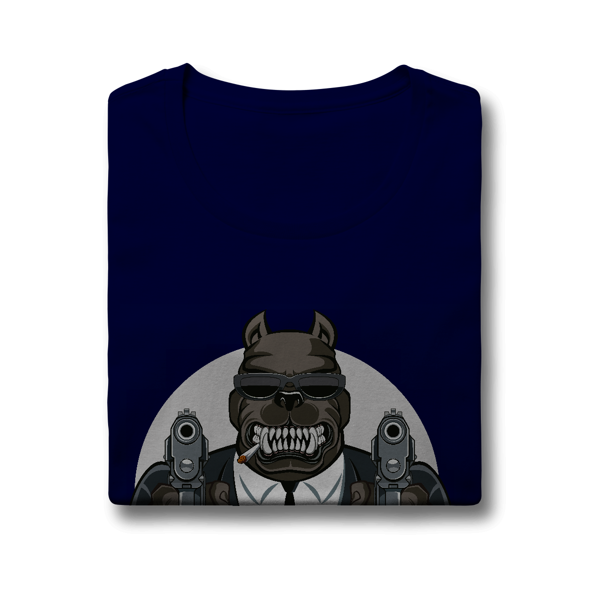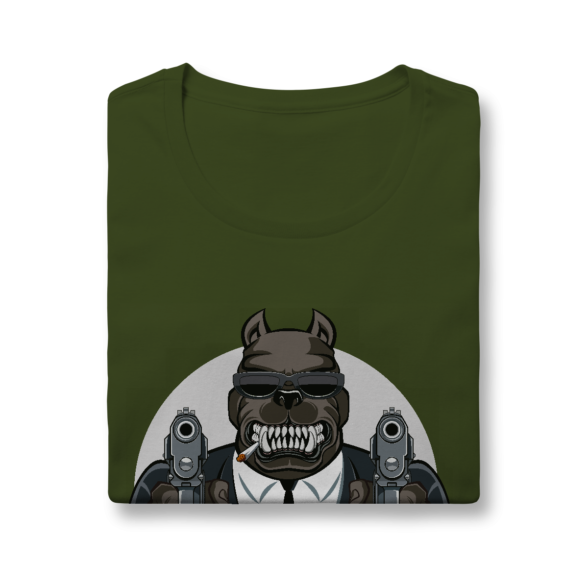 Estampa irada com um cachorro Pitbull segurando duas armas e fumando, bem no estilo mafioso.