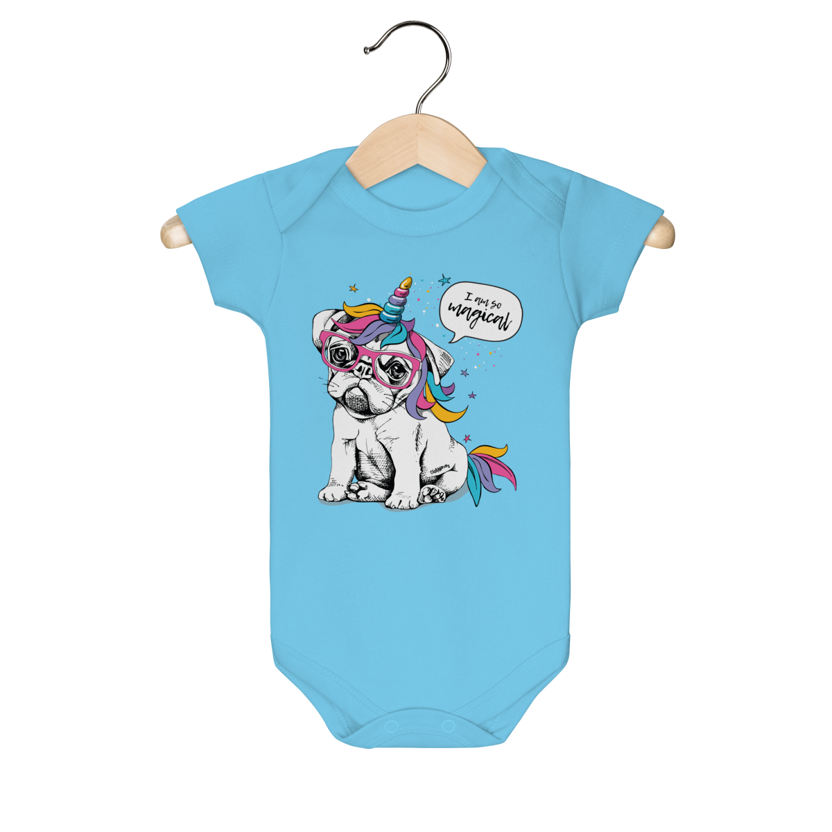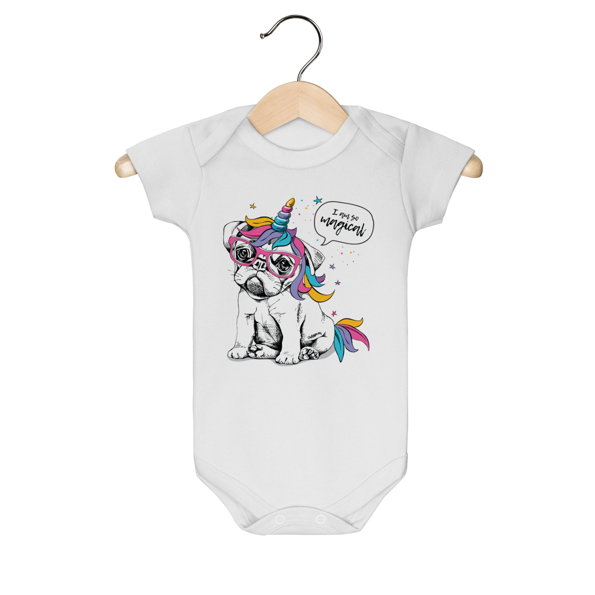 Body Bebê com estampa divertida de um cachorrinho usando óculos e um chifre de unicórnio, com crina e detalhes coloridos.