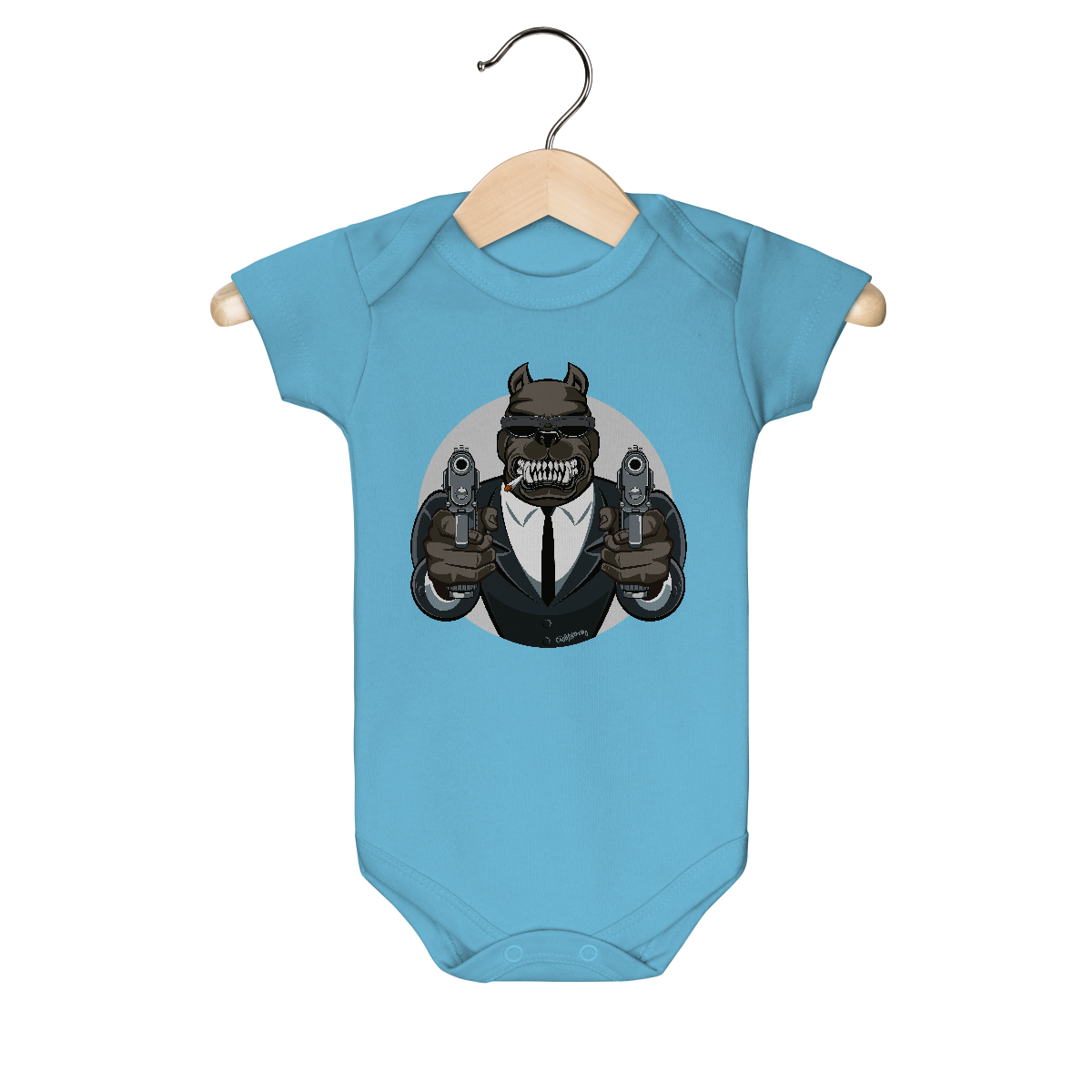 Estampa irada com um cachorro Pitbull segurando duas armas e fumando, bem no estilo mafioso.
