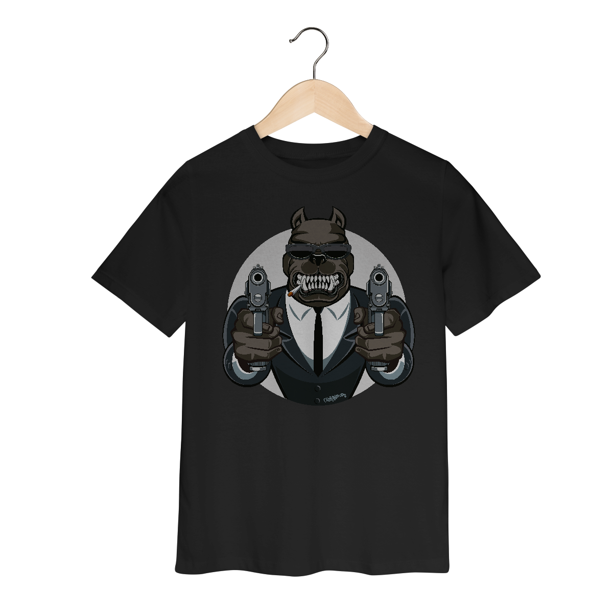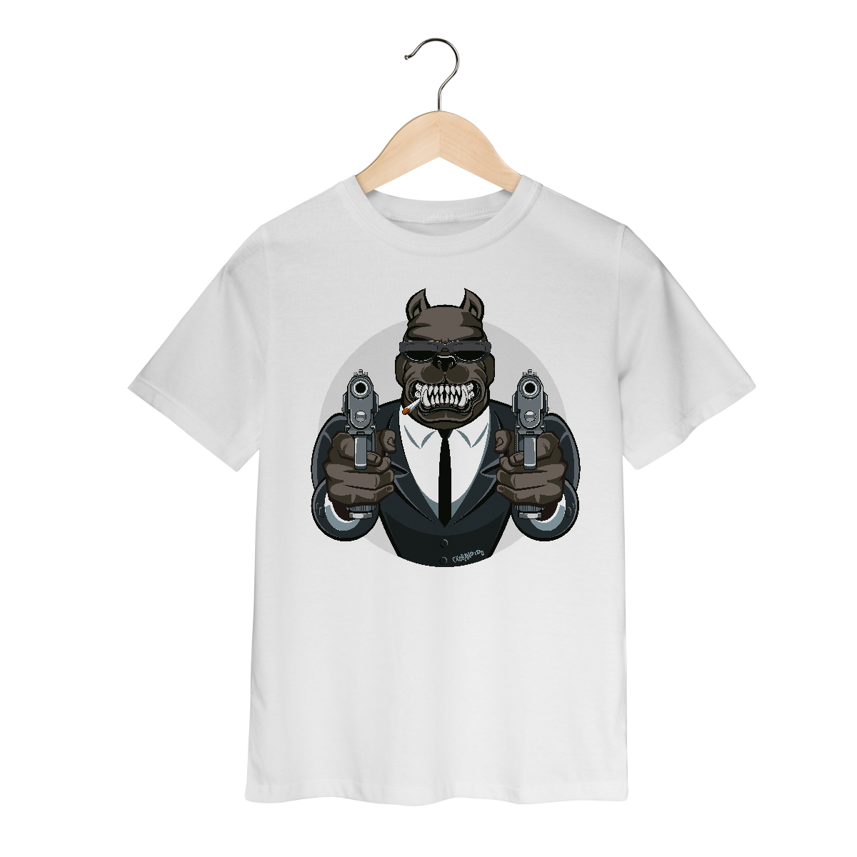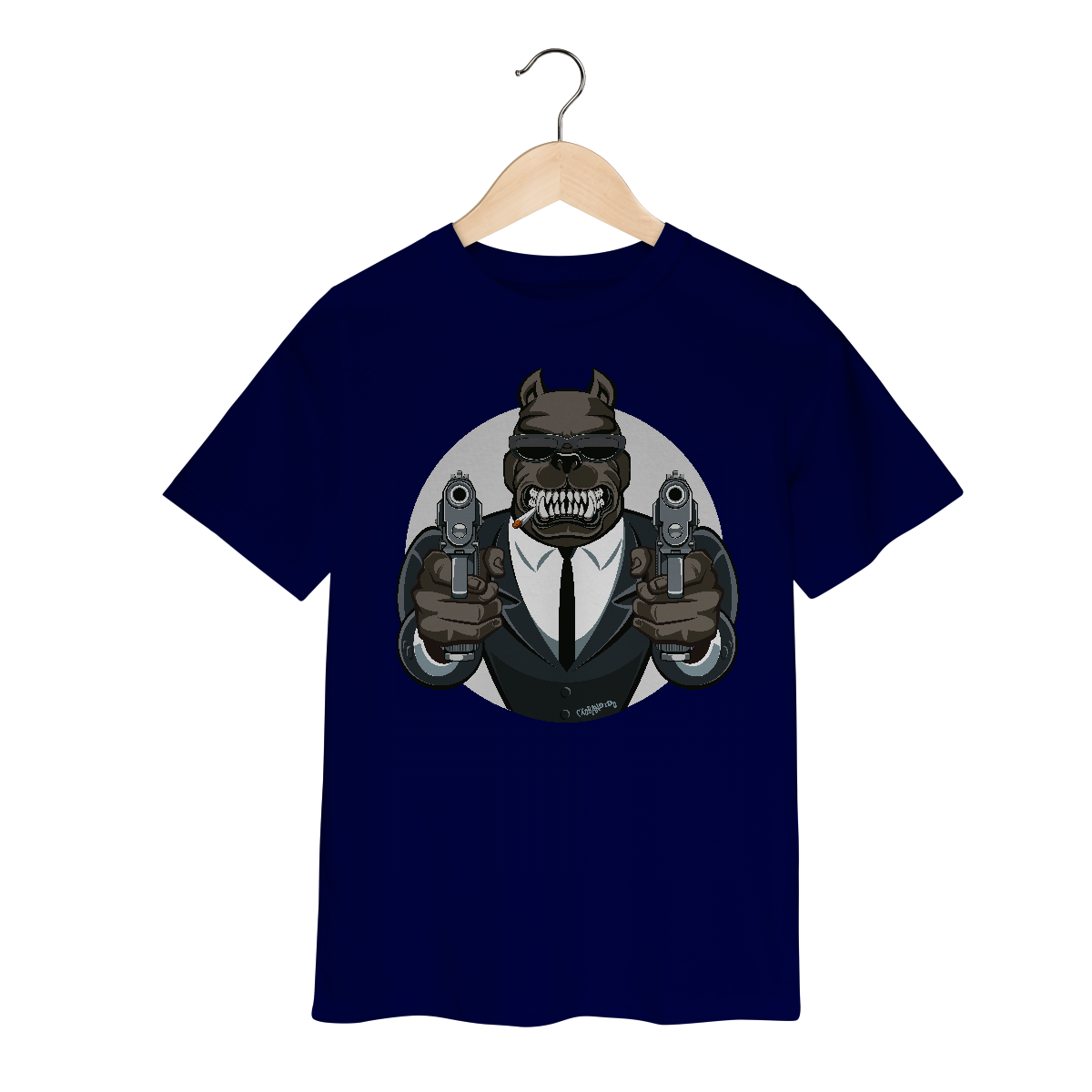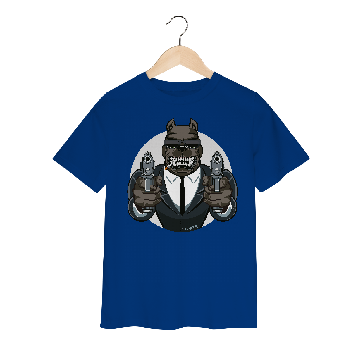 Estampa irada com um cachorro Pitbull segurando duas armas e fumando, bem no estilo mafioso.