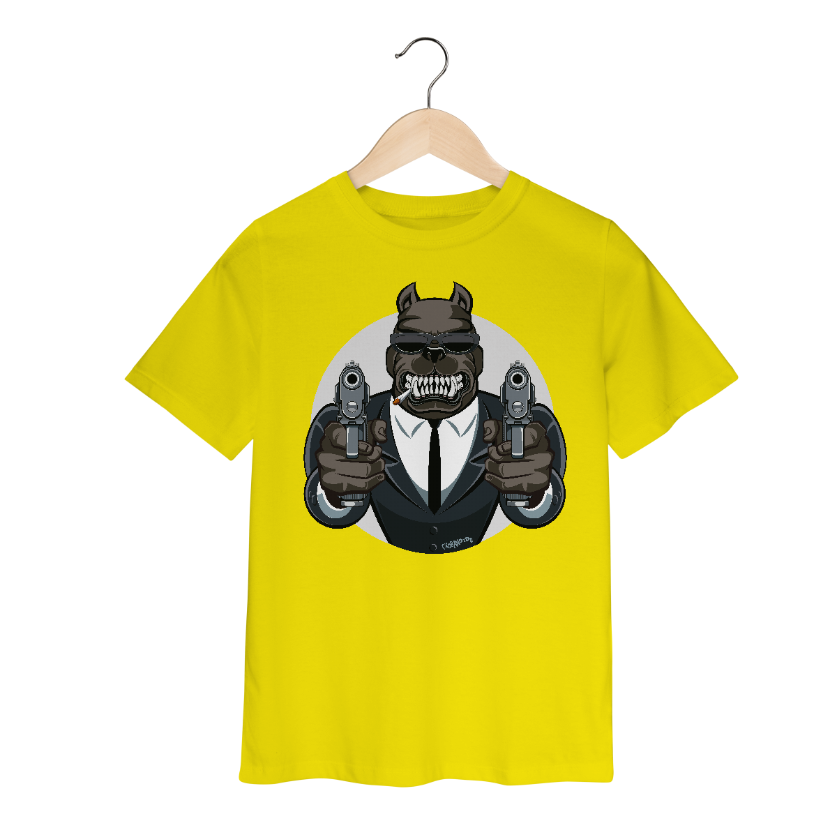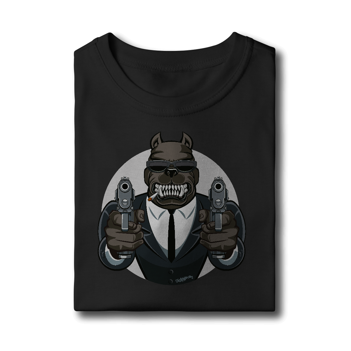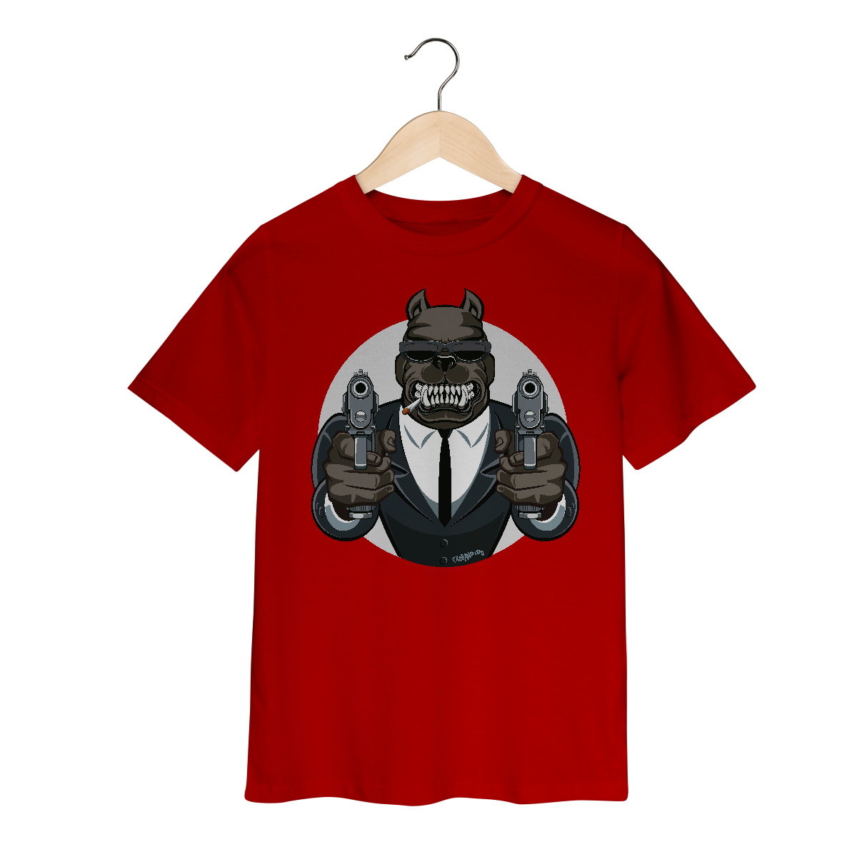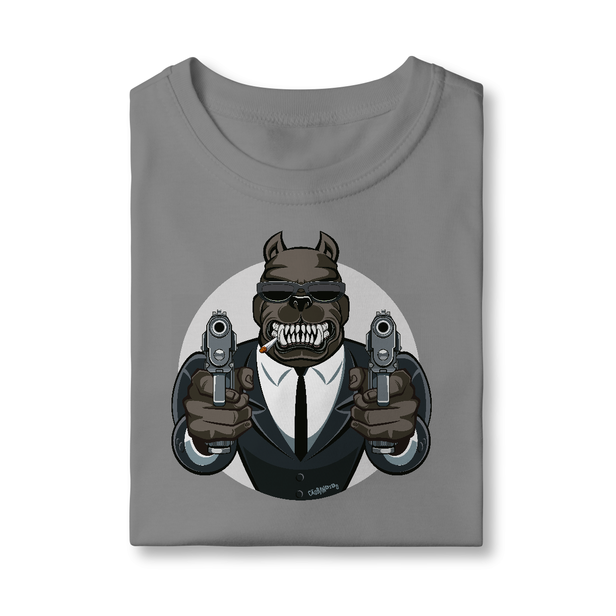 Estampa irada com um cachorro Pitbull segurando duas armas e fumando, bem no estilo mafioso.