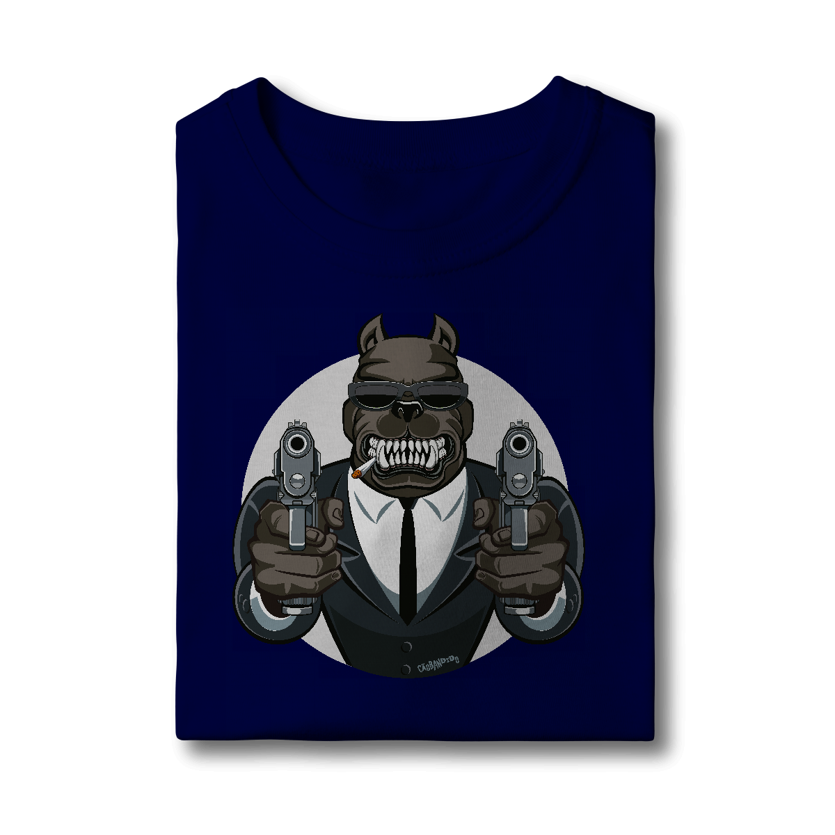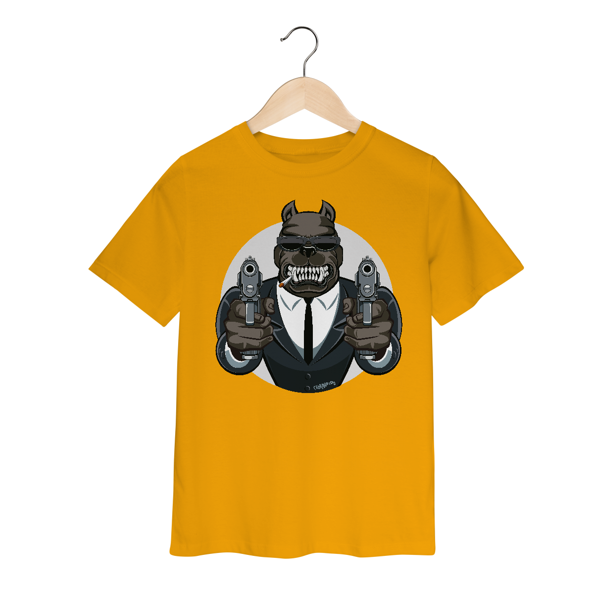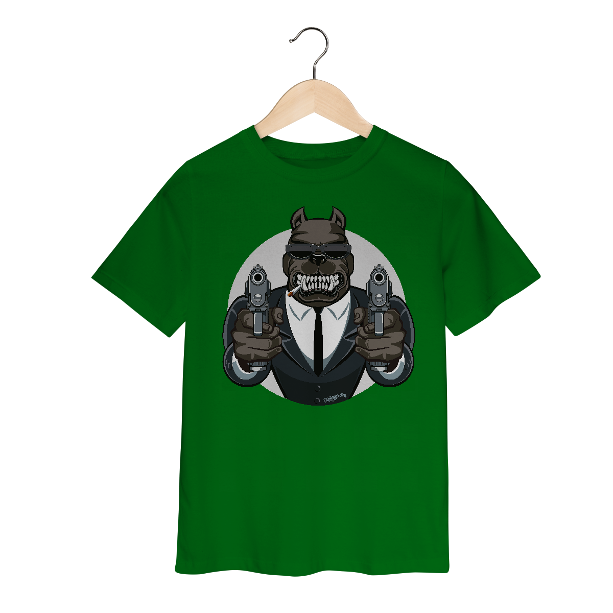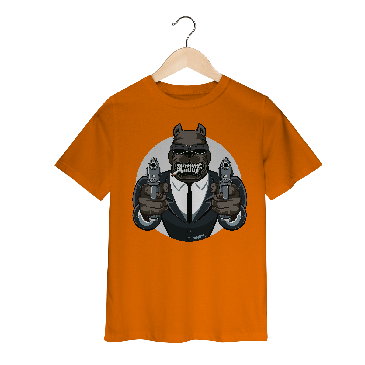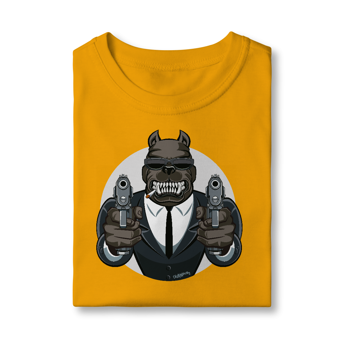 Estampa irada com um cachorro Pitbull segurando duas armas e fumando, bem no estilo mafioso.