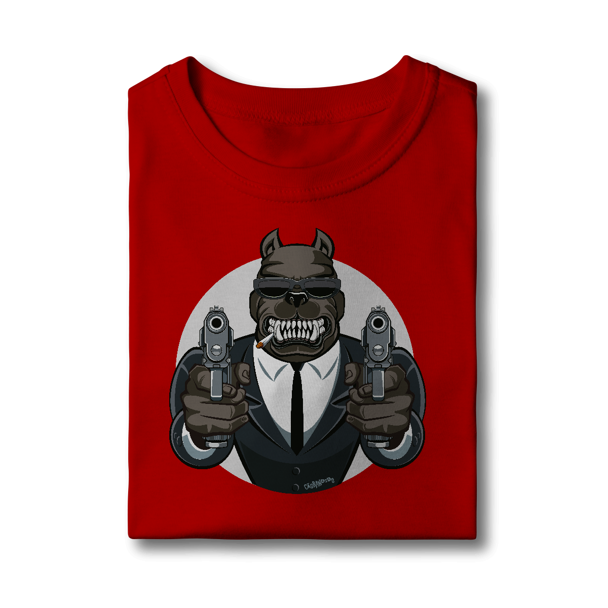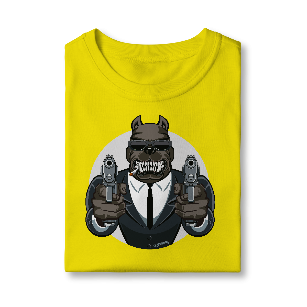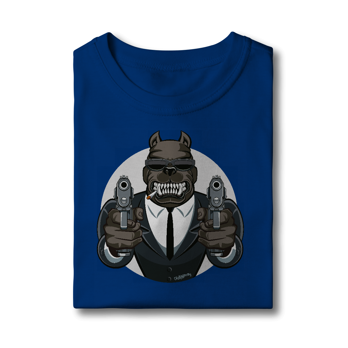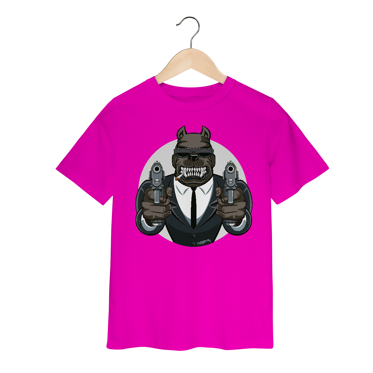 Estampa irada com um cachorro Pitbull segurando duas armas e fumando, bem no estilo mafioso.