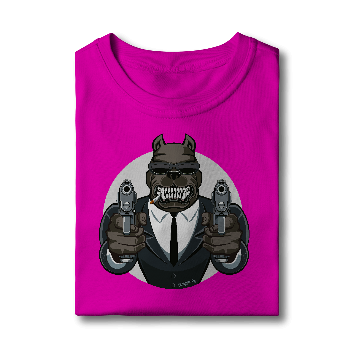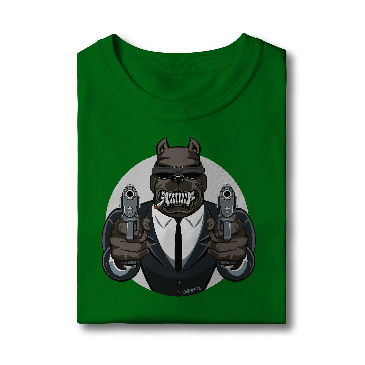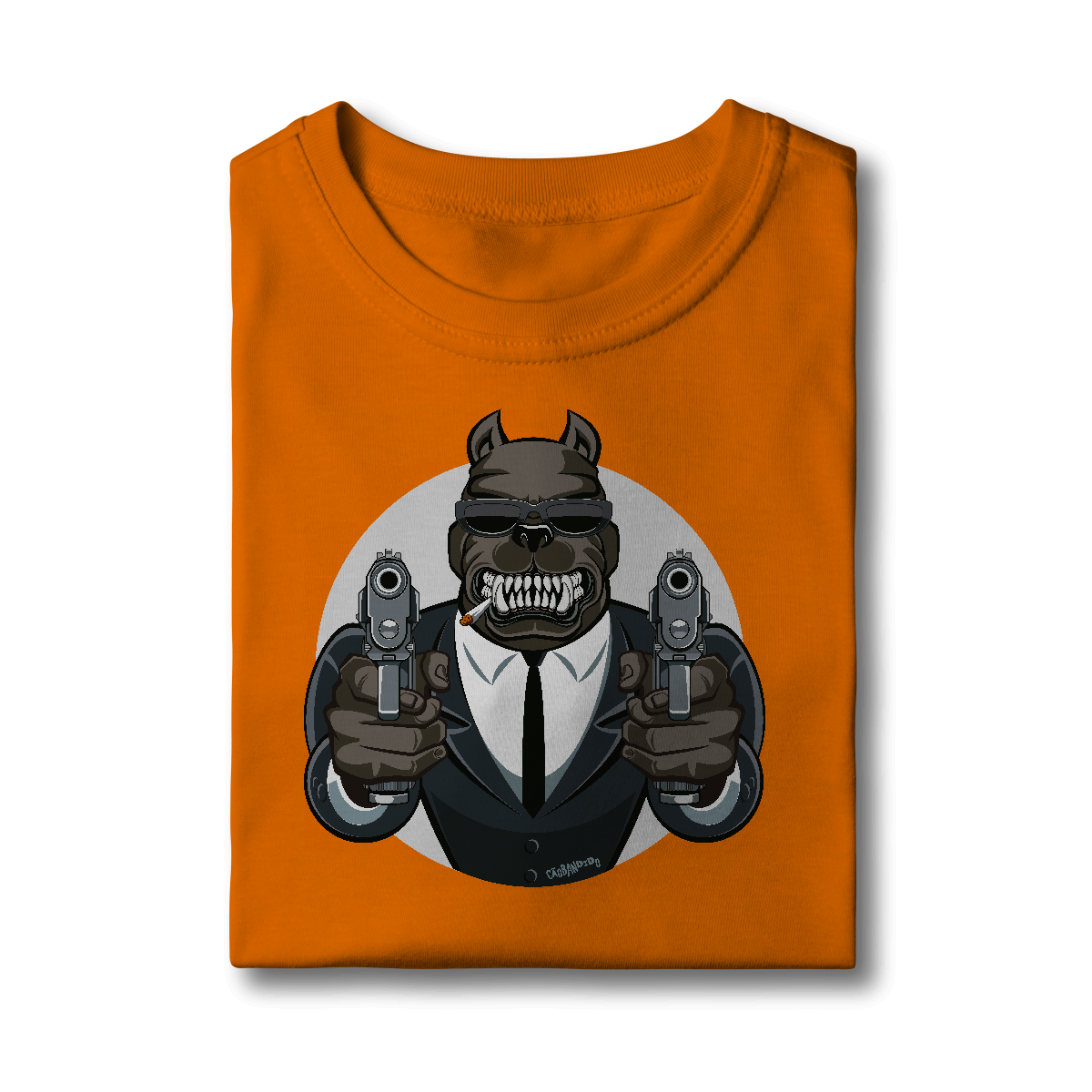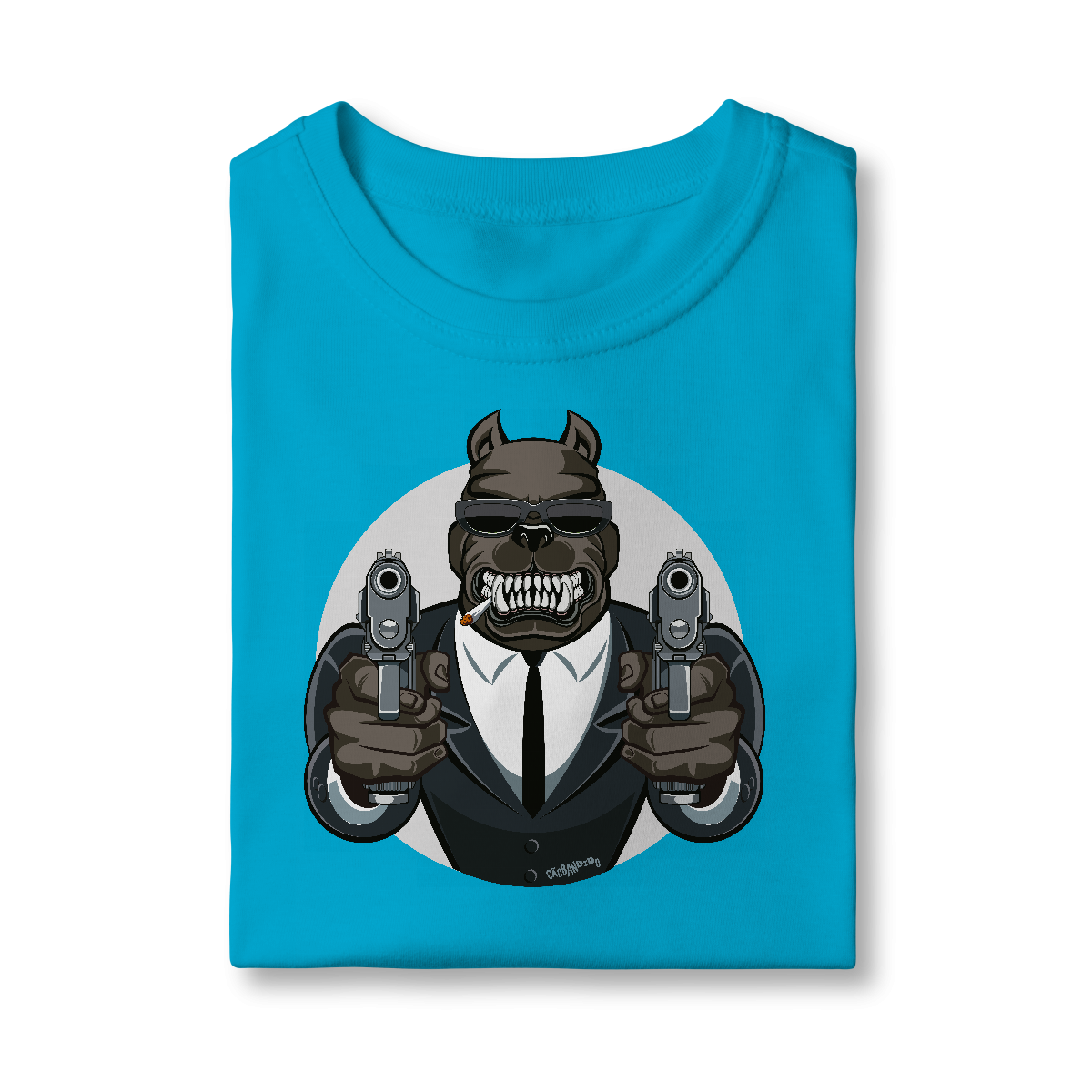 Estampa irada com um cachorro Pitbull segurando duas armas e fumando, bem no estilo mafioso.