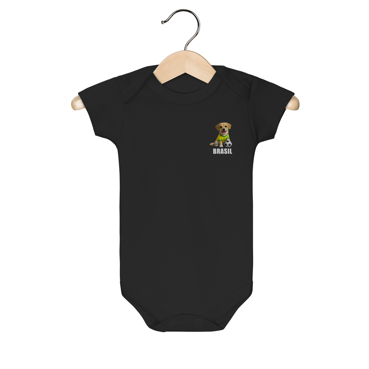 Este body bebê traz uma estampa super fofa e divertida no peito: um cachorrinho estilizado com camisa verde e amarela, apoiado em uma bola de futebol, com a palavra BRASIL em destaque.