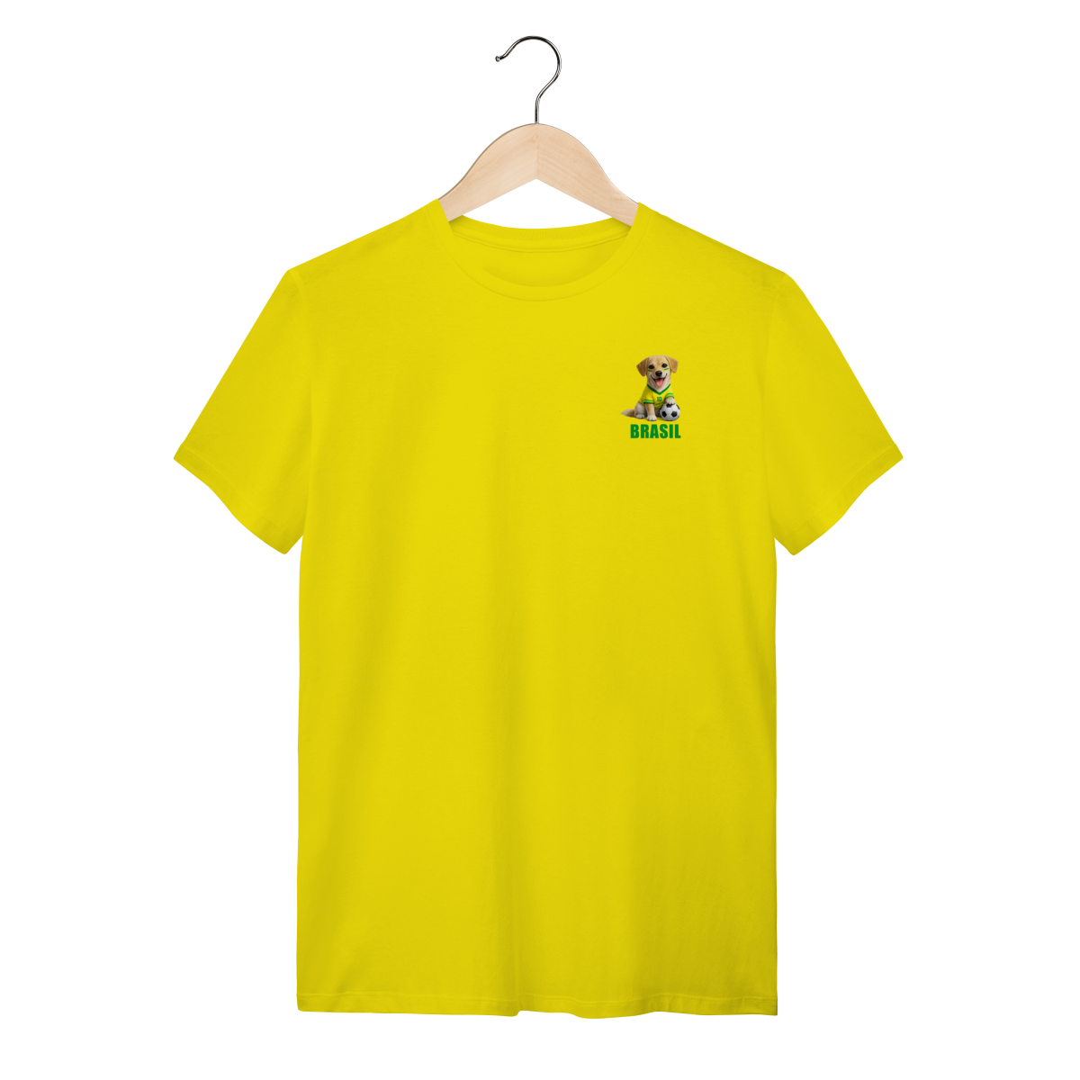 Esta camiseta traz uma estampa super fofa e divertida no peito: um cachorrinho estilizado com camisa verde e amarela, apoiado em uma bola de futebol, com a palavra BRASIL em destaque.
