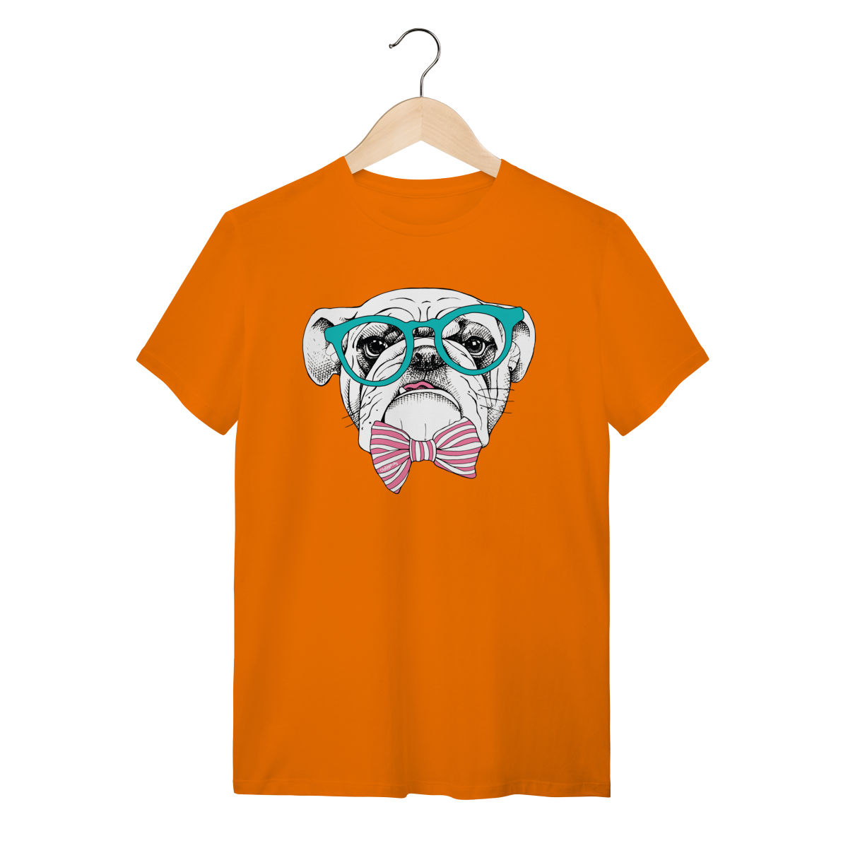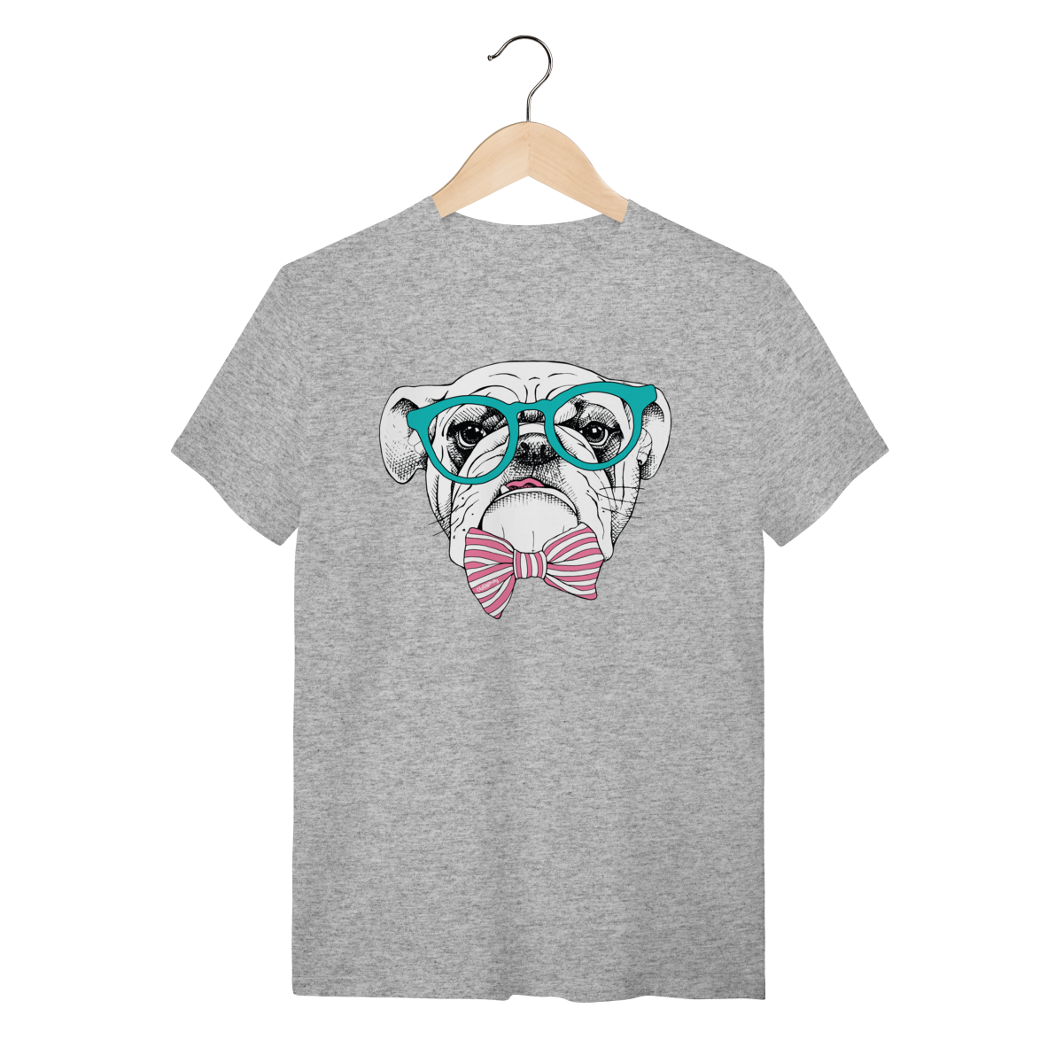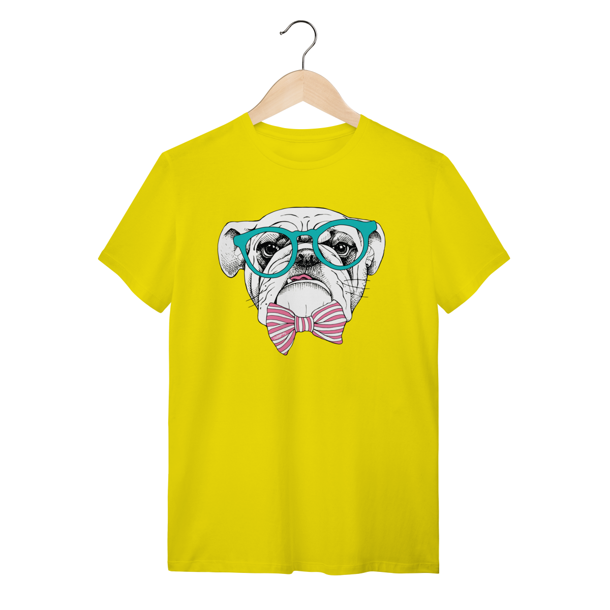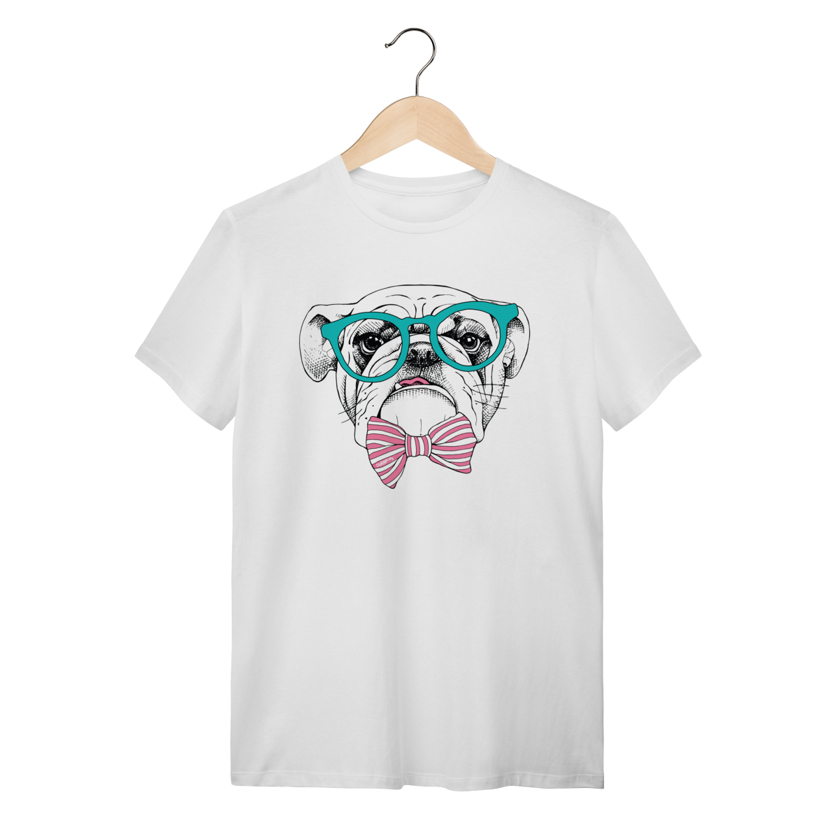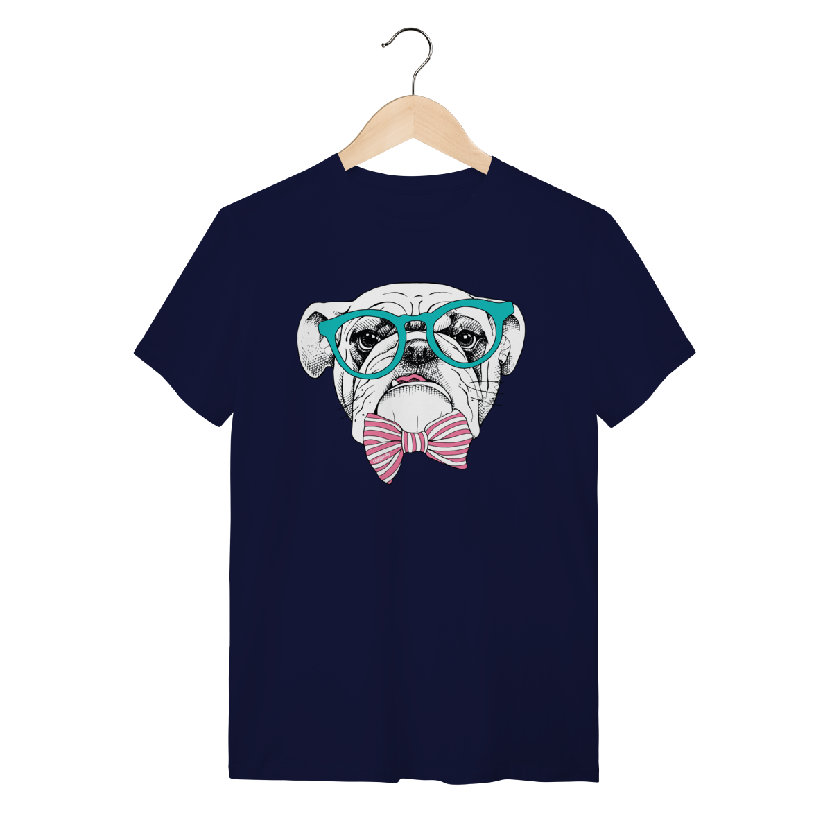 Para quem ama cachorro e também curte um visual cheio de personalidade. Estampa super charmosa de um bulldog inglês com óculos e gravata borboleta listrada, em um estilo moderno, divertido e elegante ao mesmo tempo.
