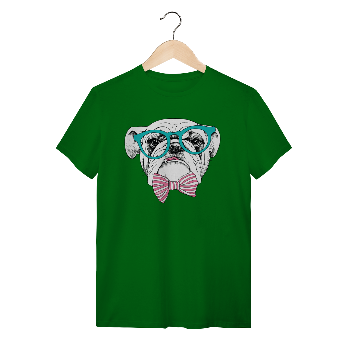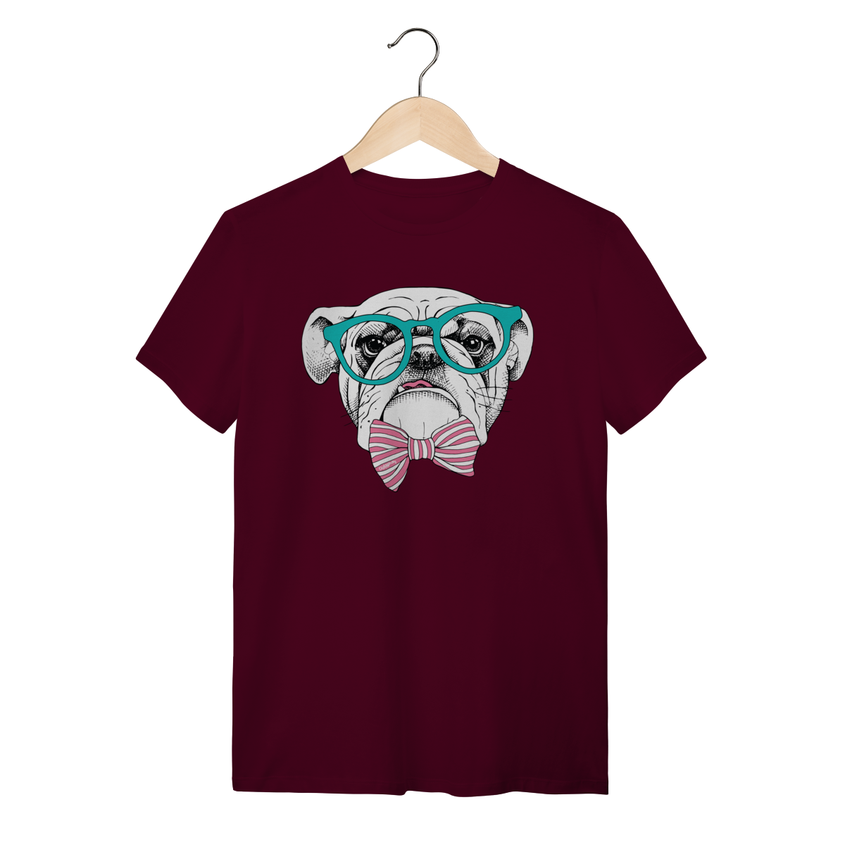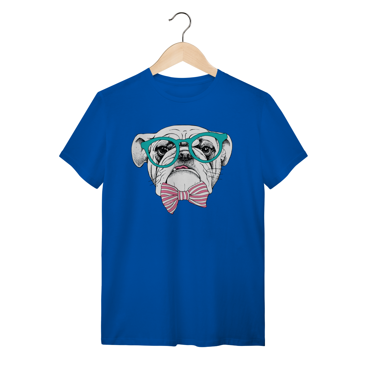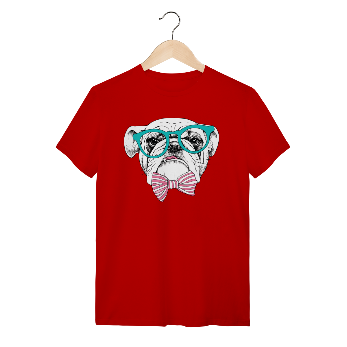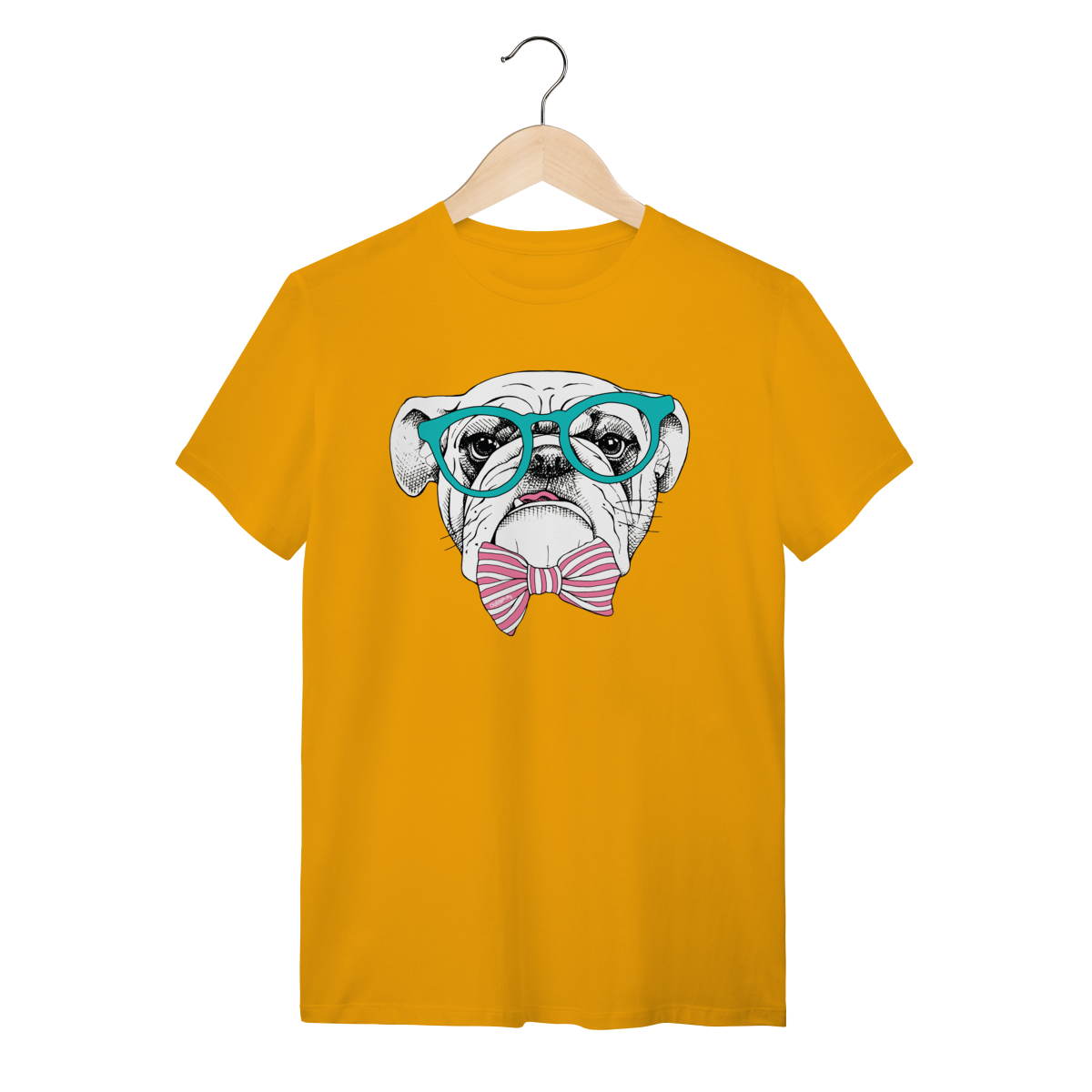 Para quem ama cachorro e também curte um visual cheio de personalidade. Estampa super charmosa de um bulldog inglês com óculos e gravata borboleta listrada, em um estilo moderno, divertido e elegante ao mesmo tempo.