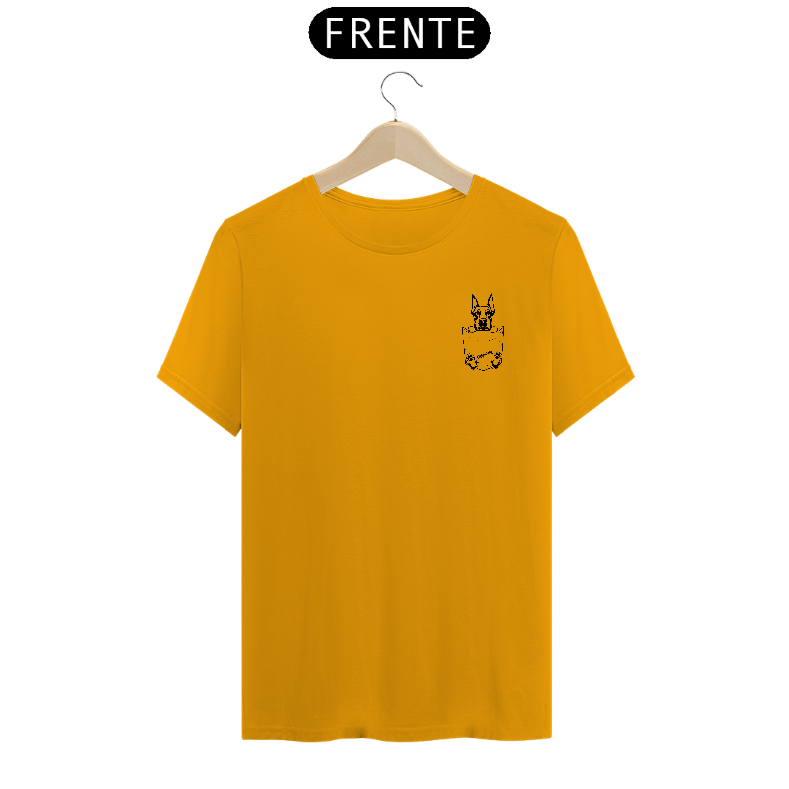 Estampa super criativa, carregando um filhotinho de Doberman no bolso bem na altura do peito.