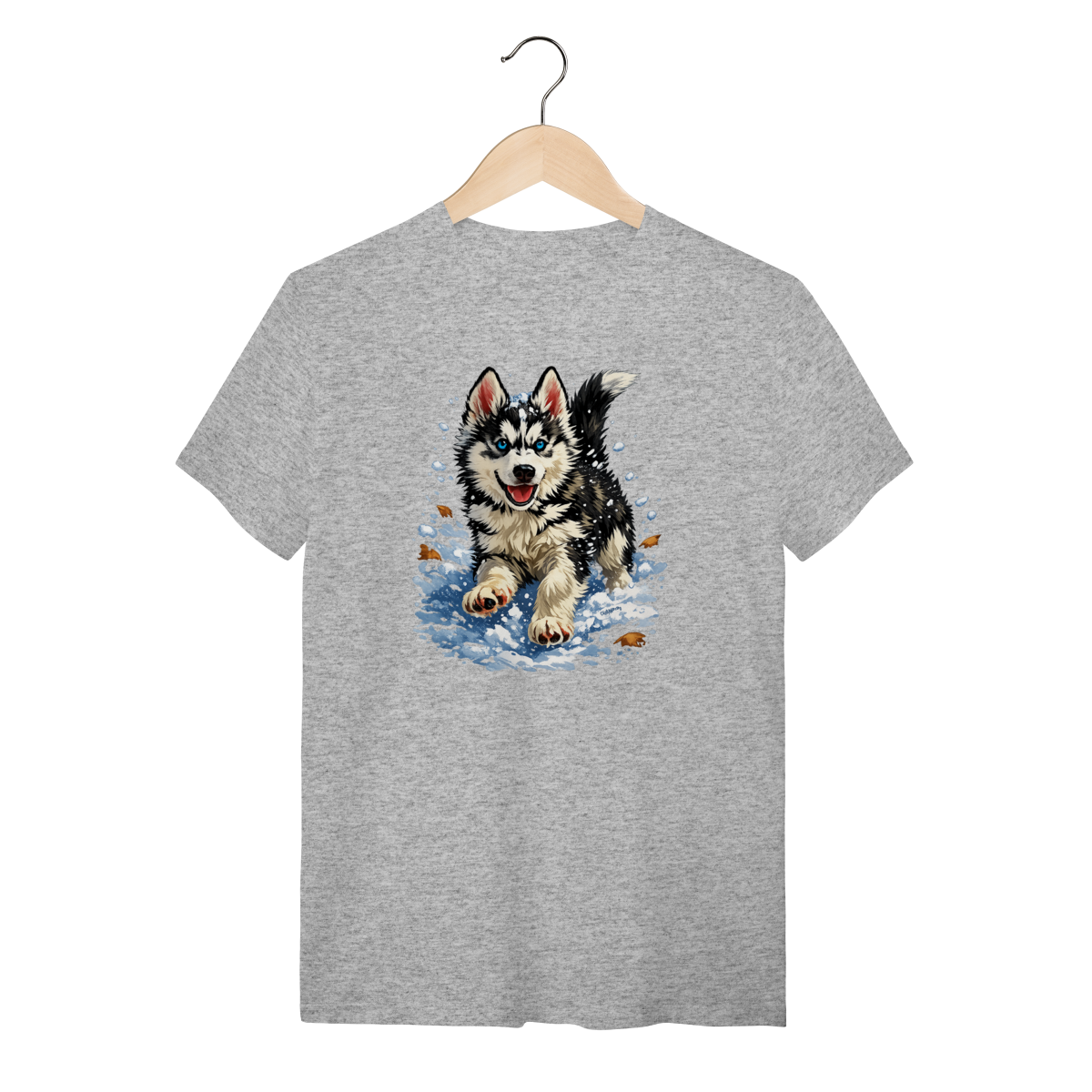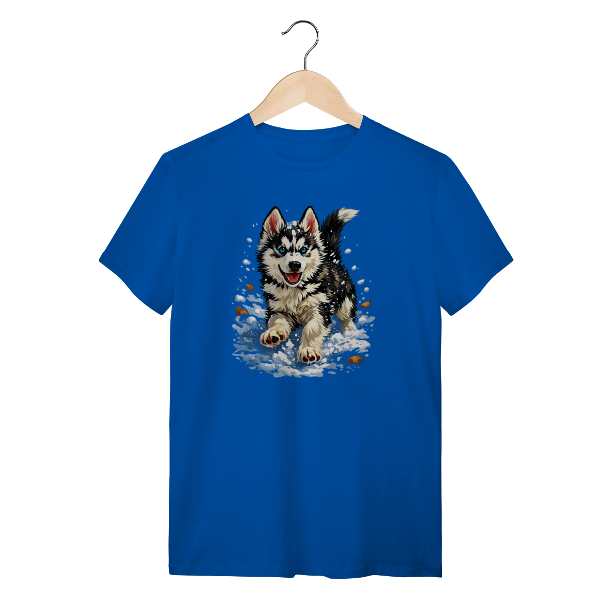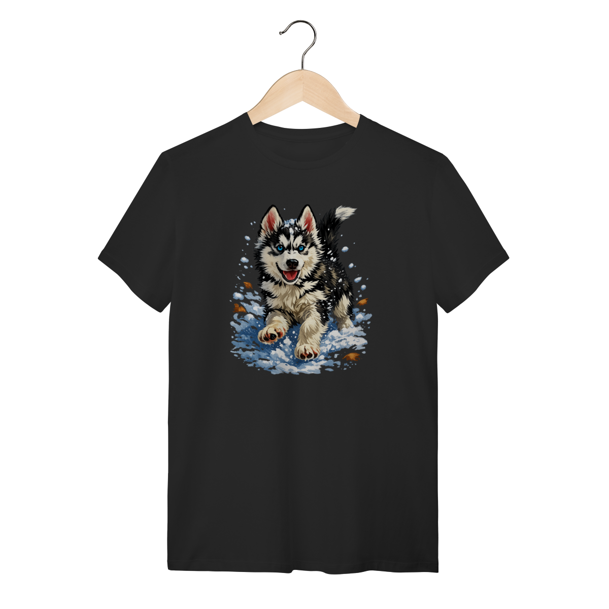 Filhote de Husky siberiano em modo diversão total: correndo na neve com aquela cara de “bora brincar!” e energia lá em cima.
