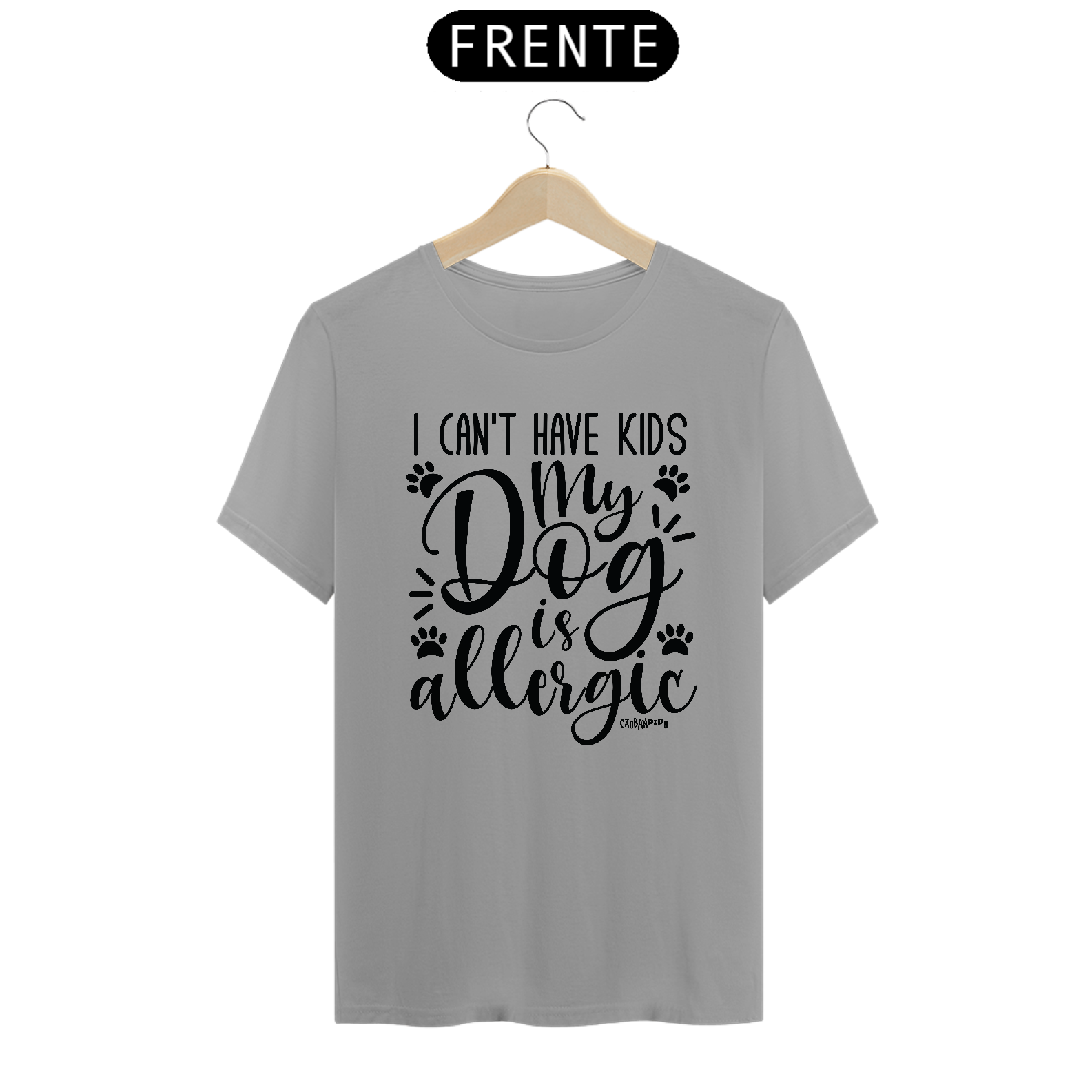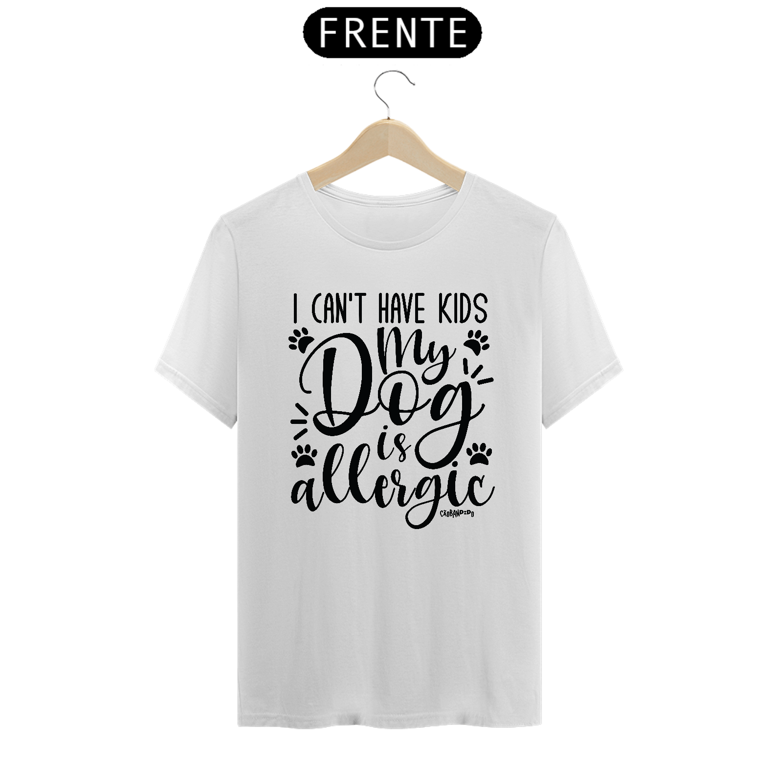 Estampa bem humorada com a frase: "Não posso ter filhos, meu cachorro é alérgico".
