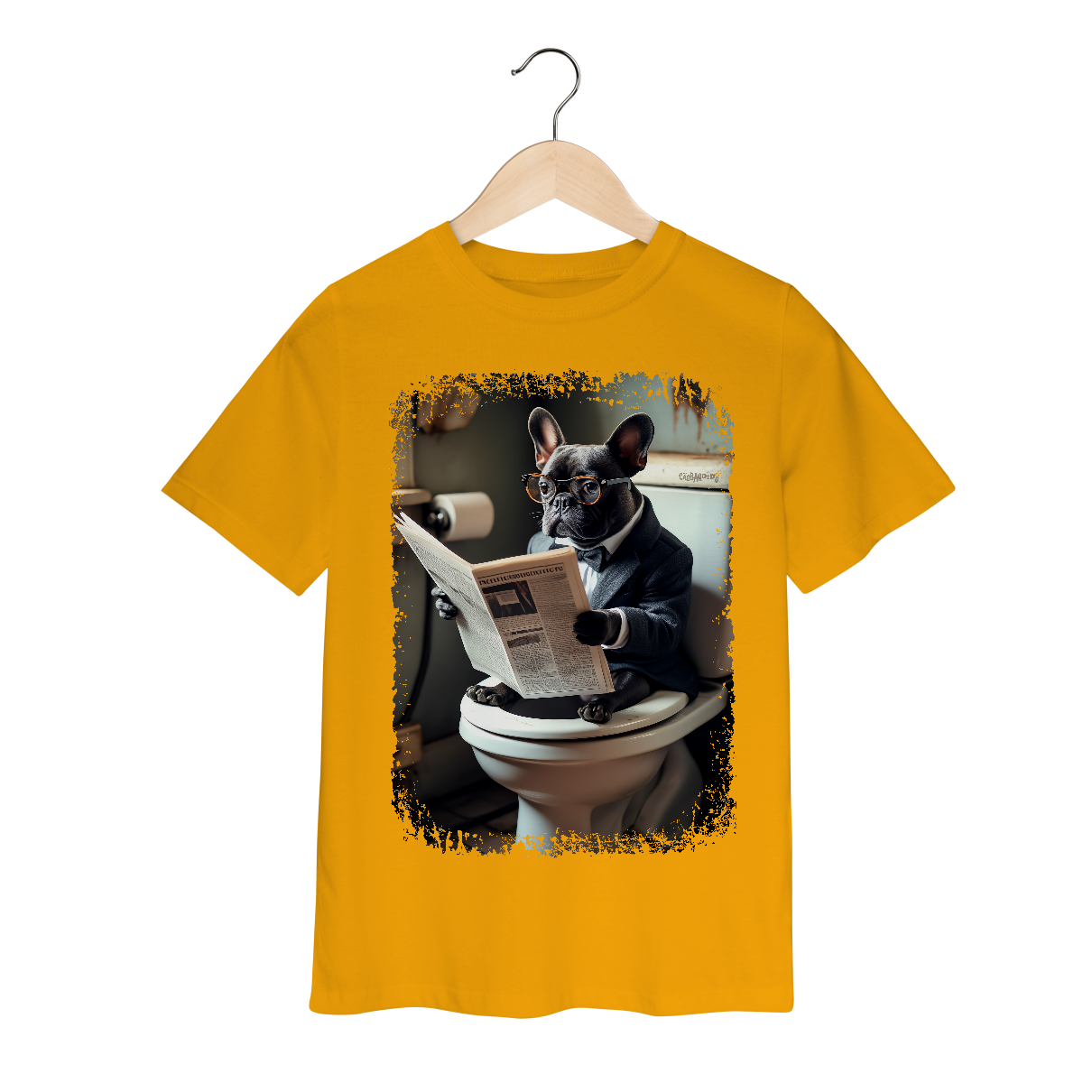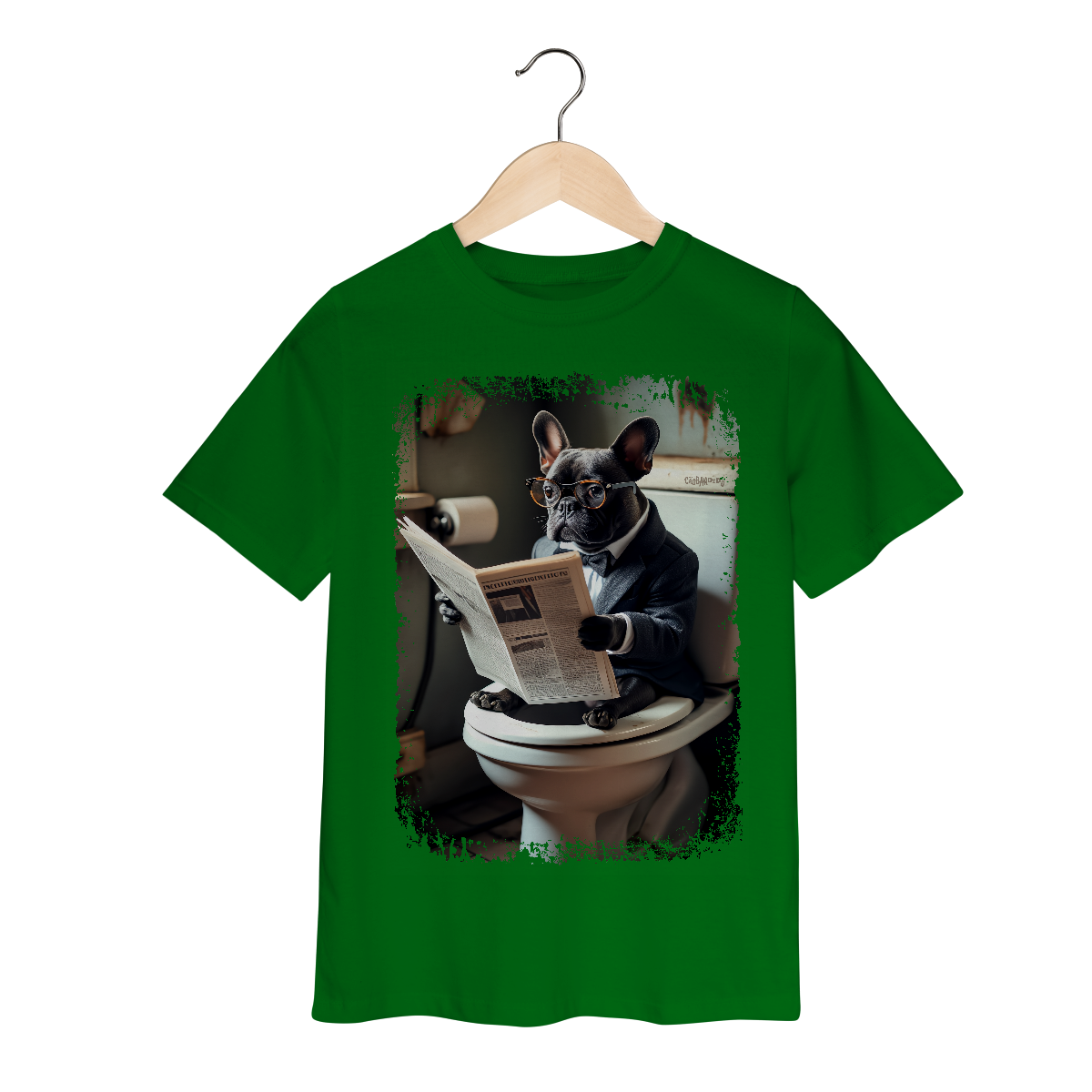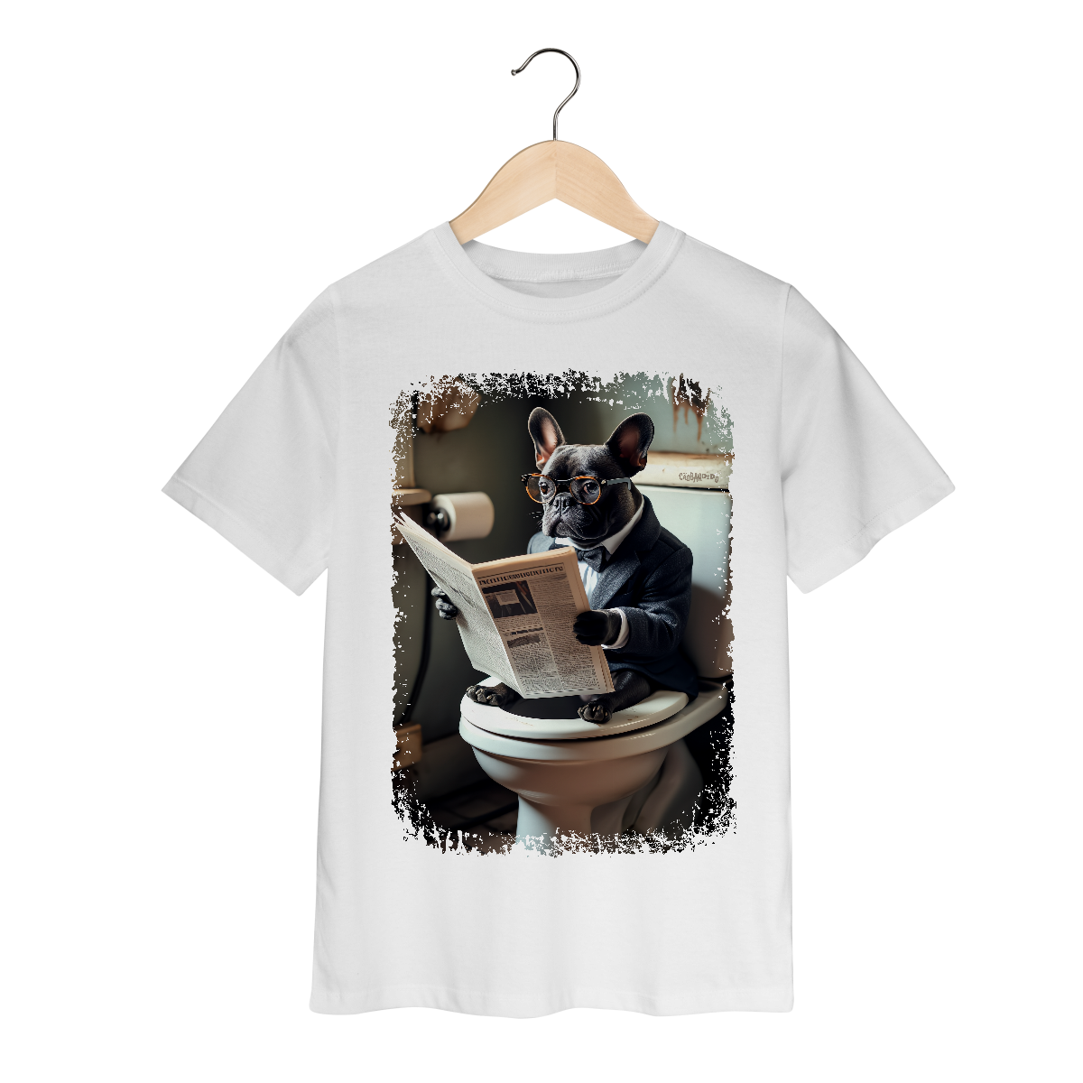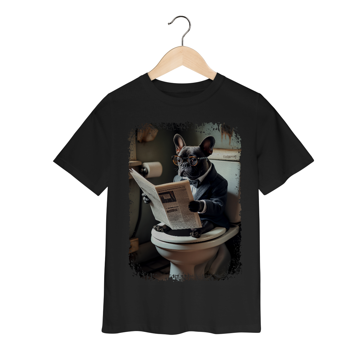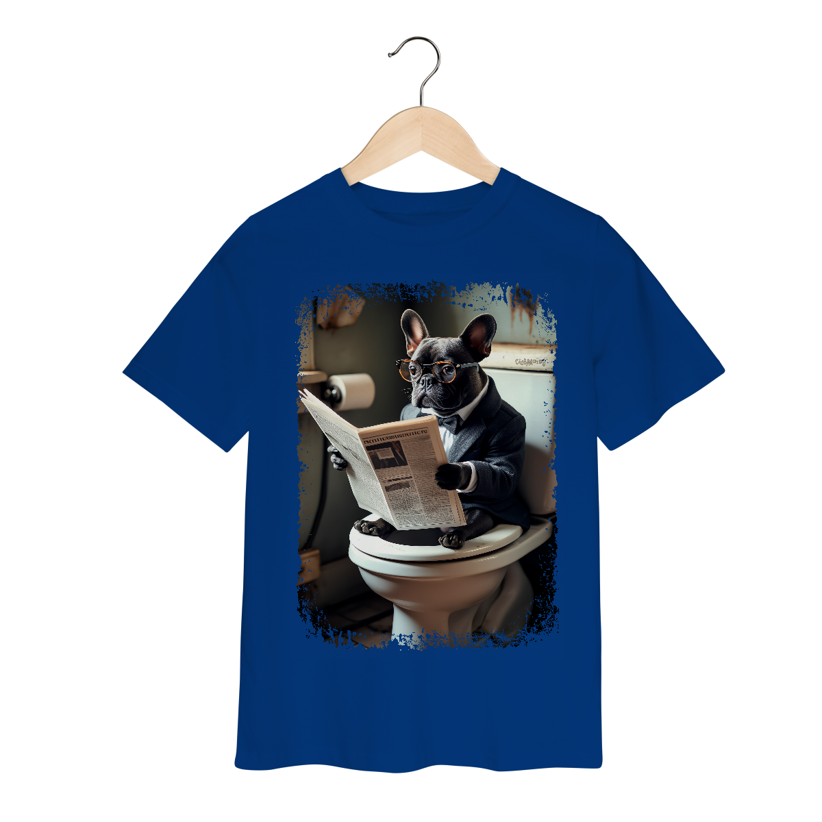 Camiseta Infantil com Buldogue Francês no banheiro, ele está sentado na privada e lendo jornal.