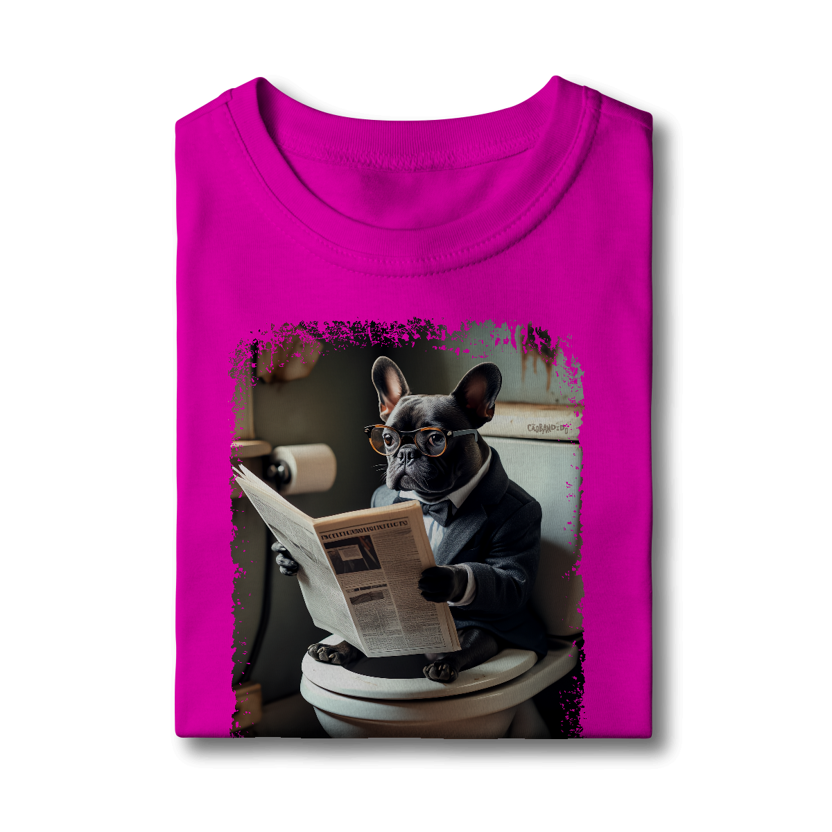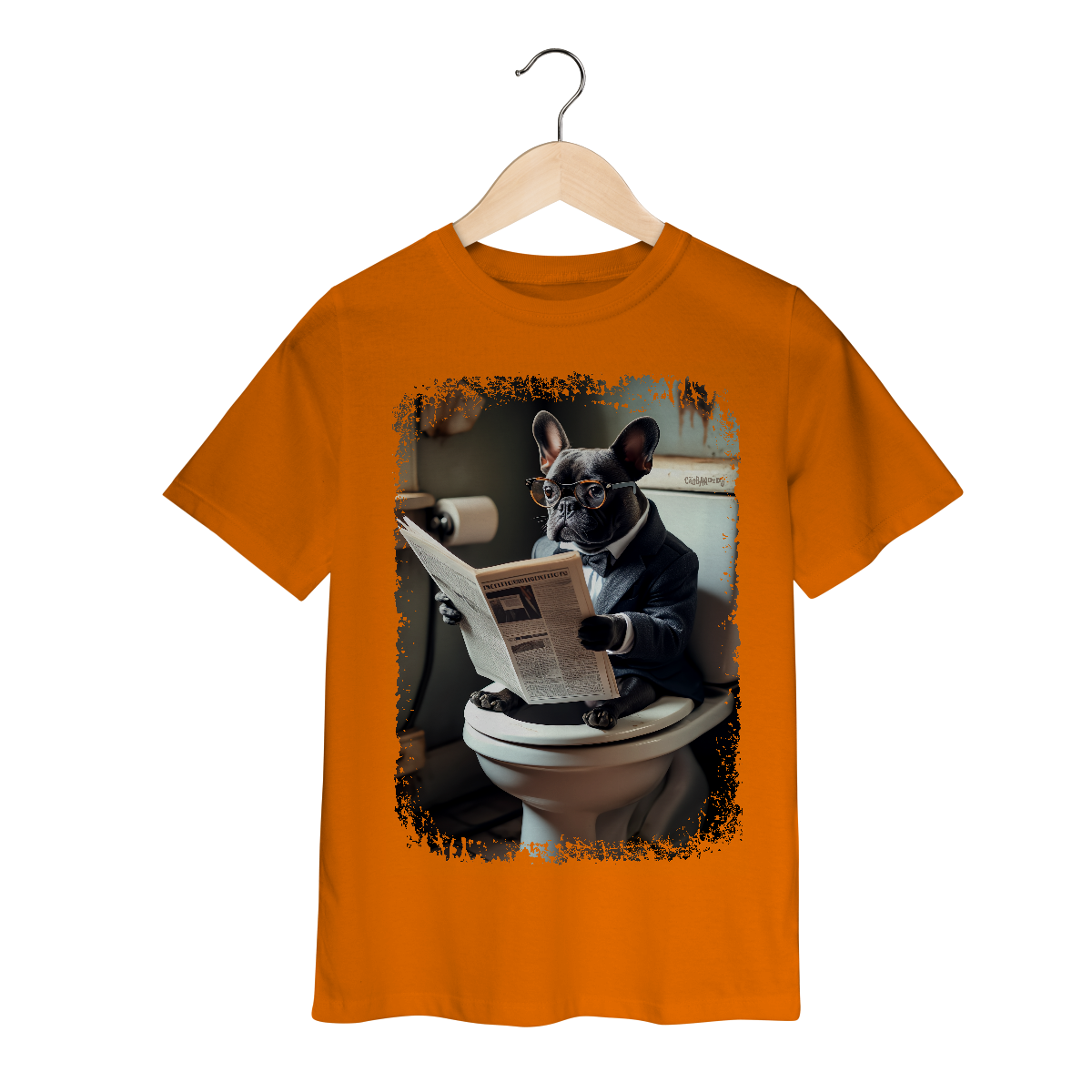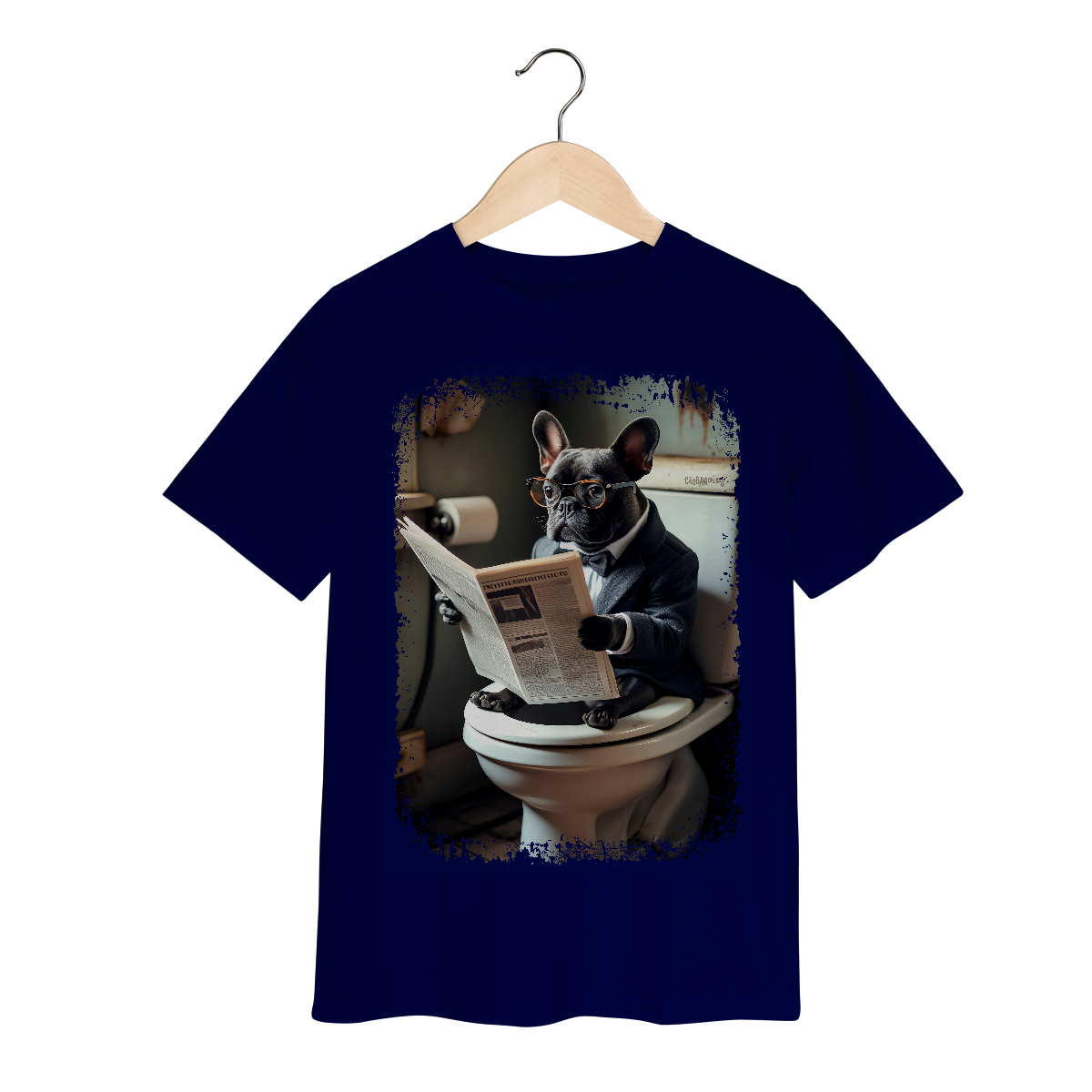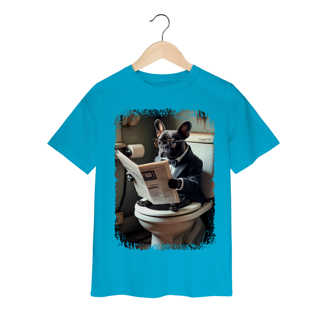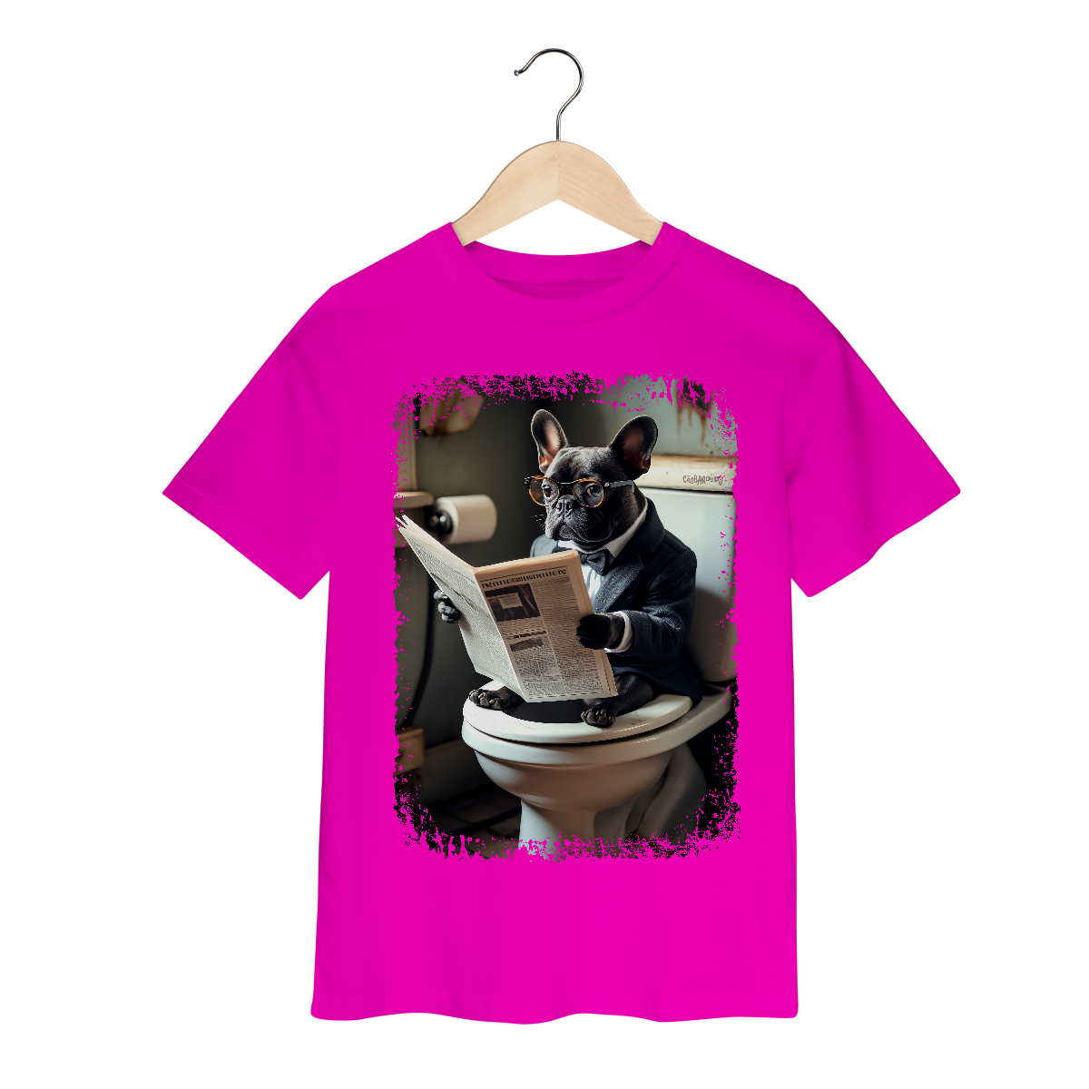 Camiseta Infantil com Buldogue Francês no banheiro, ele está sentado na privada e lendo jornal.