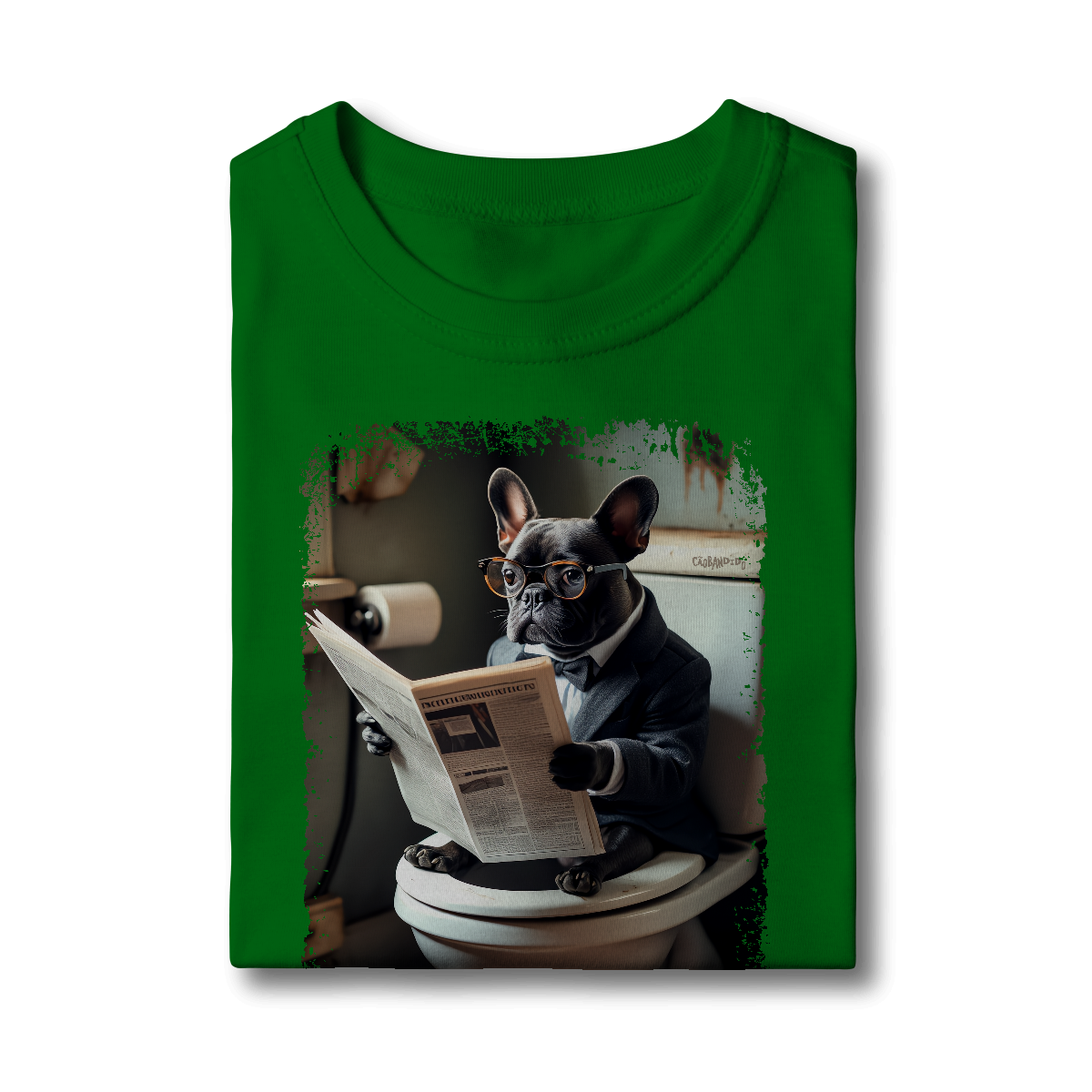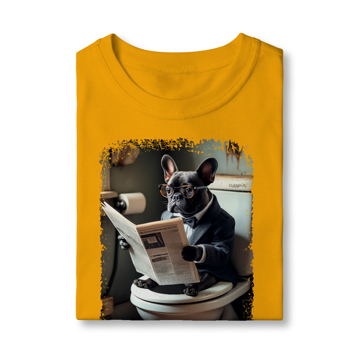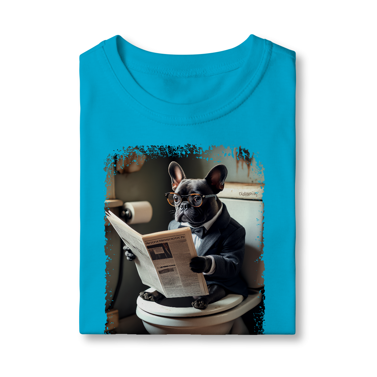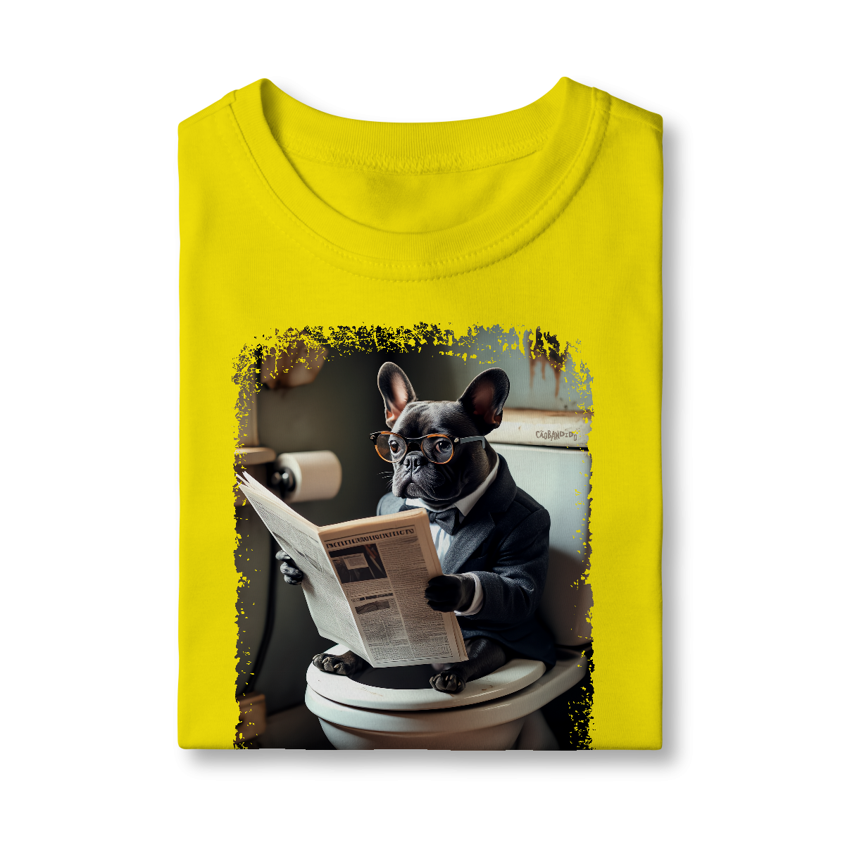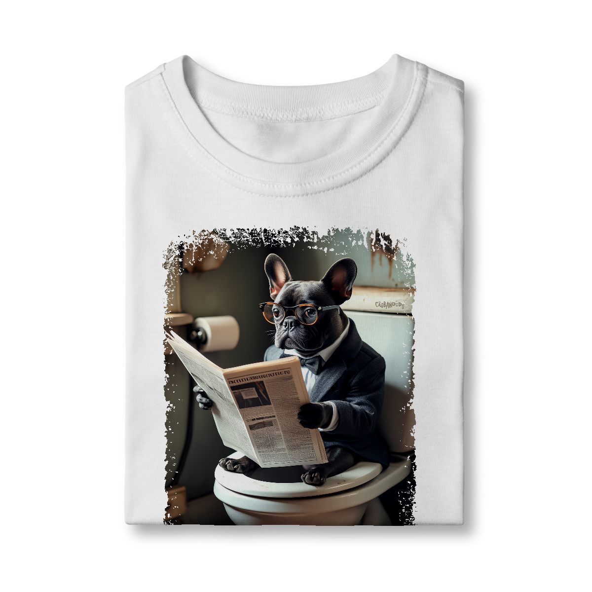 Camiseta Infantil com Buldogue Francês no banheiro, ele está sentado na privada e lendo jornal.