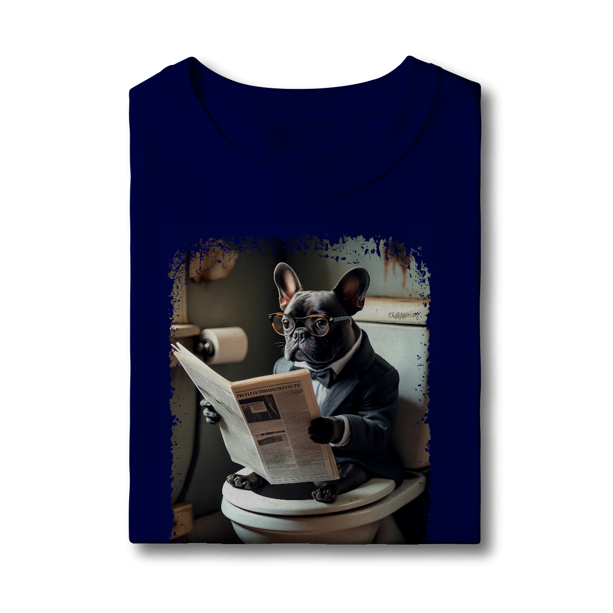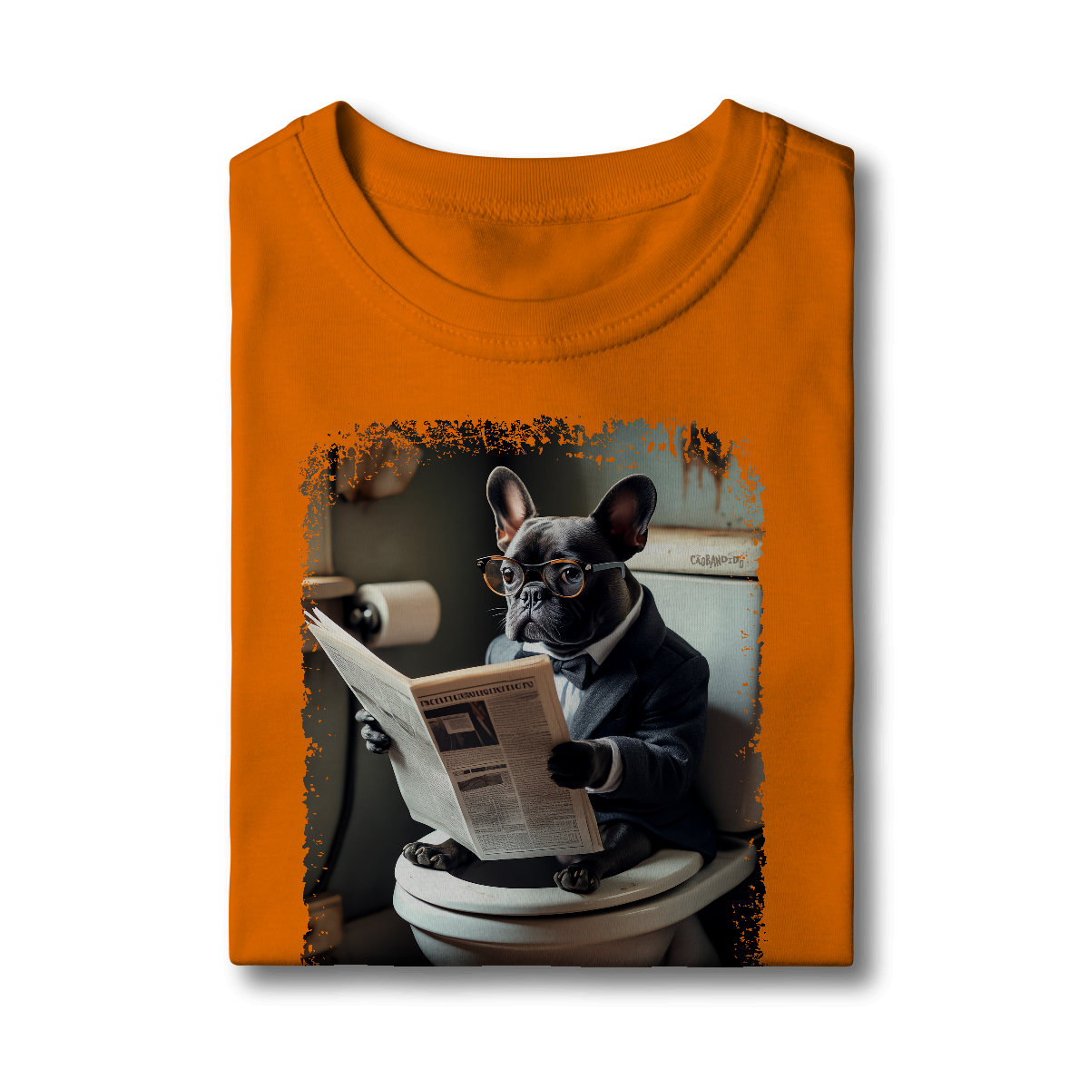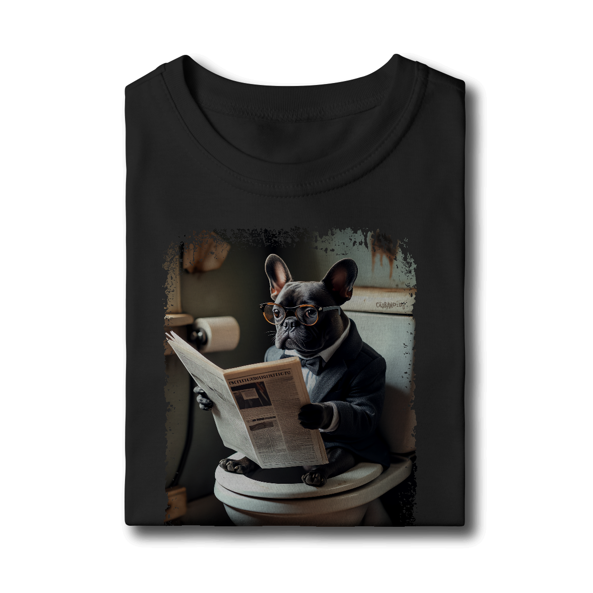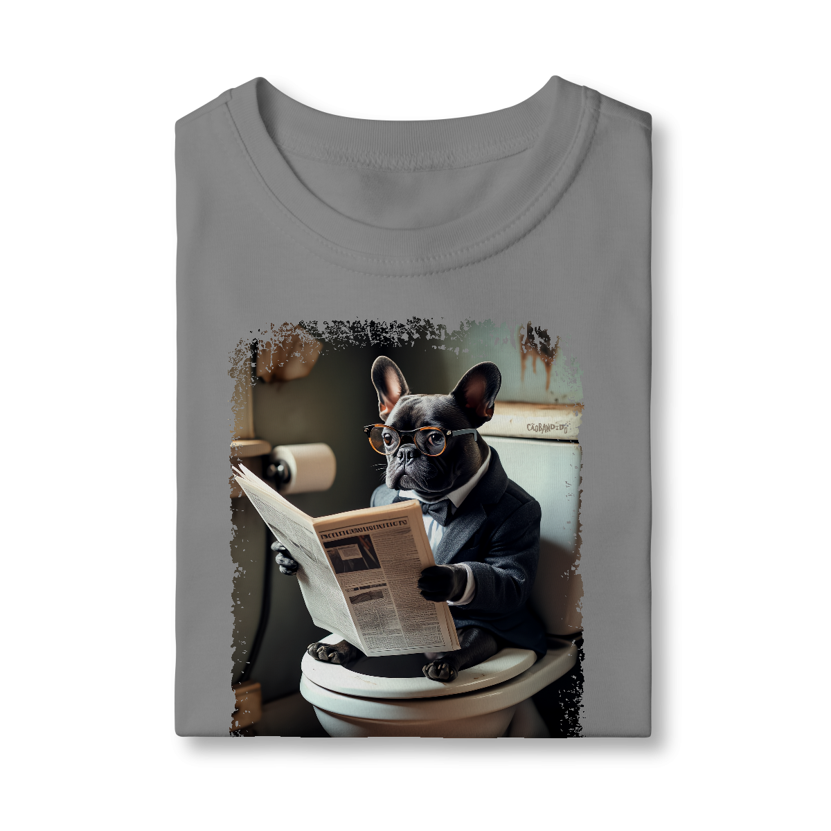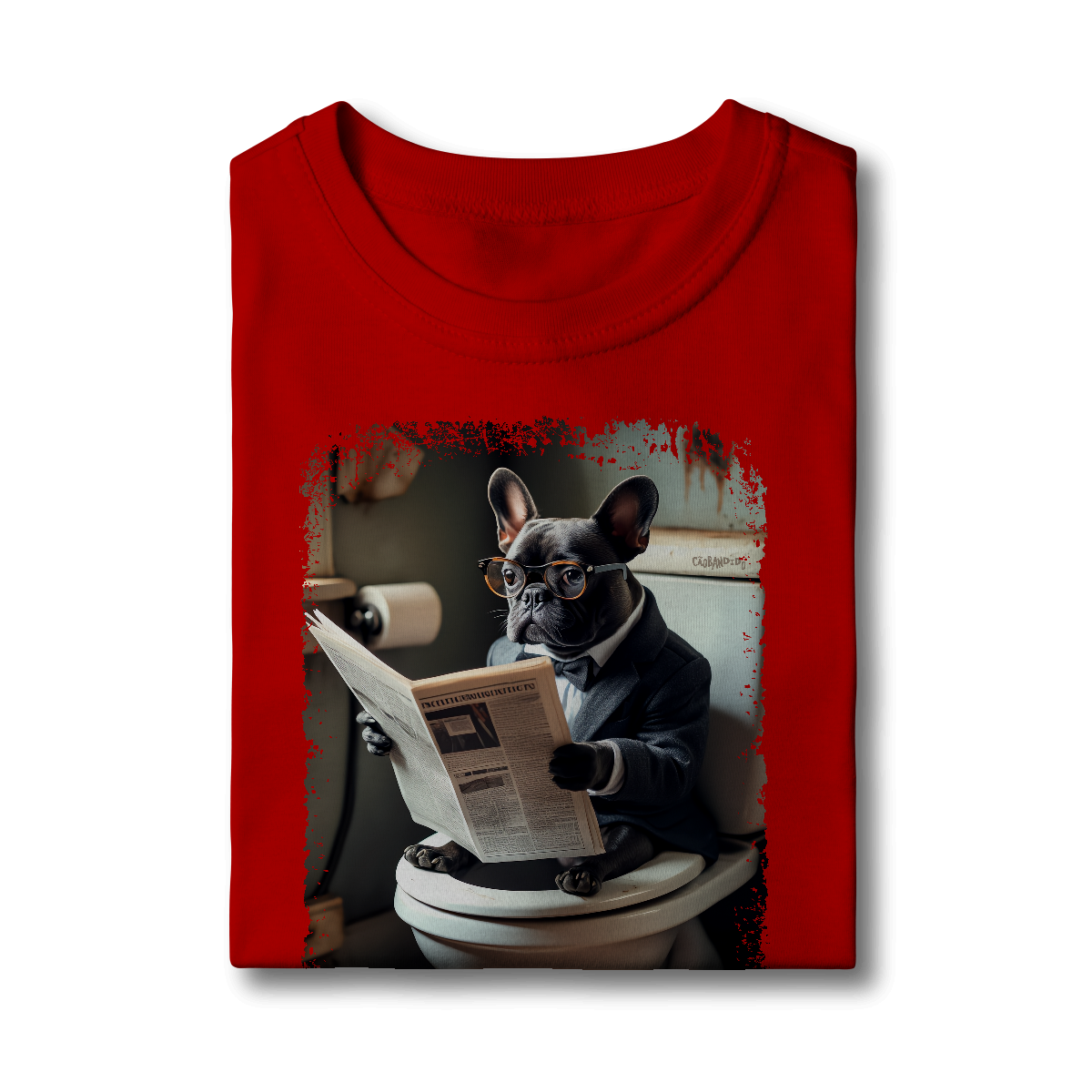 Camiseta Infantil com Buldogue Francês no banheiro, ele está sentado na privada e lendo jornal.