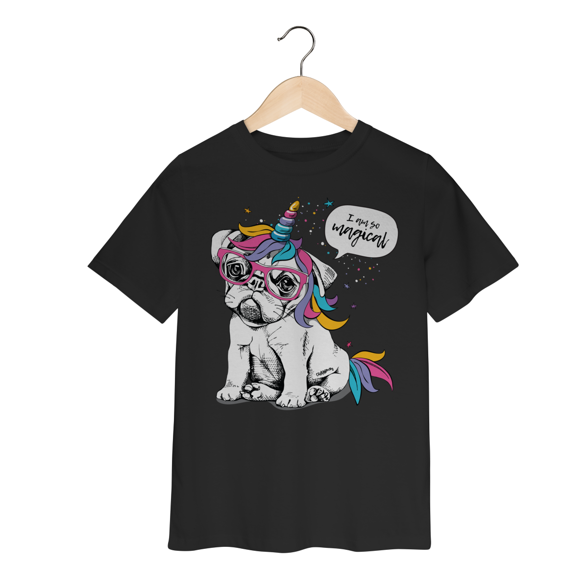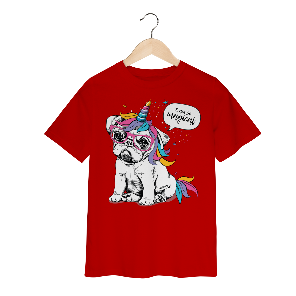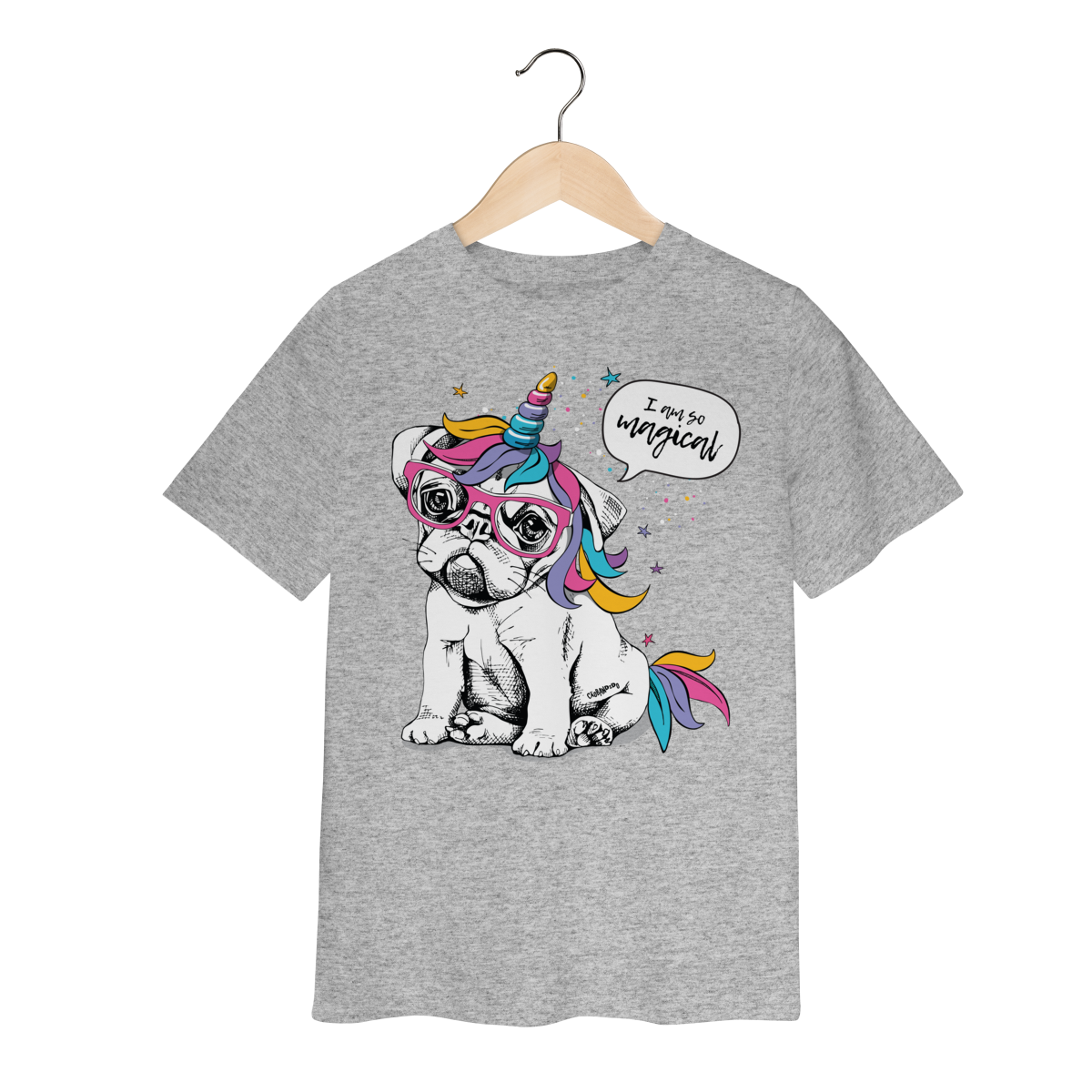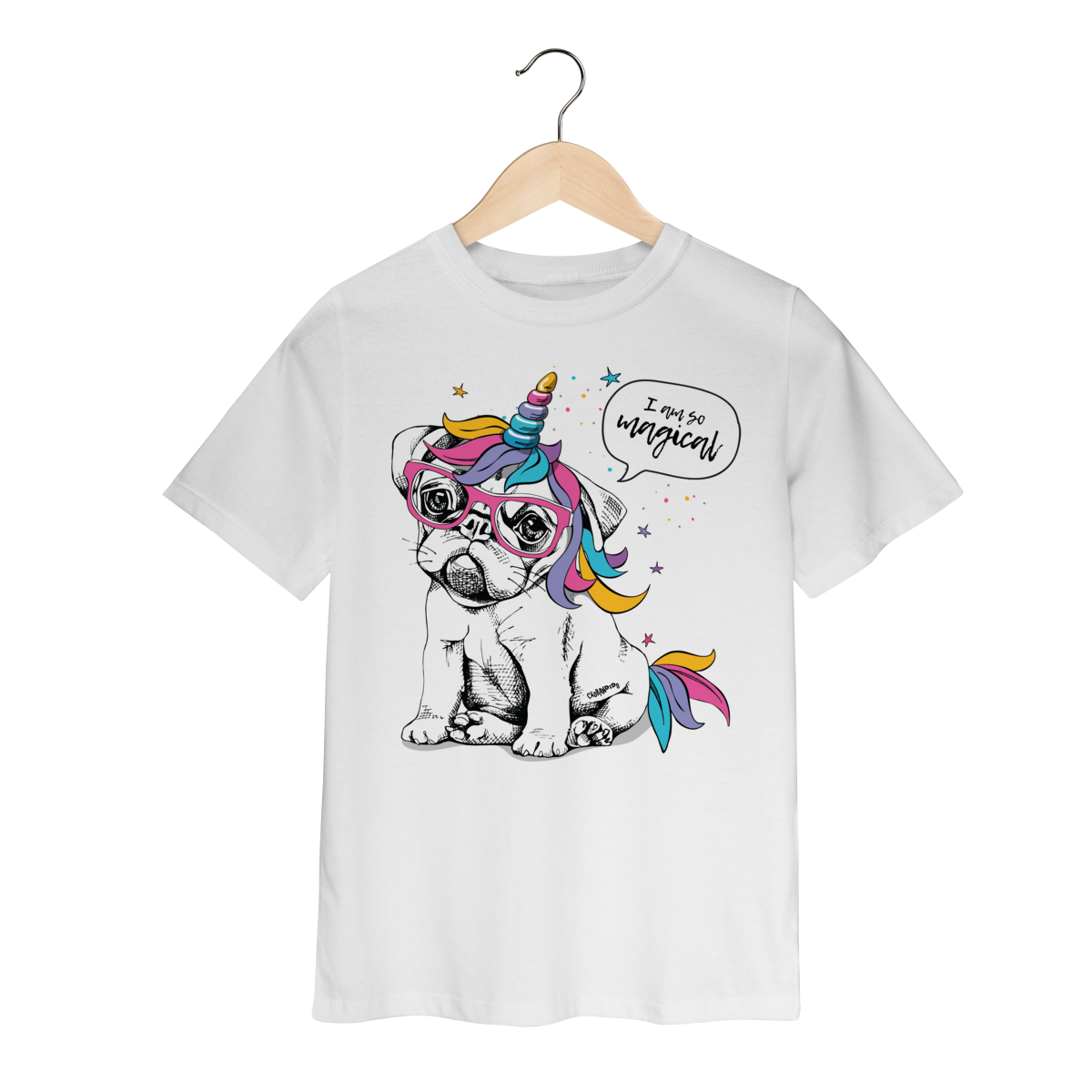 Camiseta com estampa divertida de um cachorrinho usando óculos e um chifre de unicórnio, com crina e detalhes coloridos.