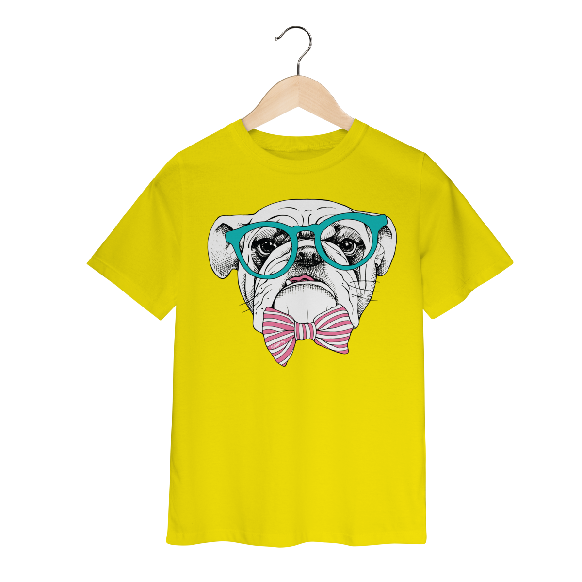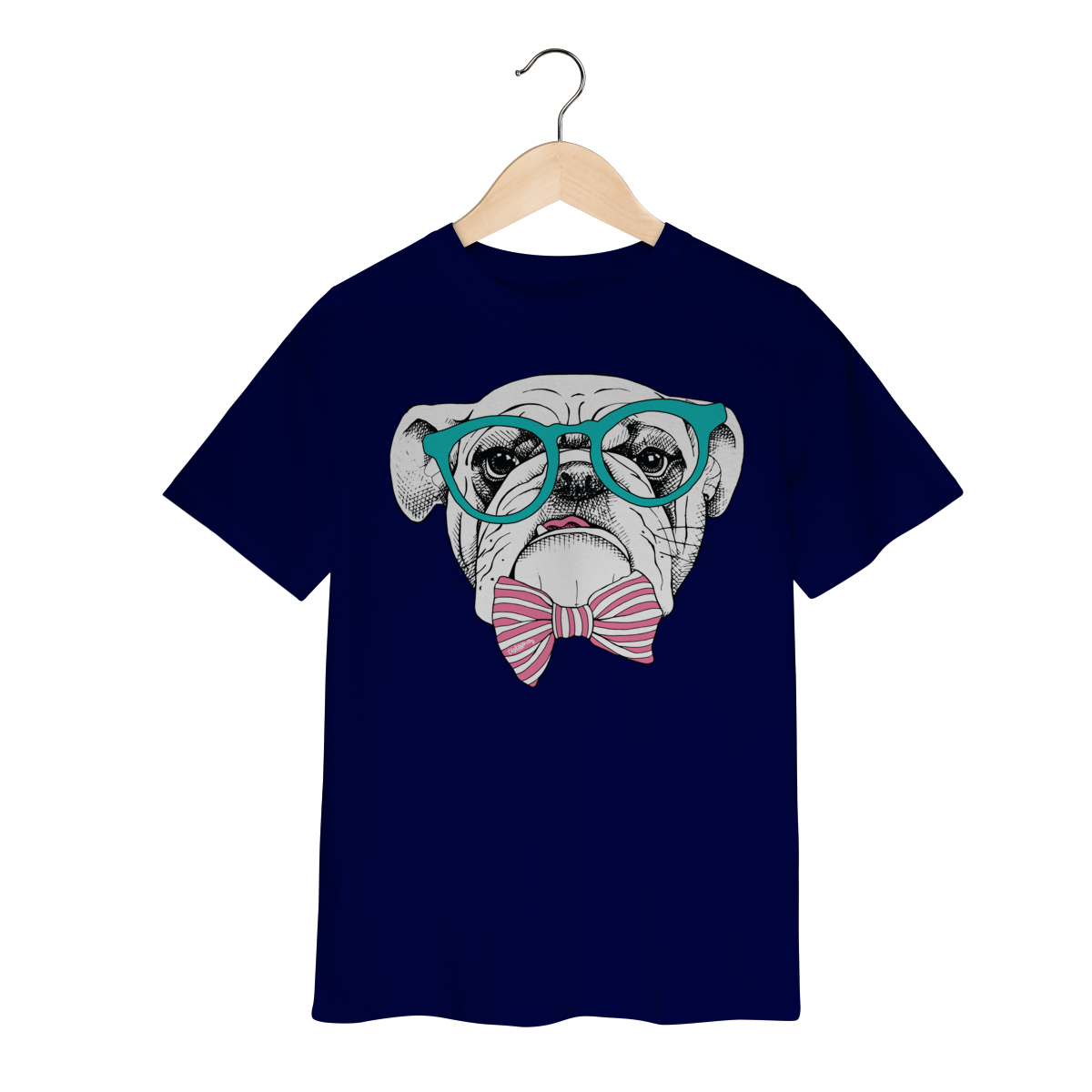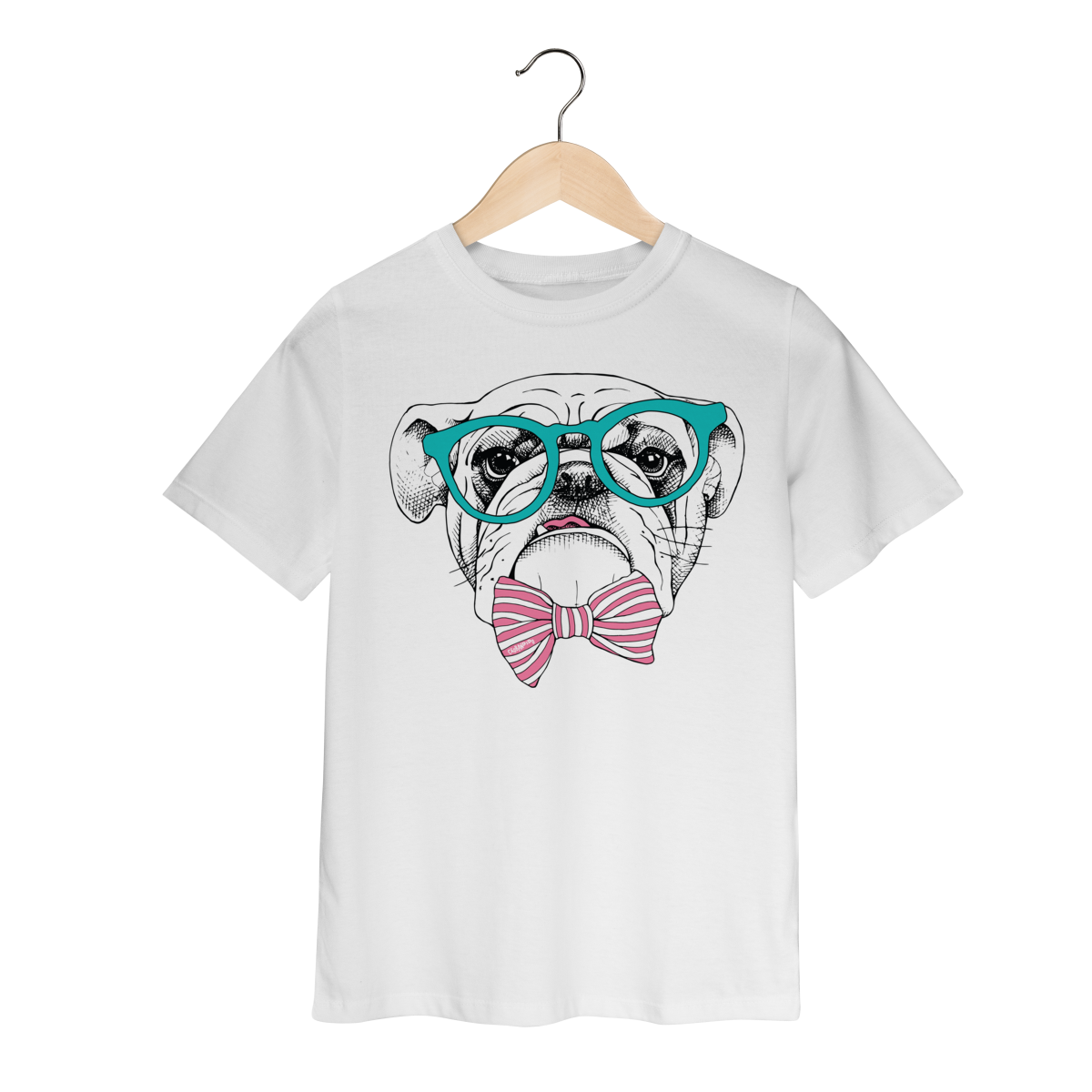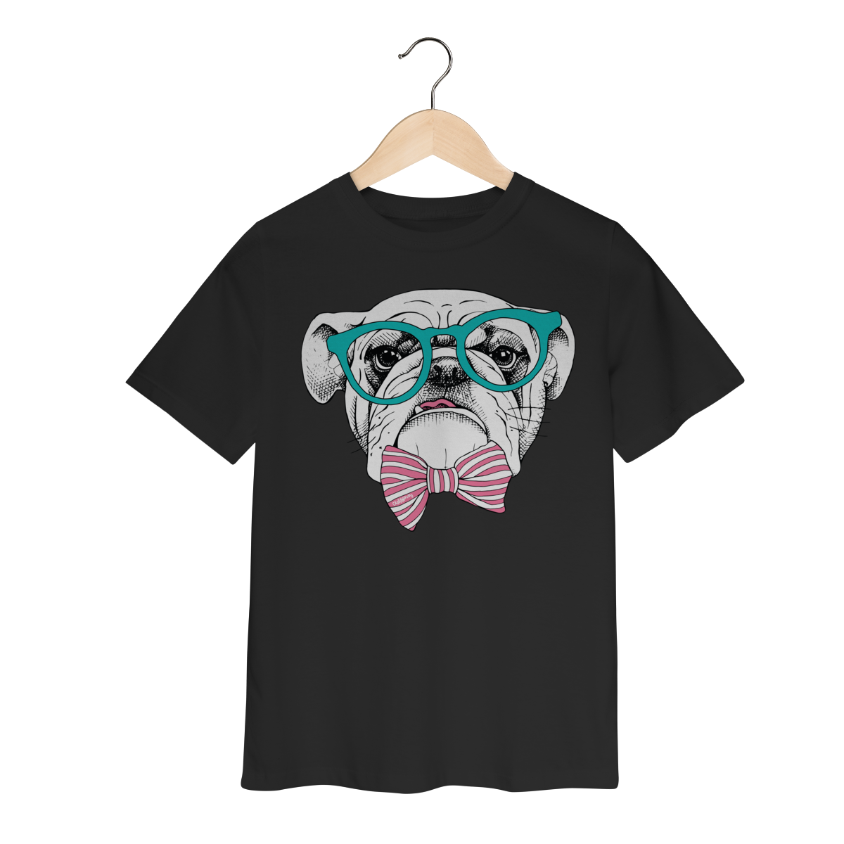 Para quem ama cachorro e também curte um visual cheio de personalidade. Estampa super charmosa de um bulldog inglês com óculos e gravata borboleta listrada, em um estilo moderno, divertido e elegante ao mesmo tempo.
