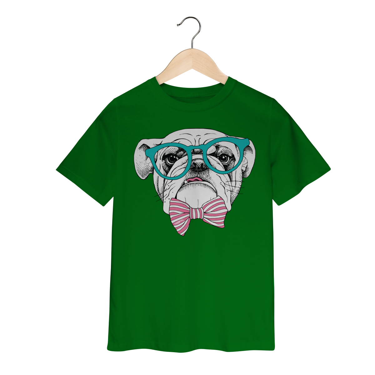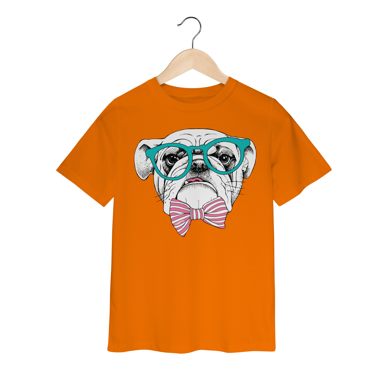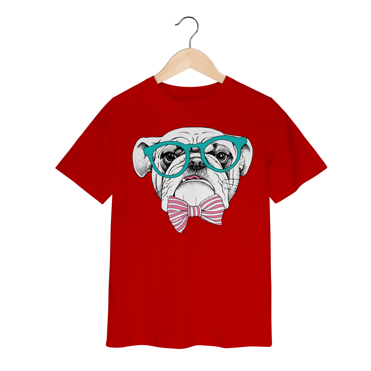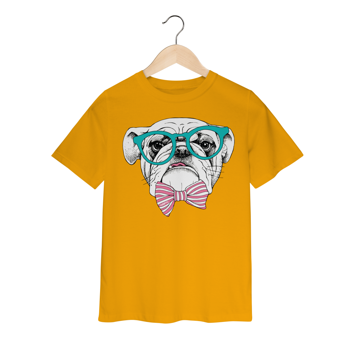 Para quem ama cachorro e também curte um visual cheio de personalidade. Estampa super charmosa de um bulldog inglês com óculos e gravata borboleta listrada, em um estilo moderno, divertido e elegante ao mesmo tempo.