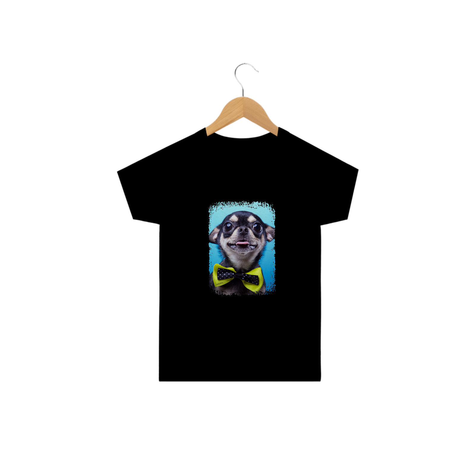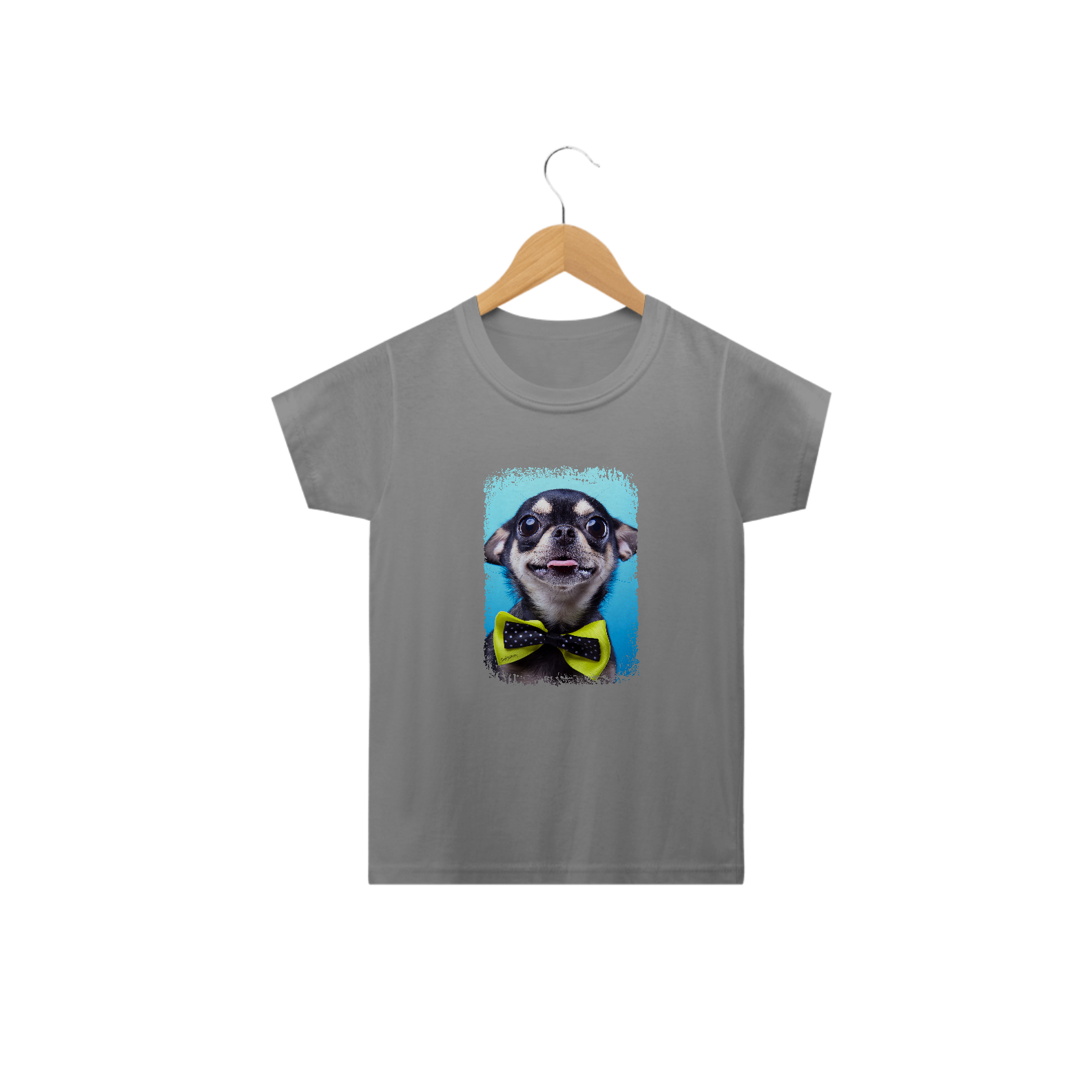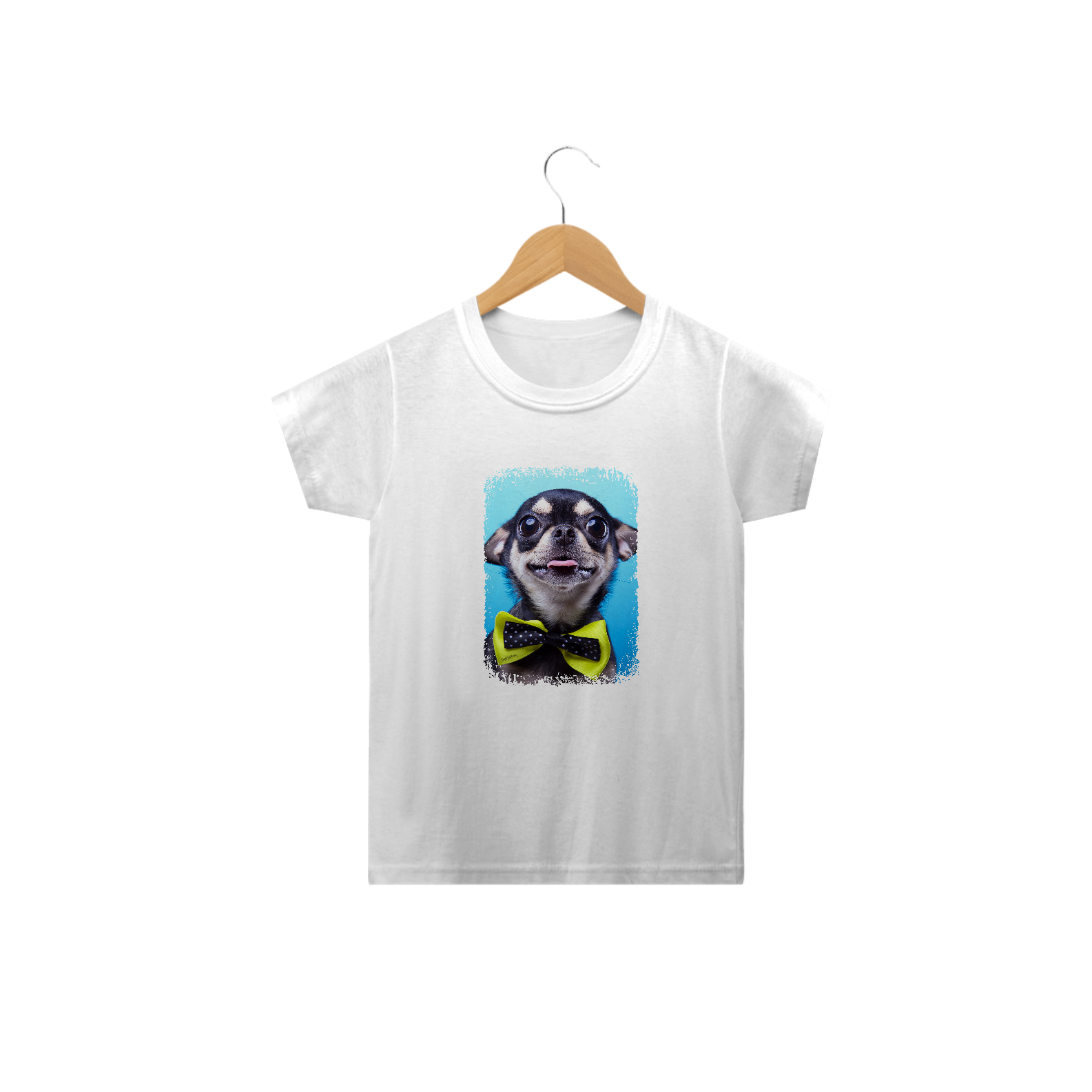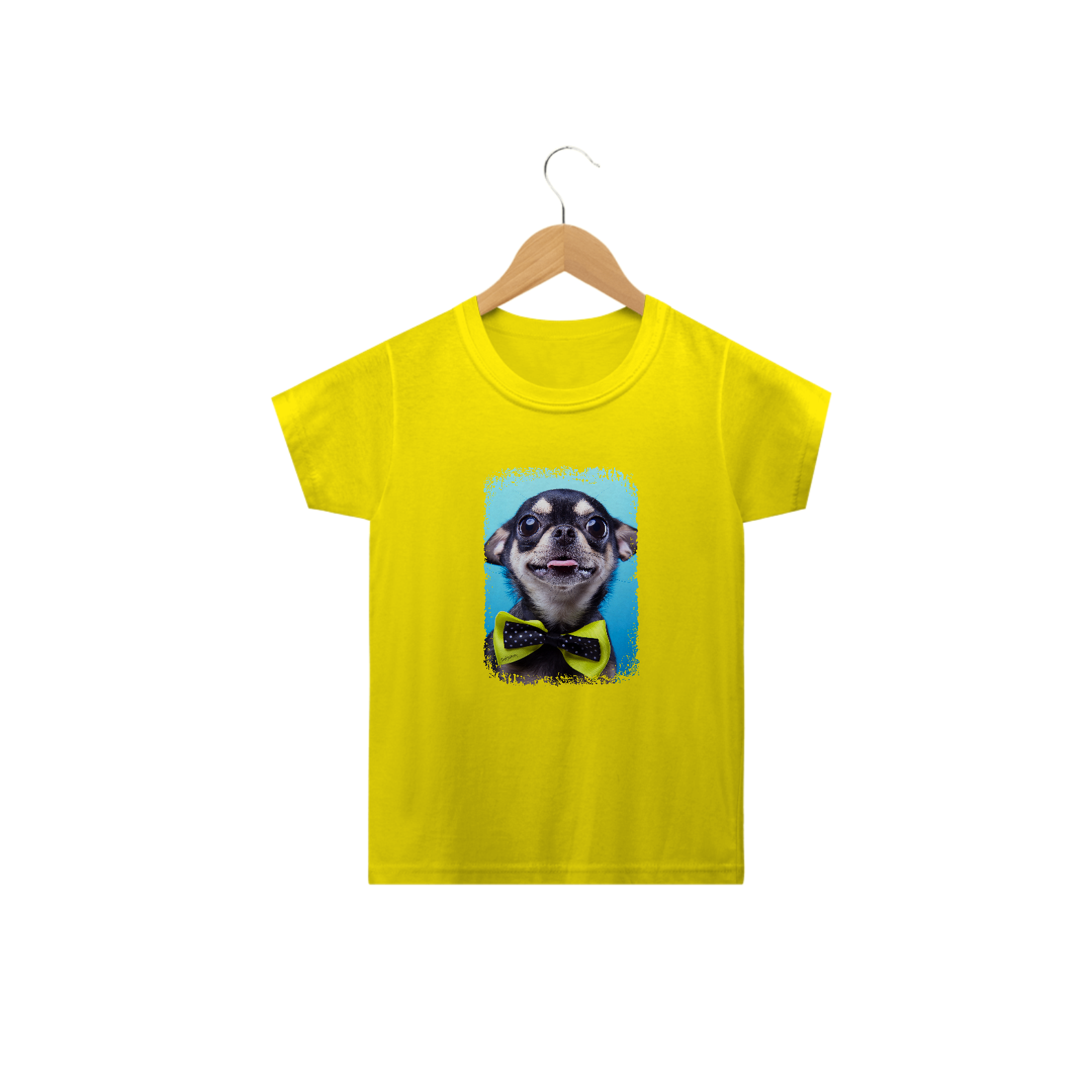 Linda camiseta com um cachorrinho da raça Chihuahua usando uma gravata amarela.