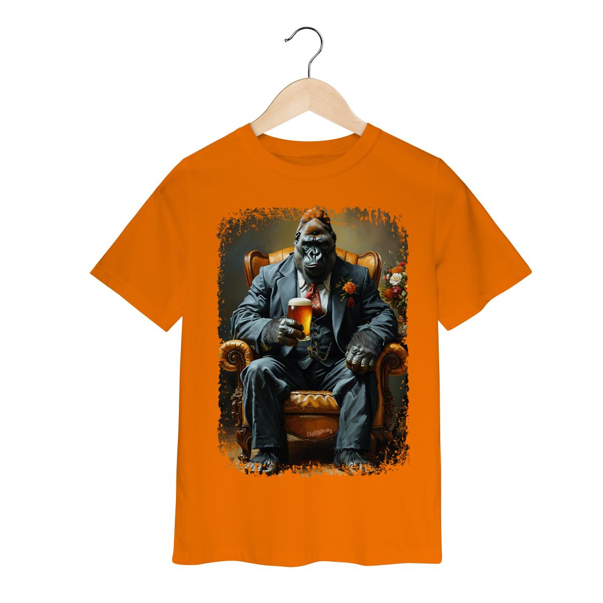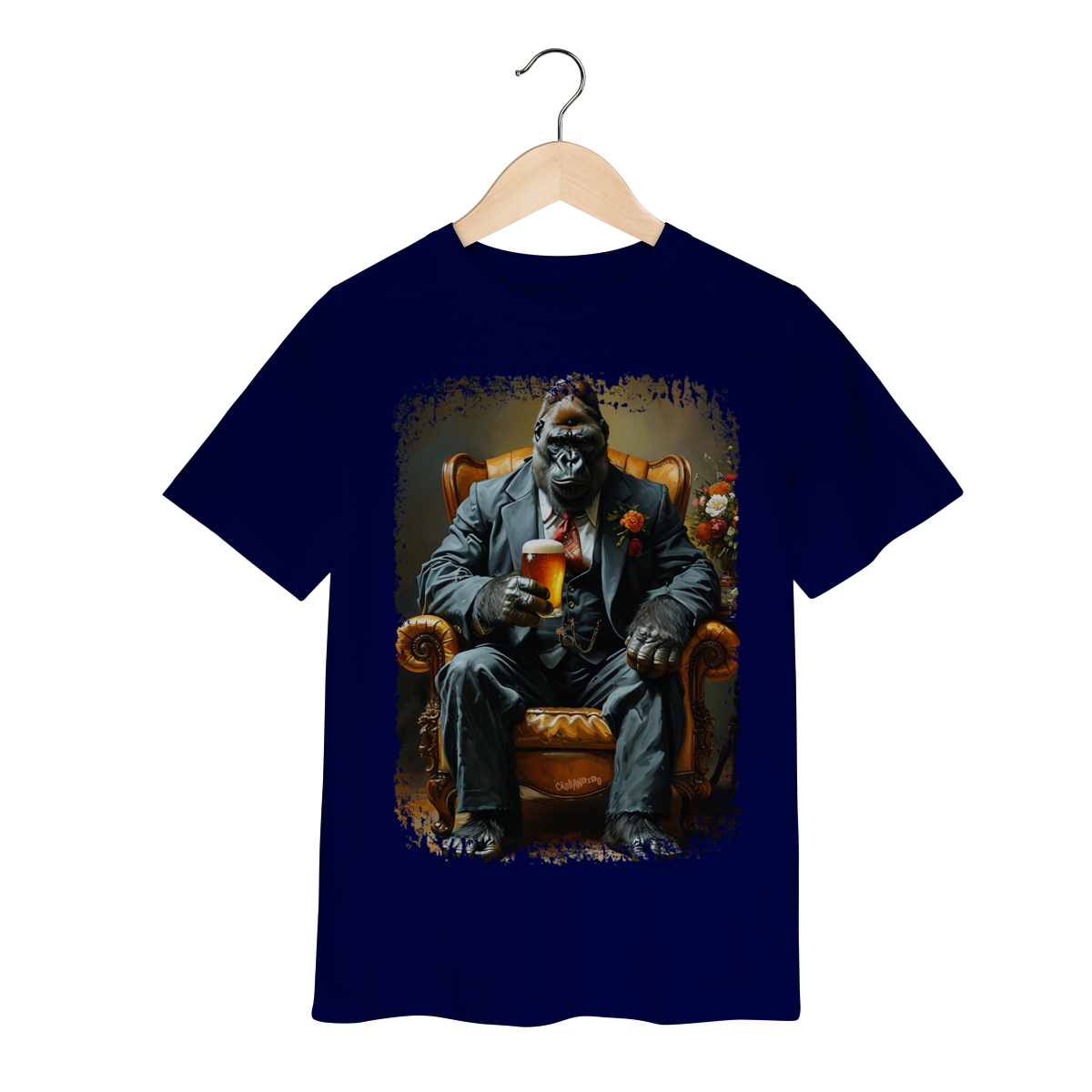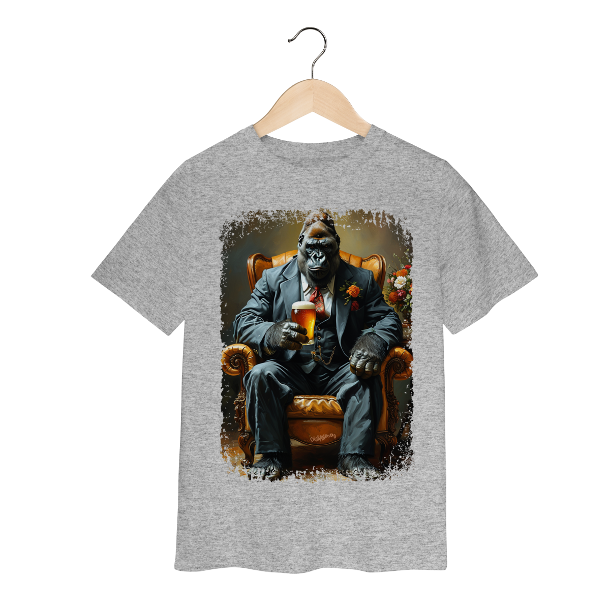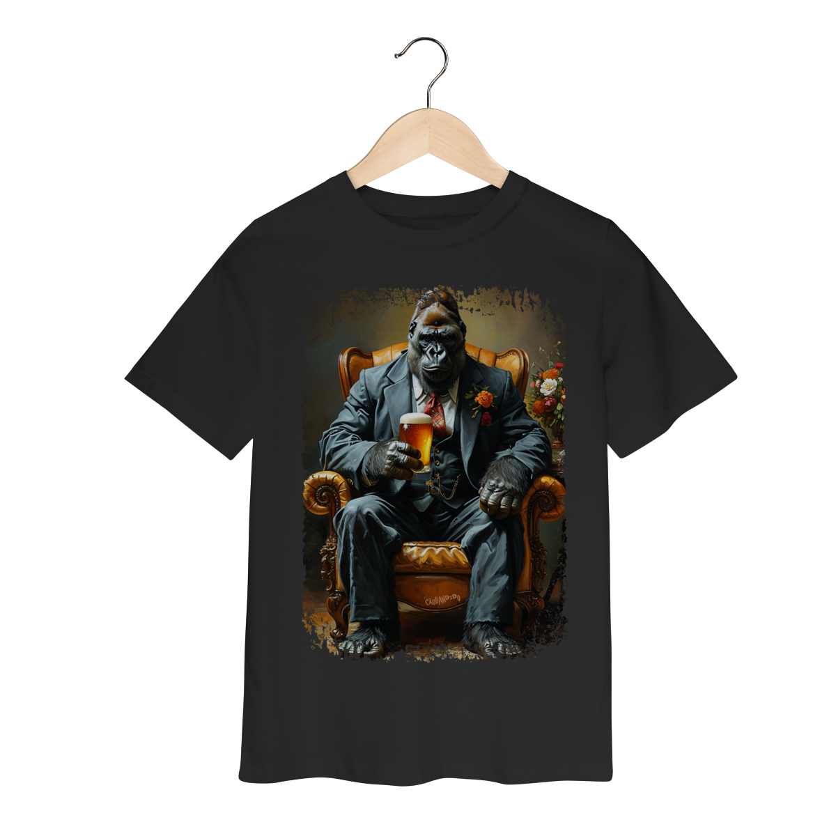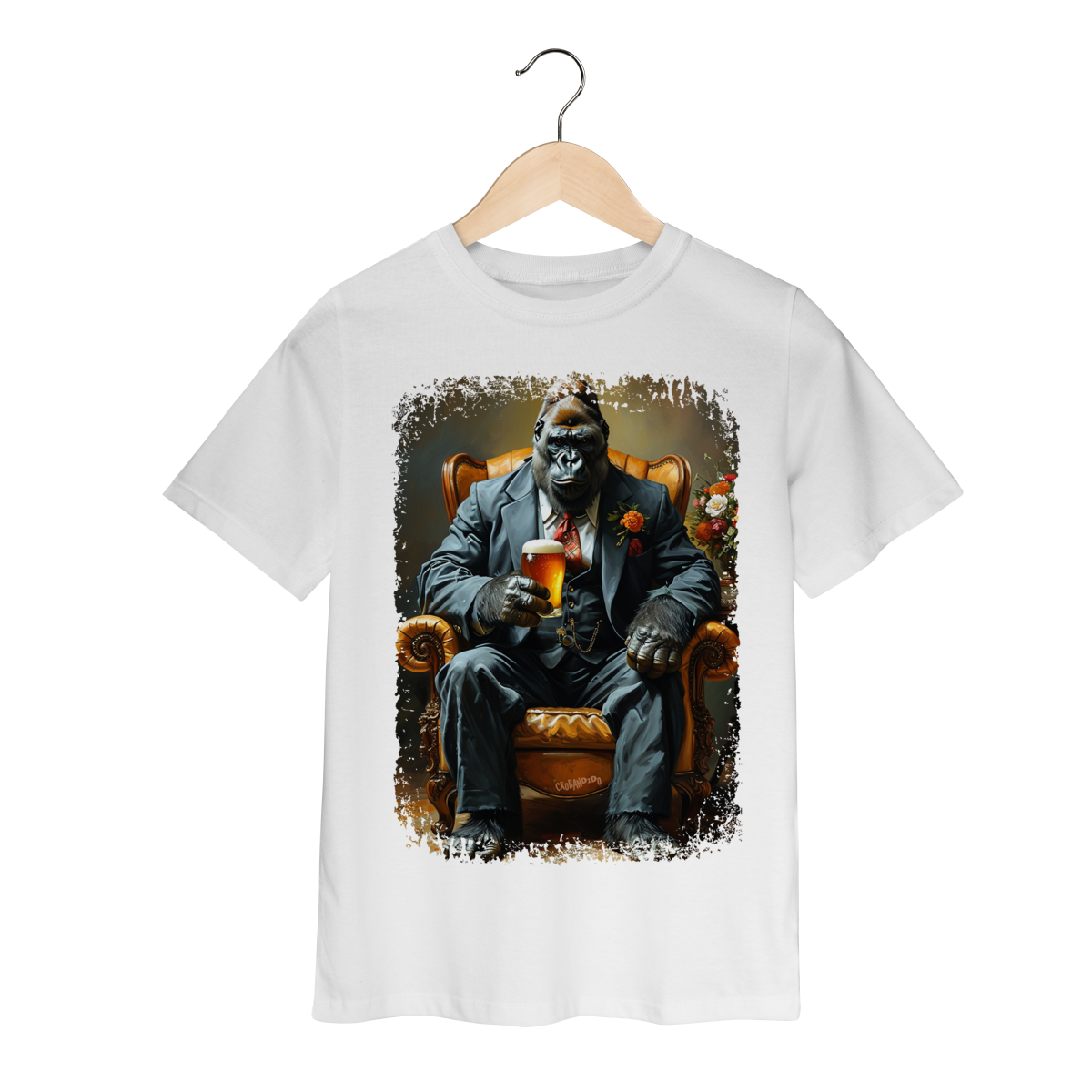 Uma camiseta cheia de presença, com um gorila imponente no melhor estilo mafioso clássico.