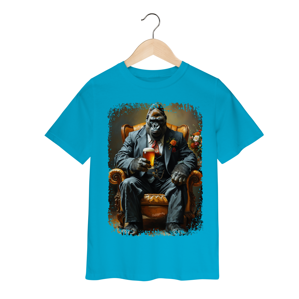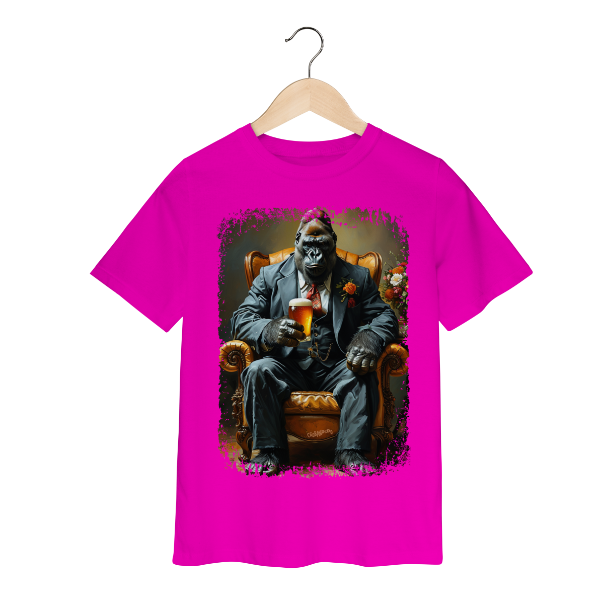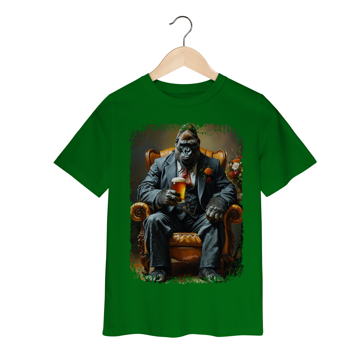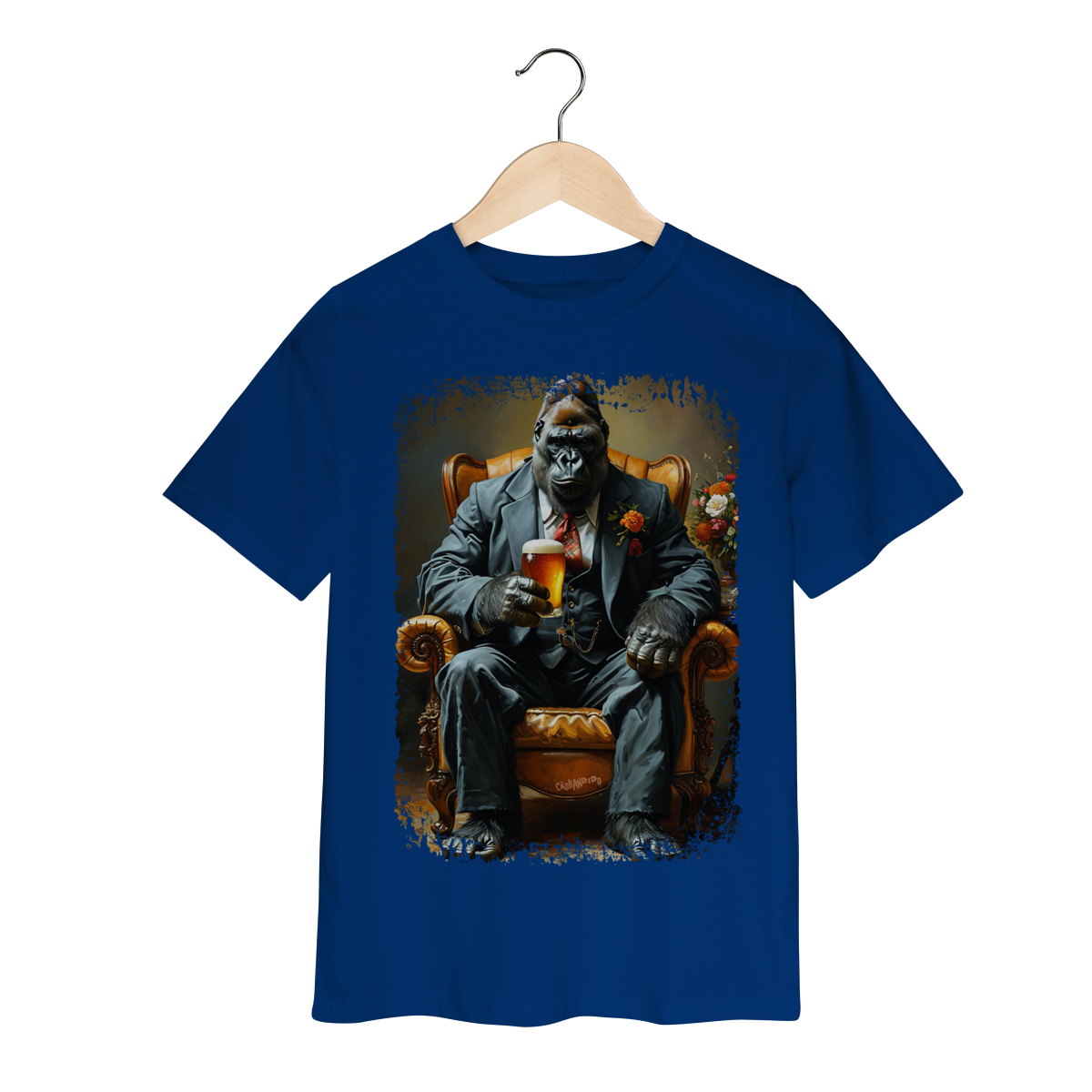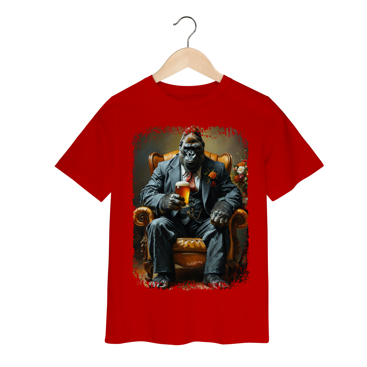 Uma camiseta cheia de presença, com um gorila imponente no melhor estilo mafioso clássico.