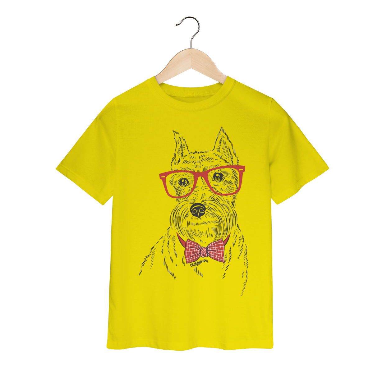 Estampa do cachorro Schnauzer em traço artístico, com óculos e gravatinha que dão um charme extra ao visual.