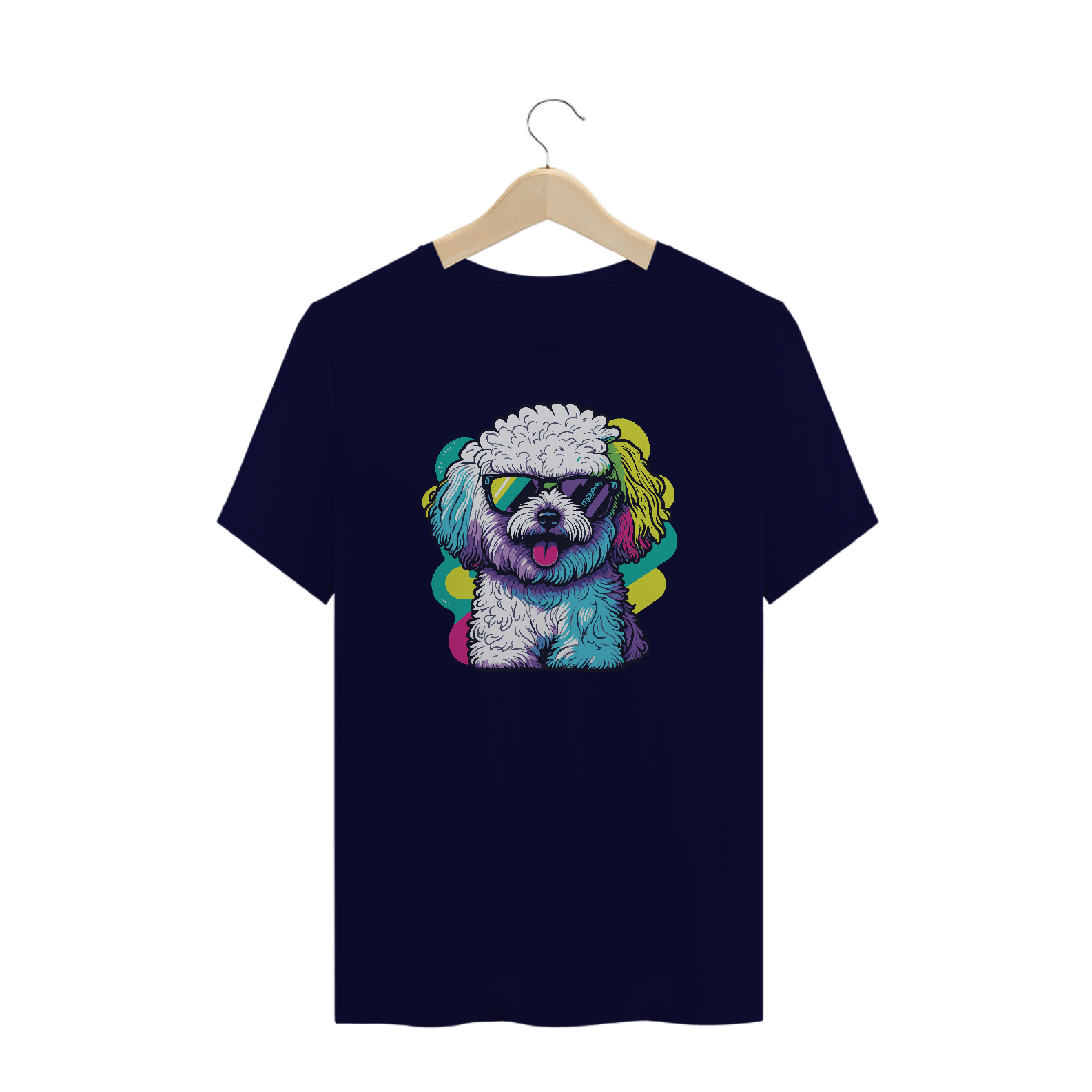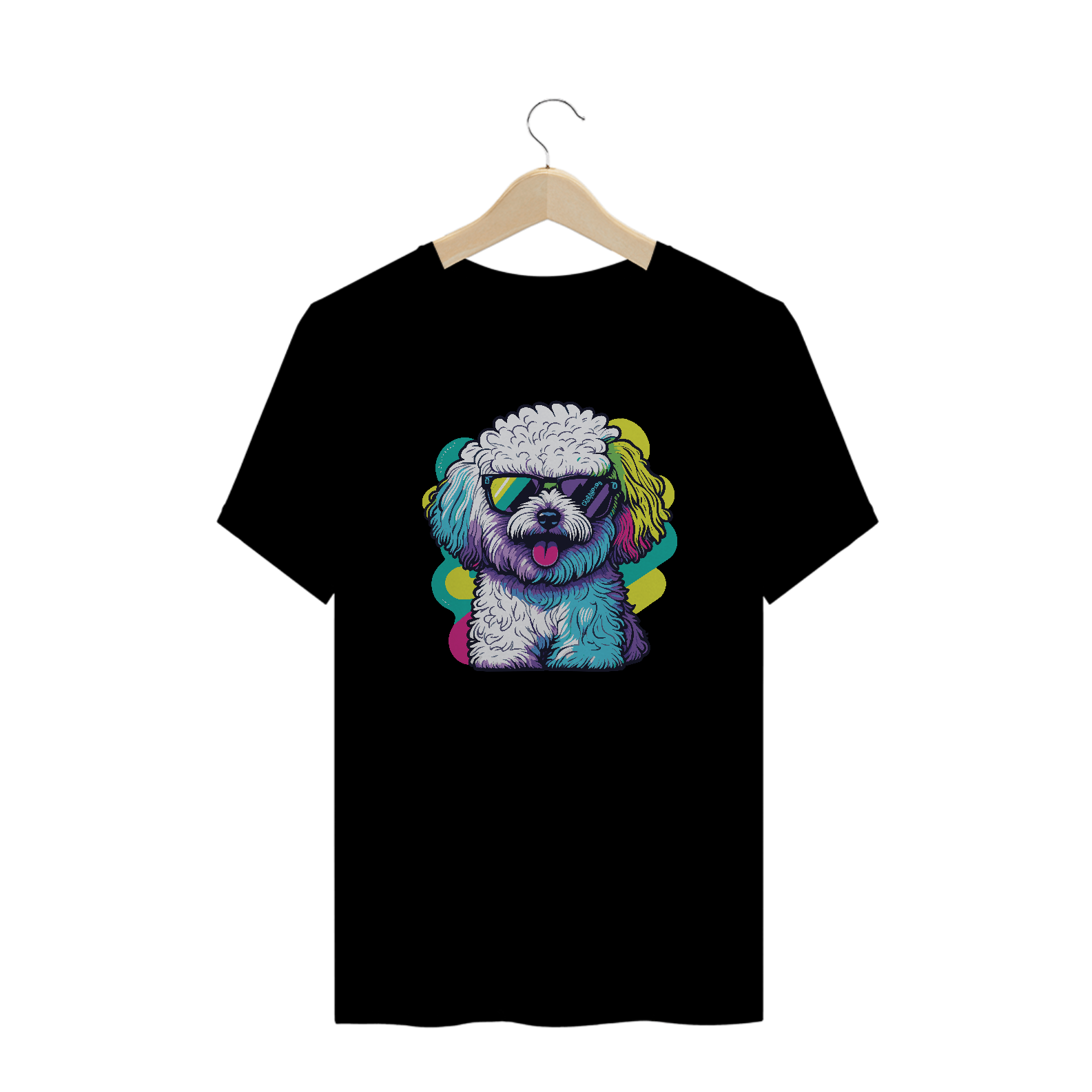Estampa com um lindo cachorrinho, cheio de cores, e usando óculos escuros.