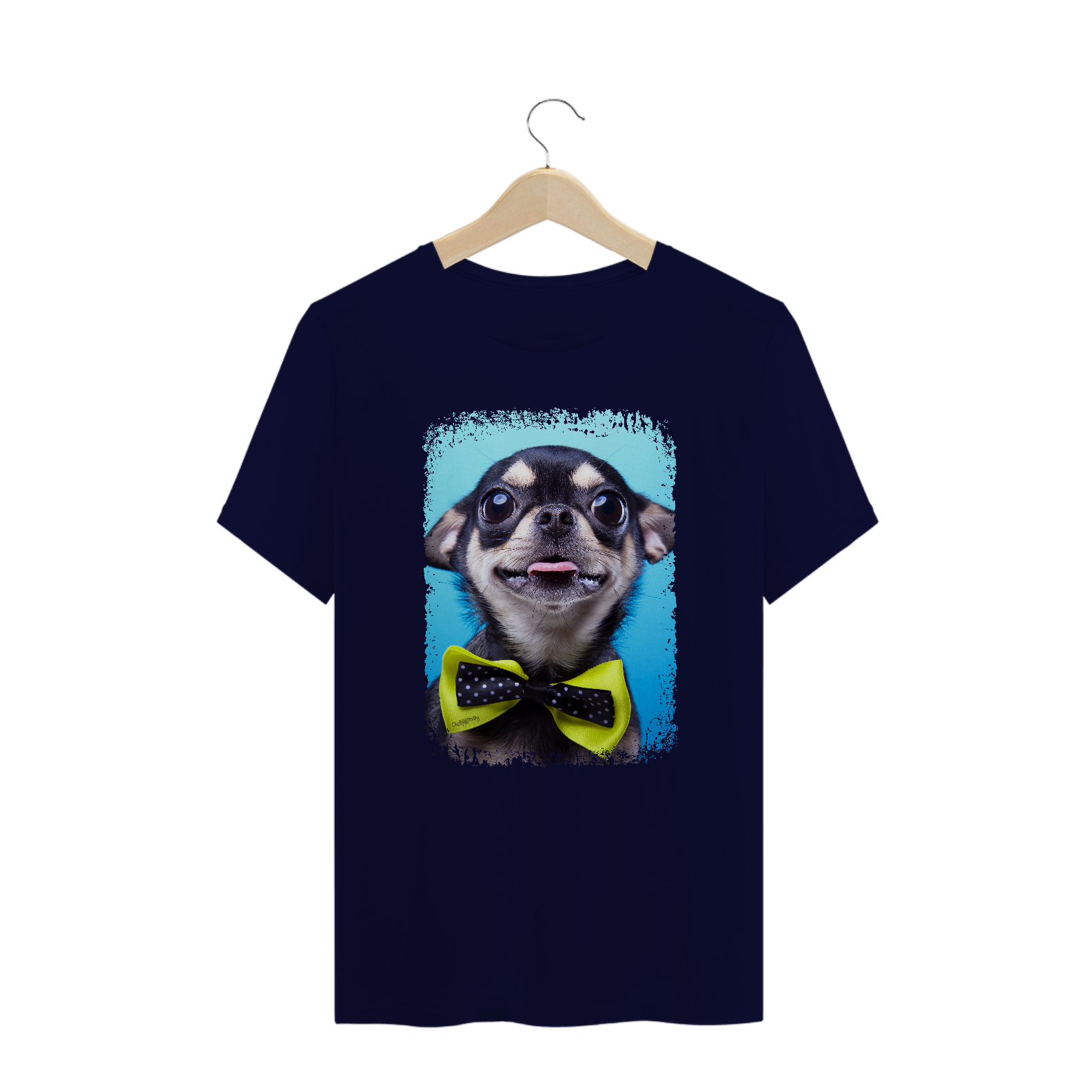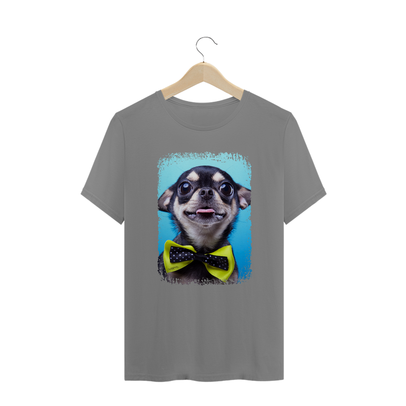 Linda camiseta com um cachorrinho da raça Chihuahua usando uma gravata amarela.
