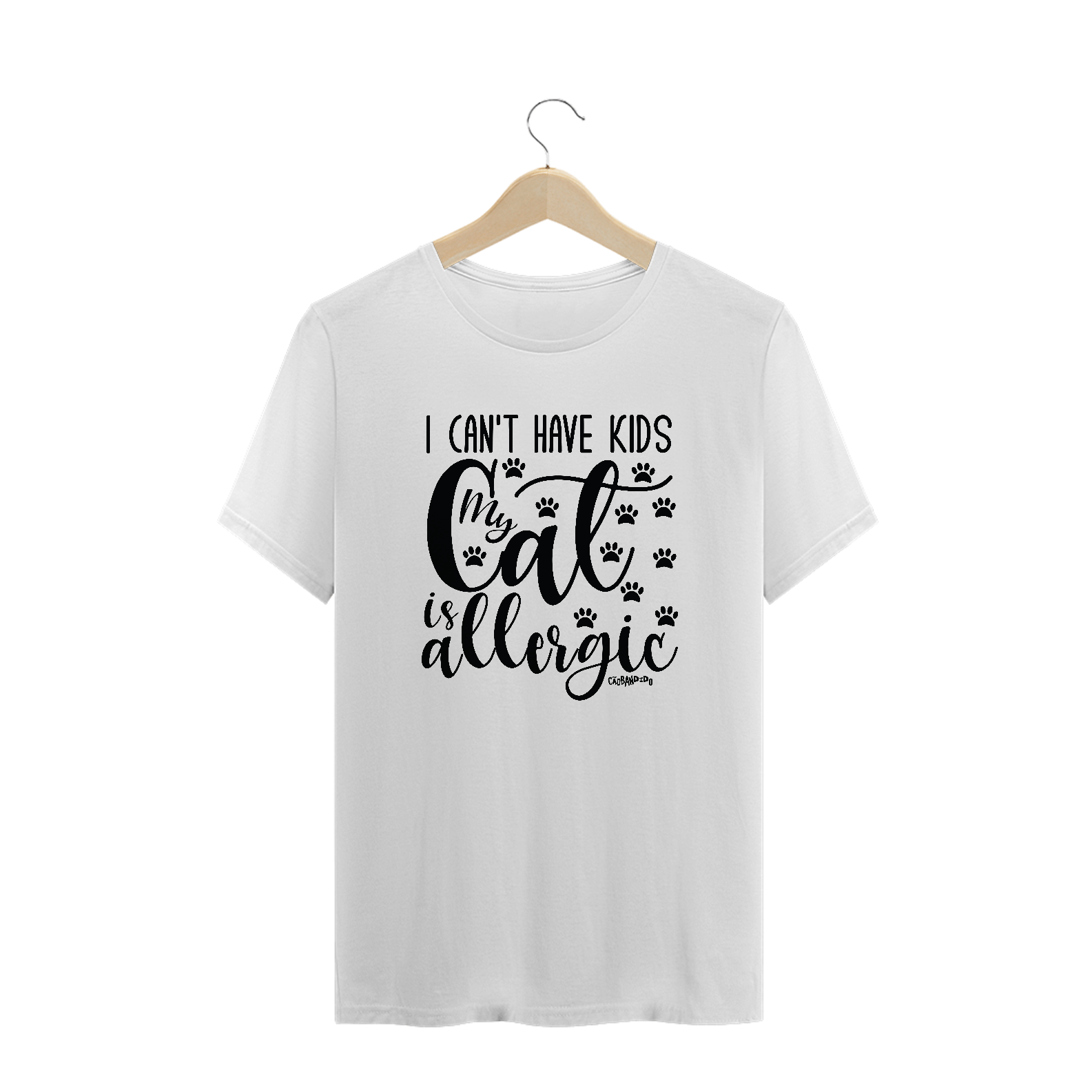 Estampa bem humorada com a frase: "Não posso ter filhos, meu gato é alérgico".