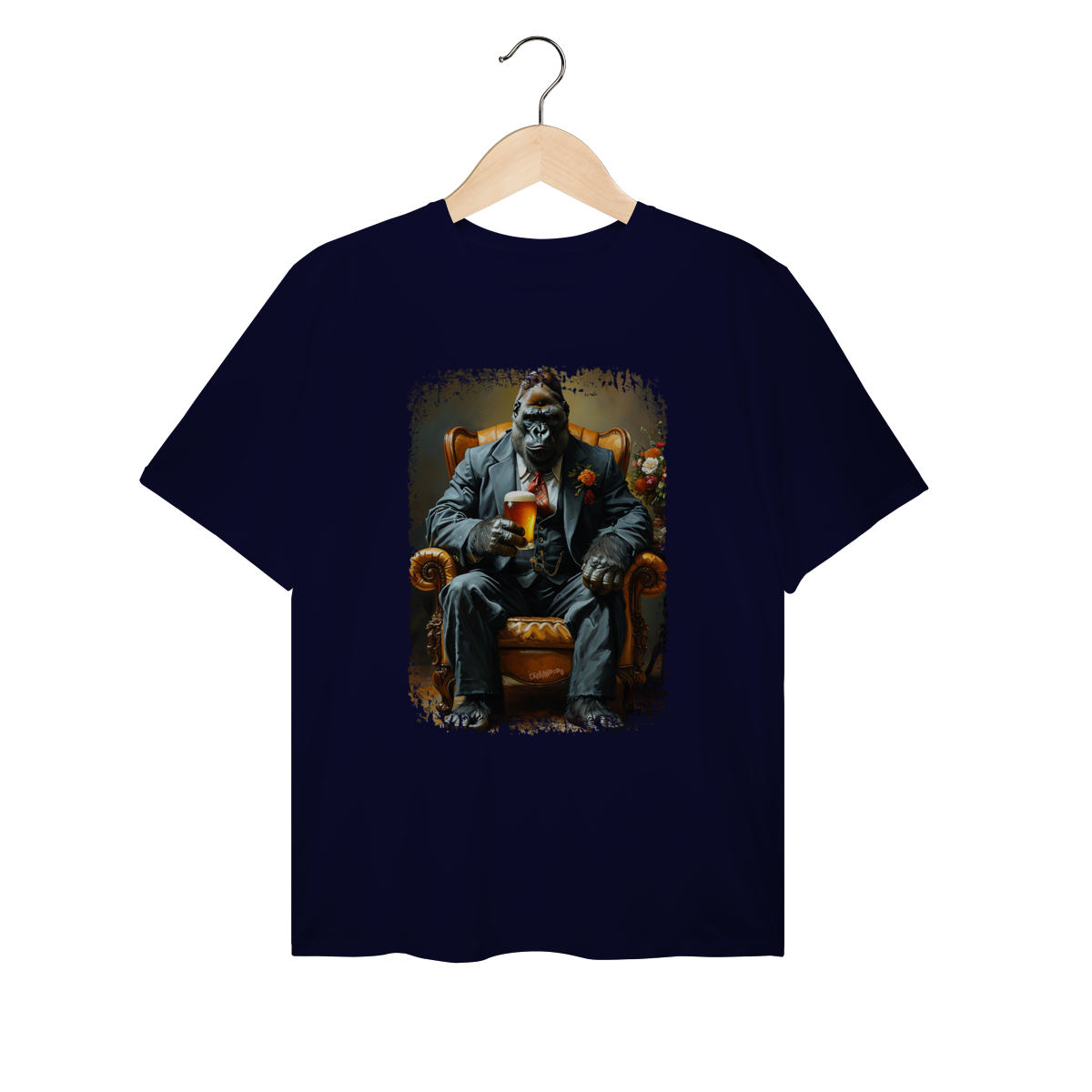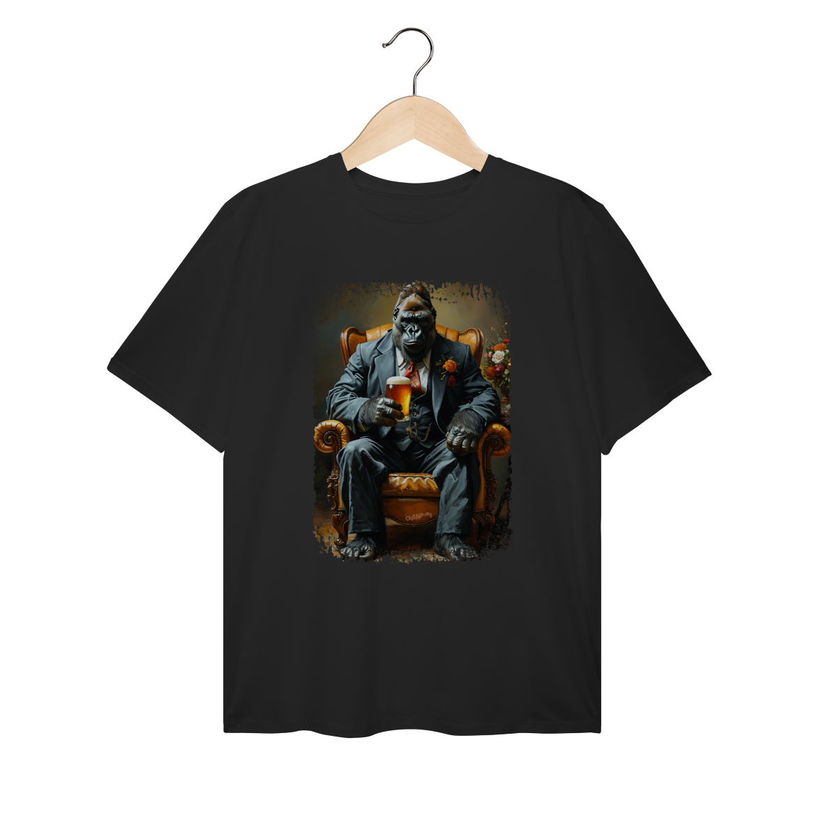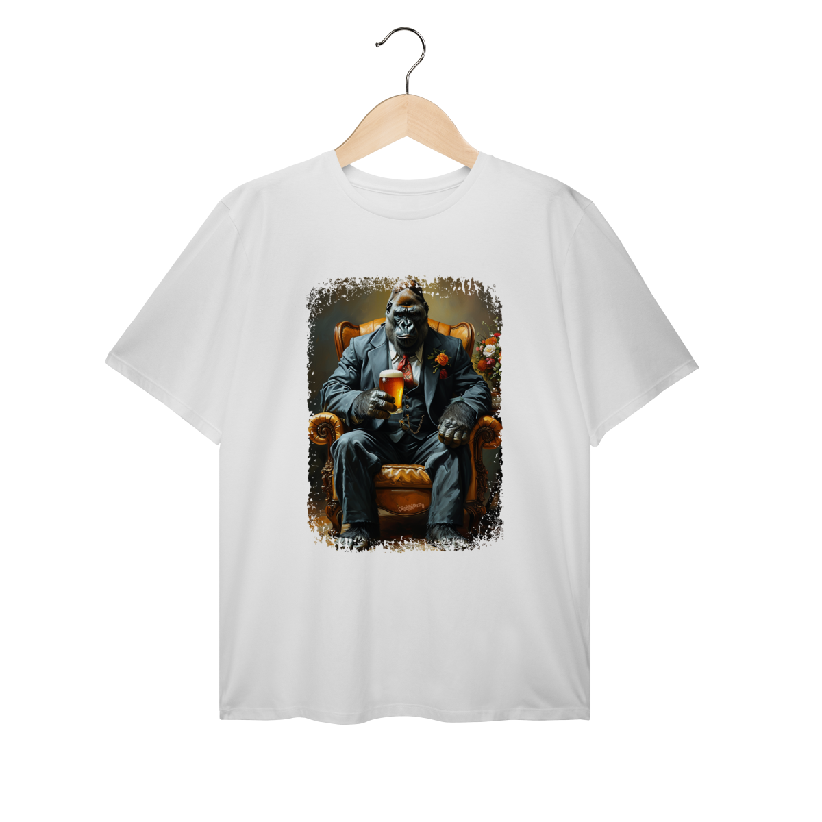 Uma camiseta cheia de presença, com um gorila imponente no melhor estilo mafioso clássico.