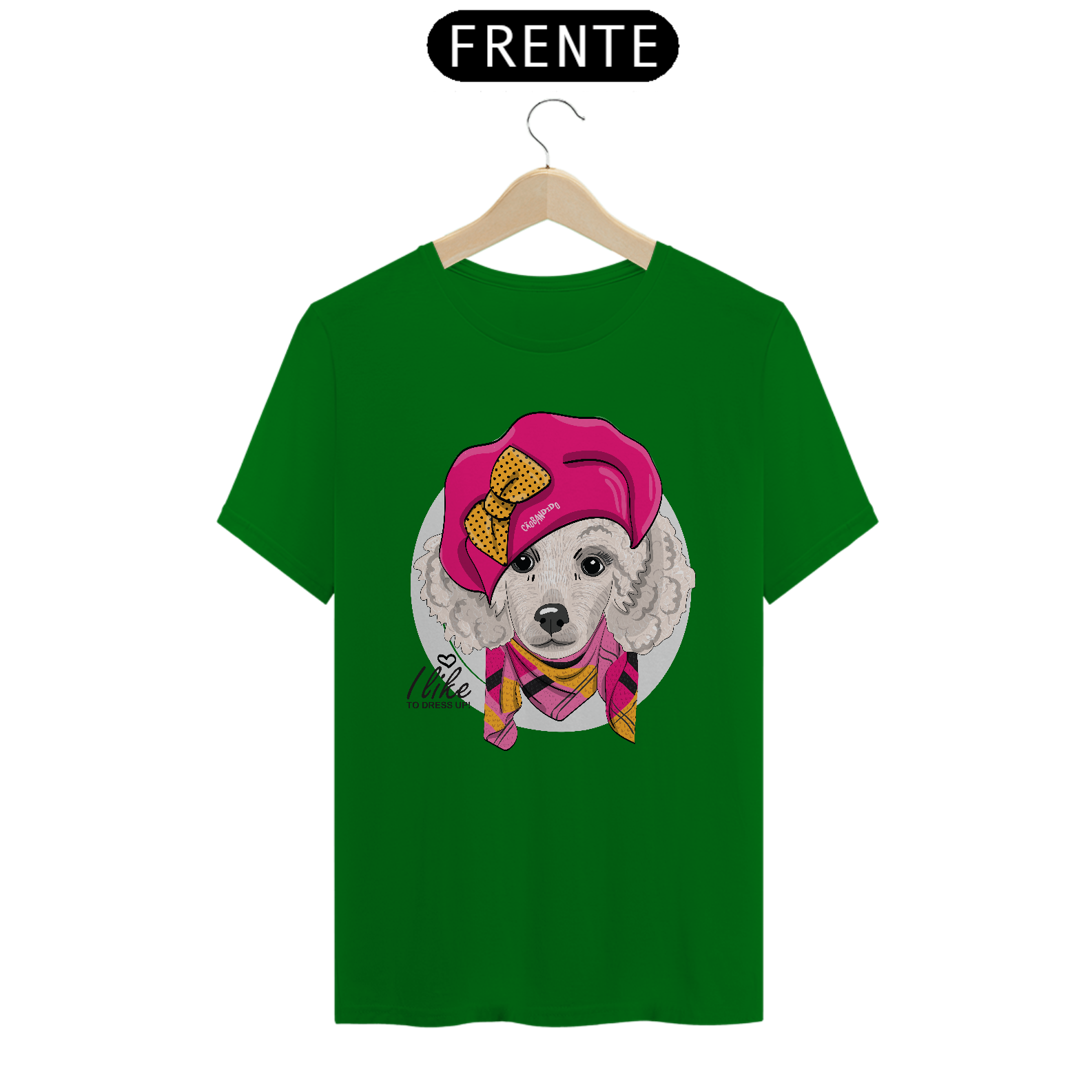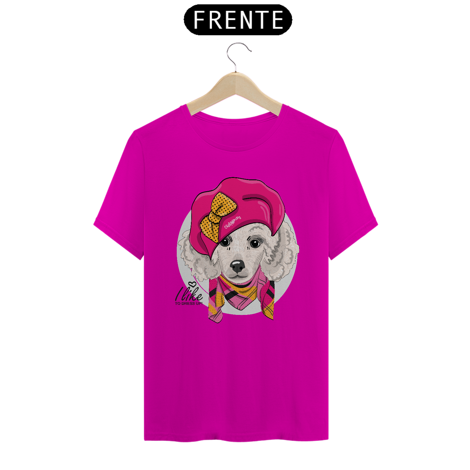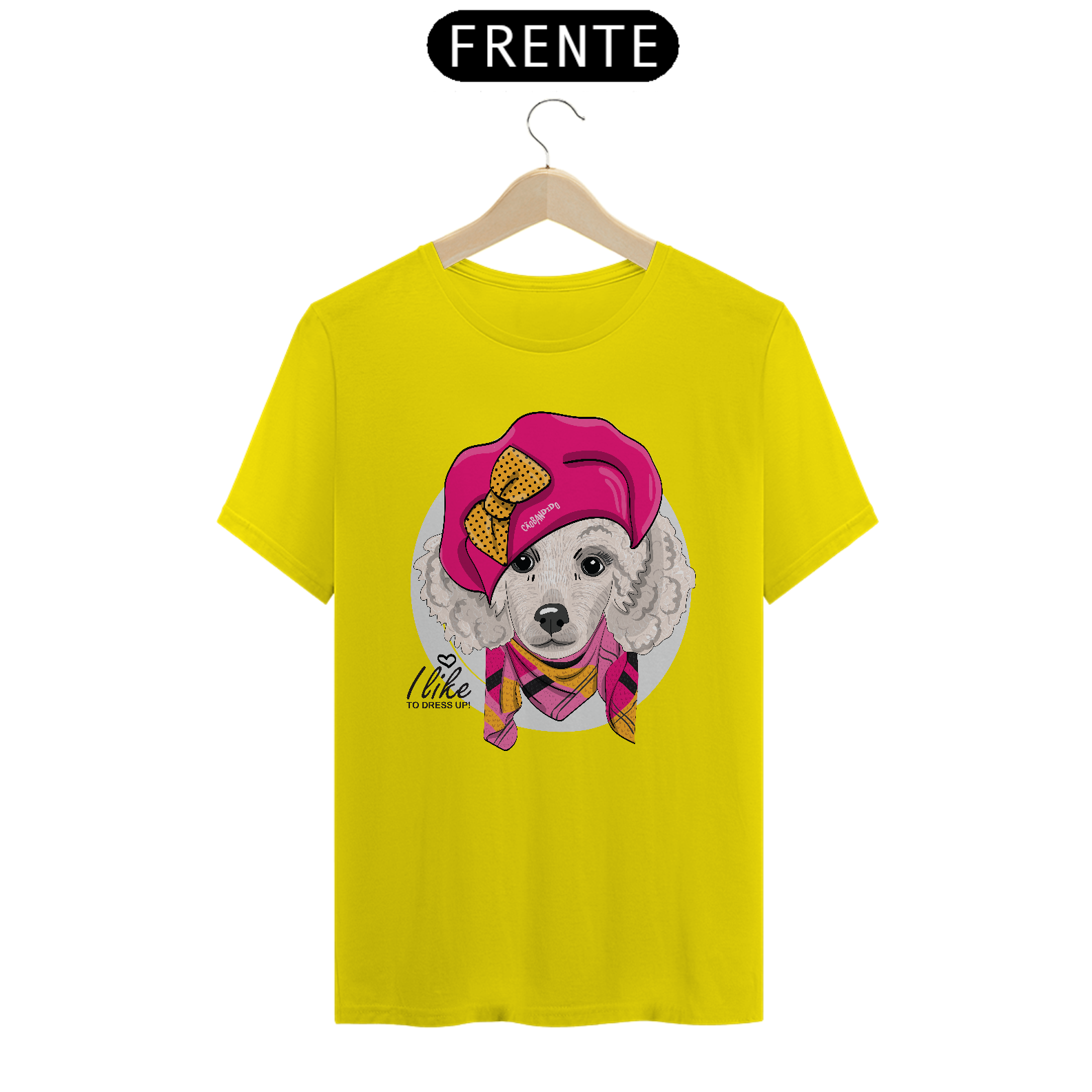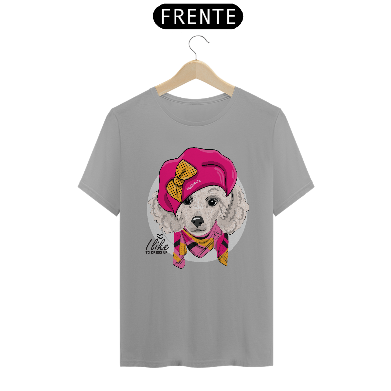 Linda estampa com uma cachorra da raça Poodle, bem vestida e estilosa! :)