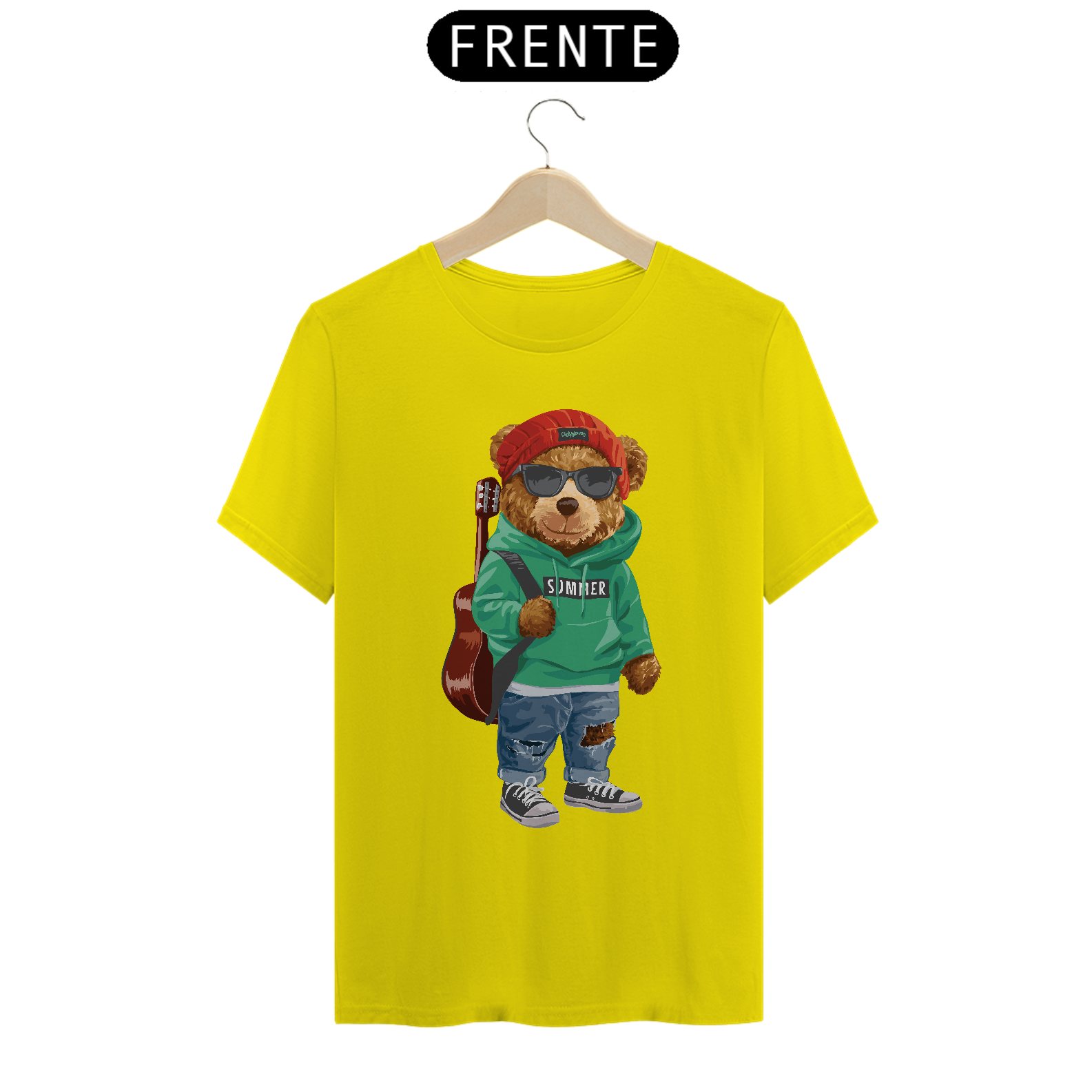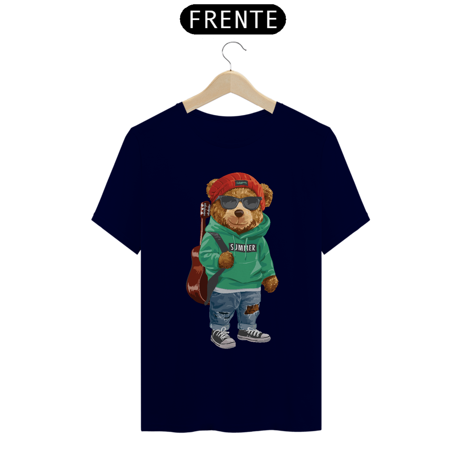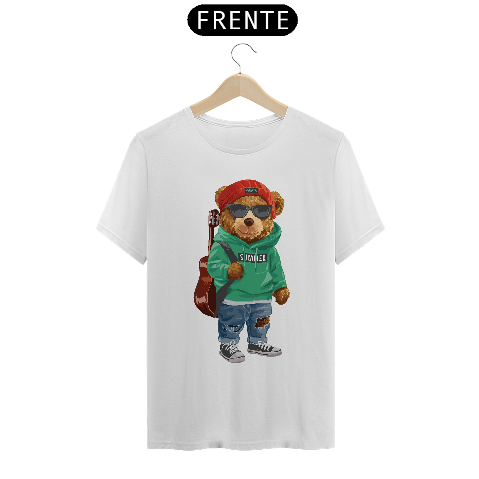 Um urso todo estiloso de touca, óculos de sol e carregando seu violão!
