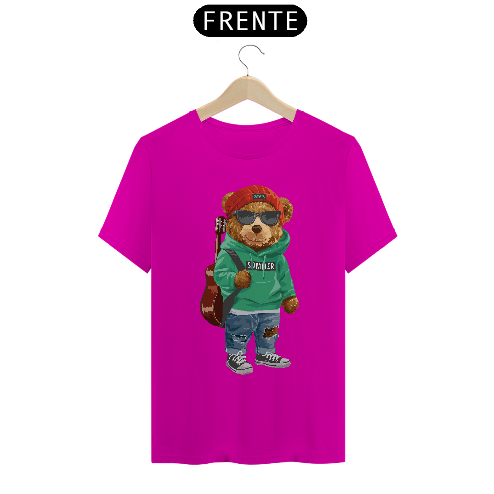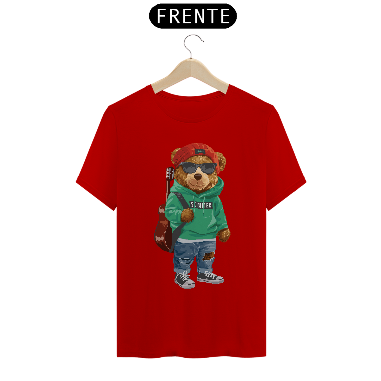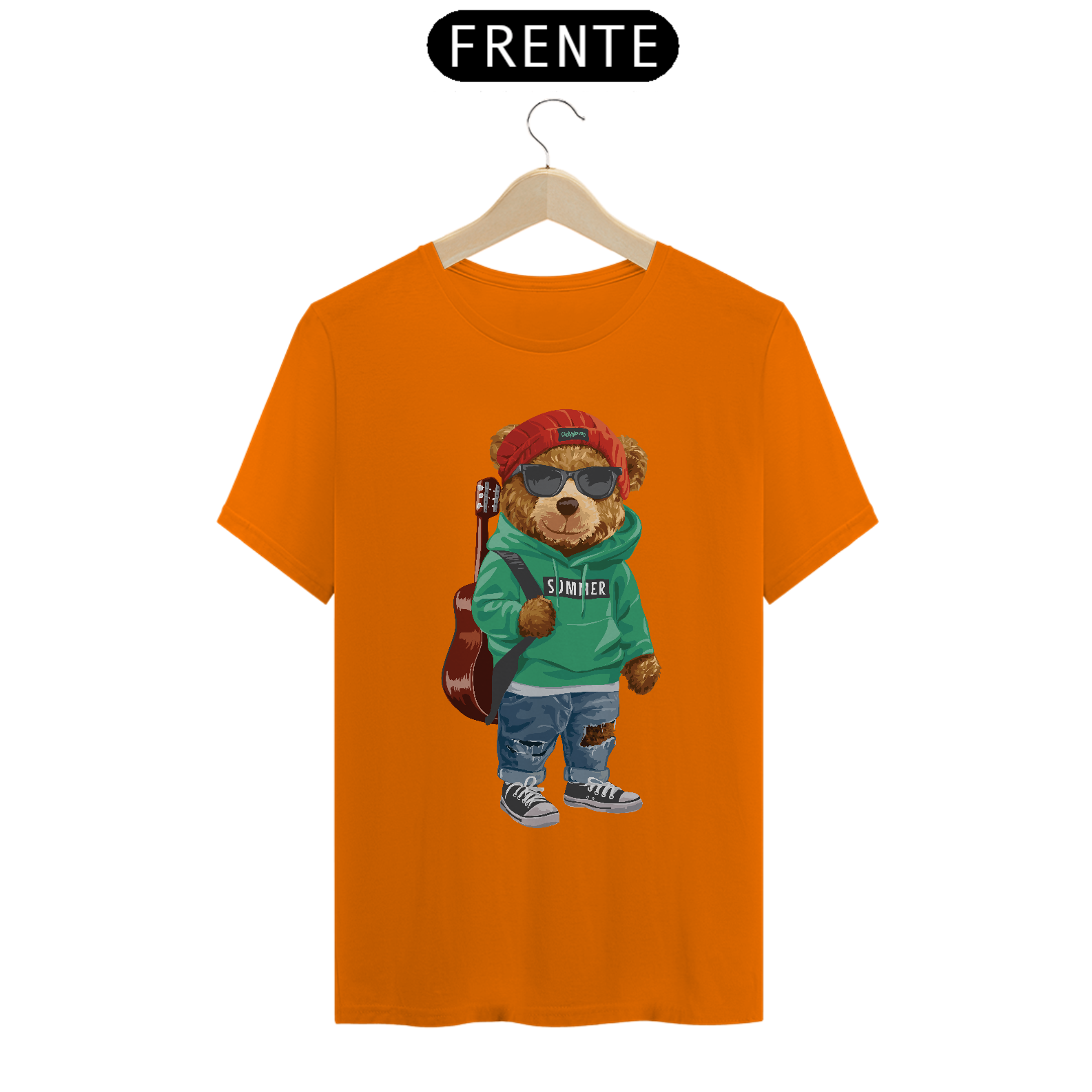 Um urso todo estiloso de touca, óculos de sol e carregando seu violão!