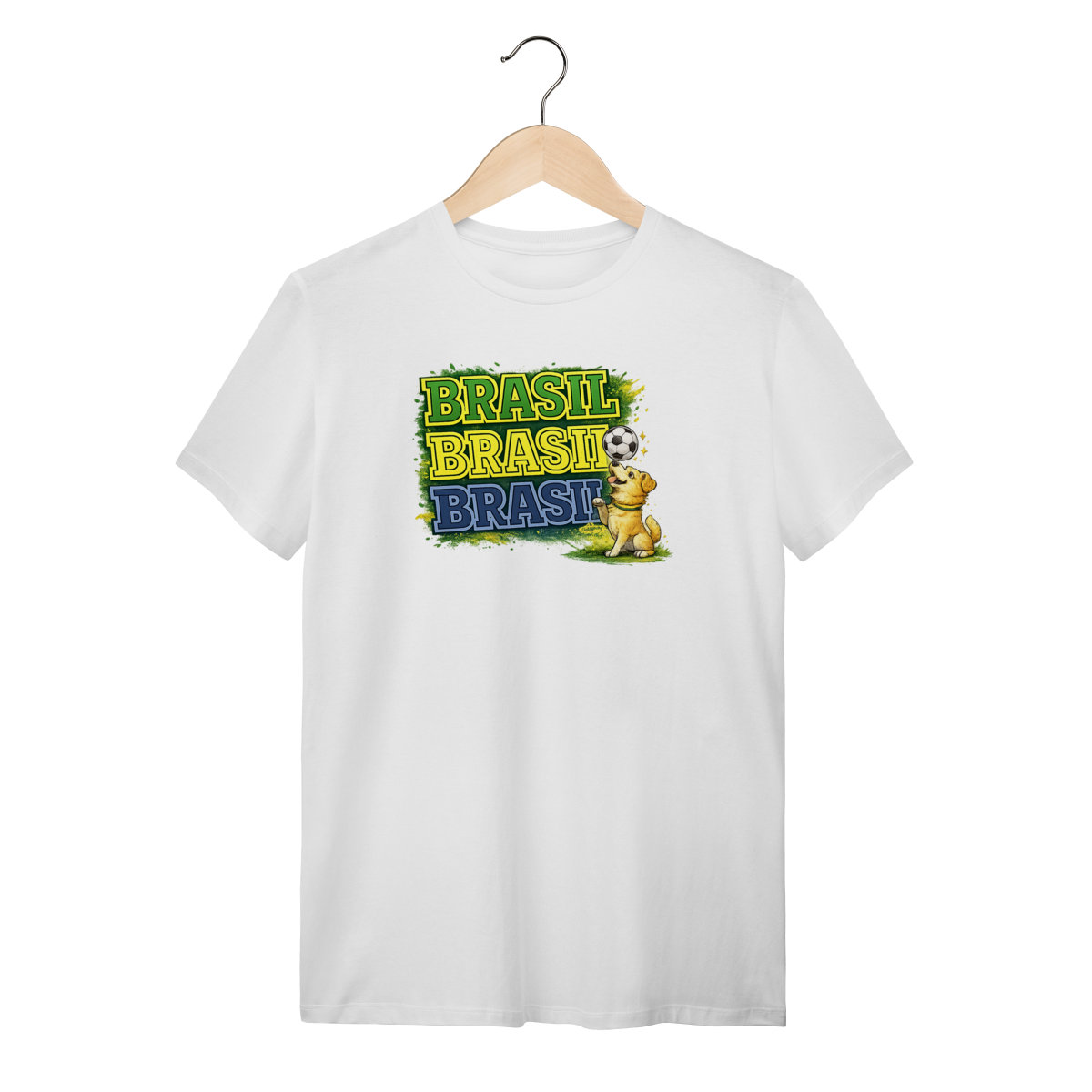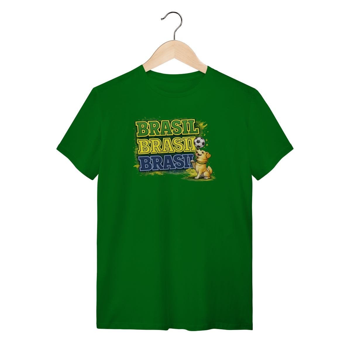 Estampa marcante nas cores da seleção e um doguinho boleiro equilibrando a bola, do jeitinho que todo torcedor raiz gosta.
