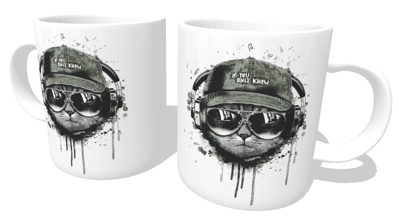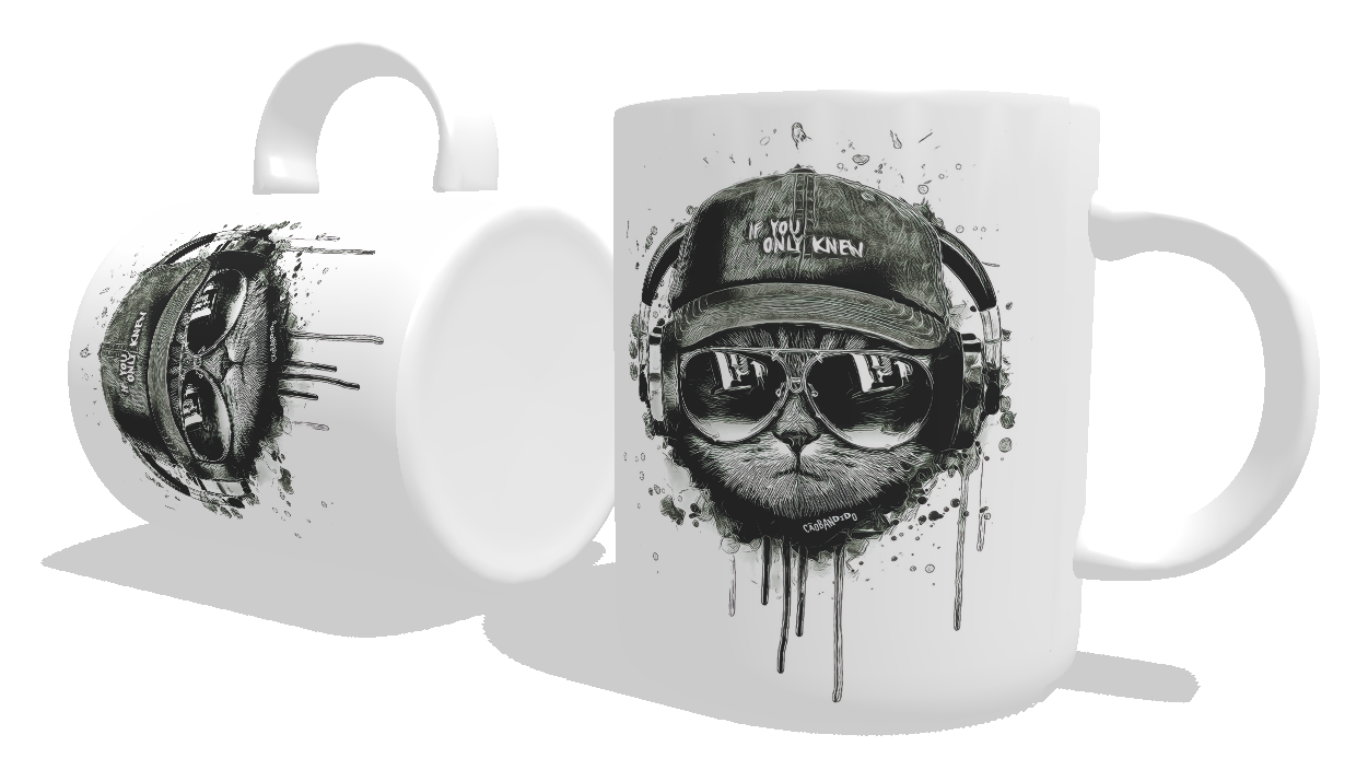 Caneca cheia de estilo com um lindo gatinho curtindo um som com o seu fone de ouvidos.