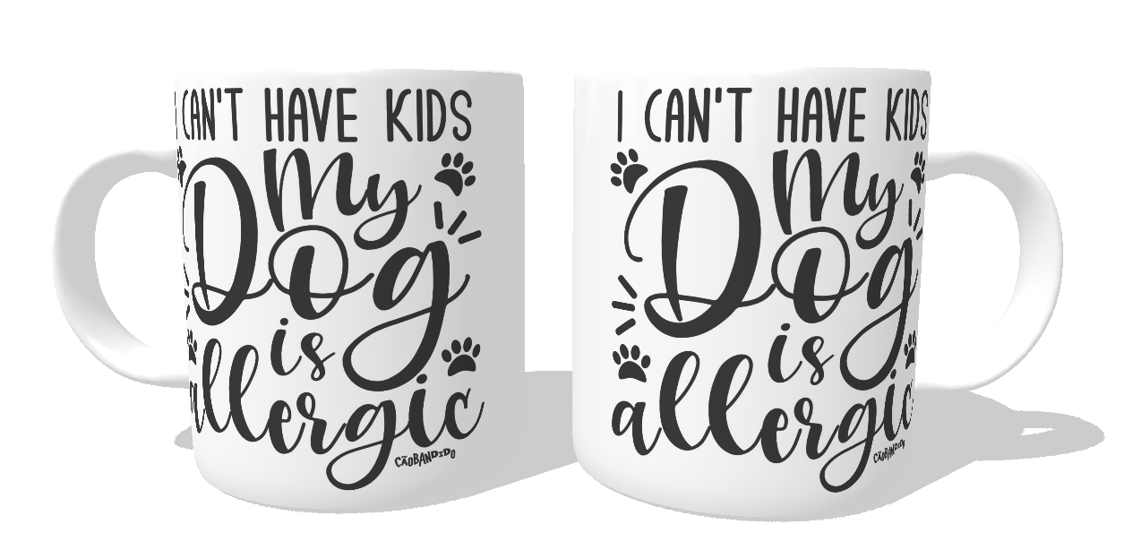 Caneca bem humorada com a frase: "Não posso ter filhos, meu cachorro é alérgico".