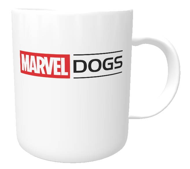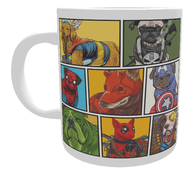 Linda caneca com cachorros fantasiados de super-heróis da Marvel.