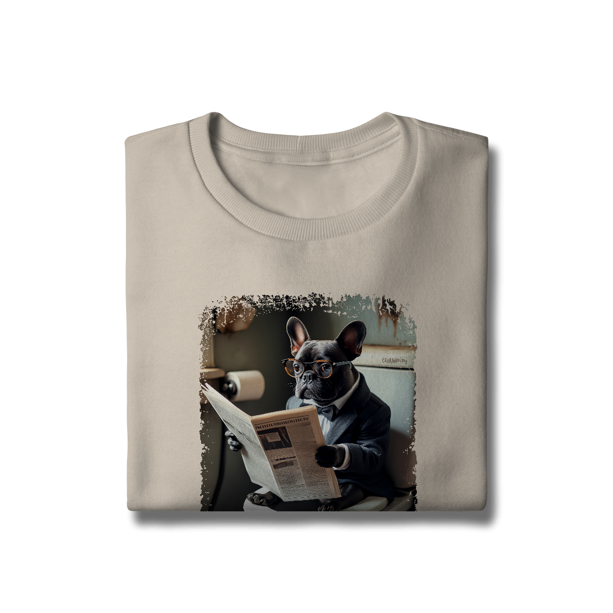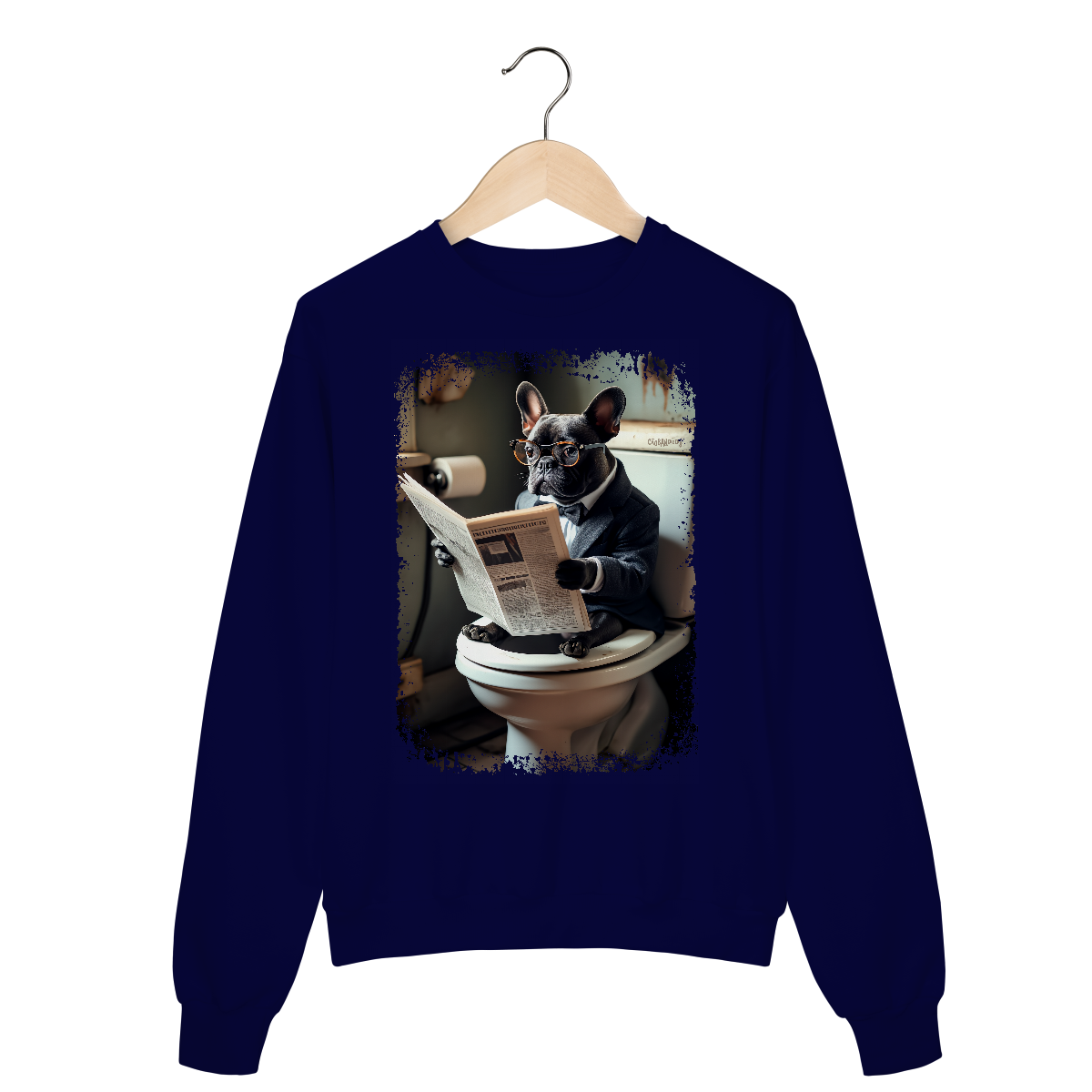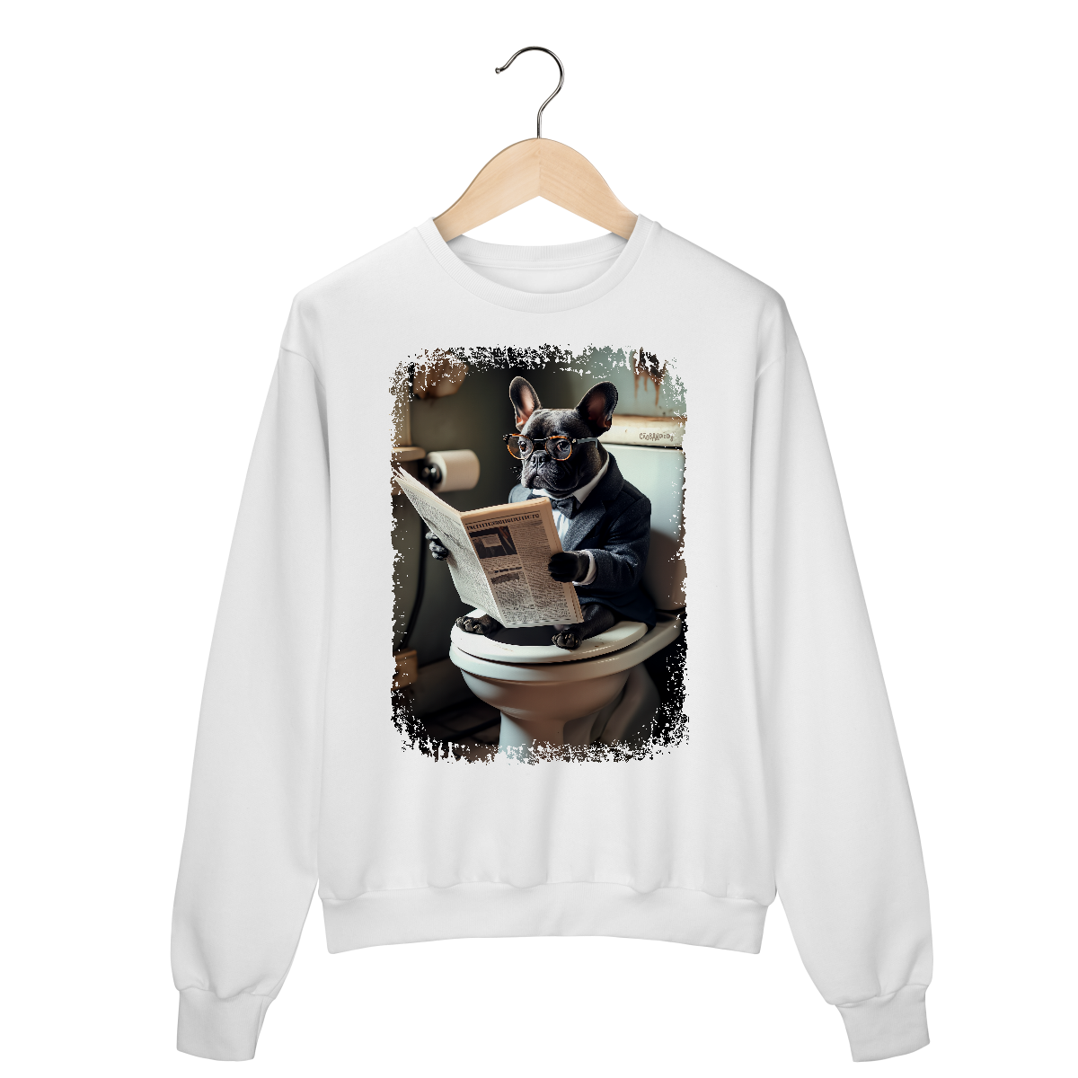 Agasalho de Moletom com Buldogue Francês no banheiro, ele está sentado na privada e lendo jornal.