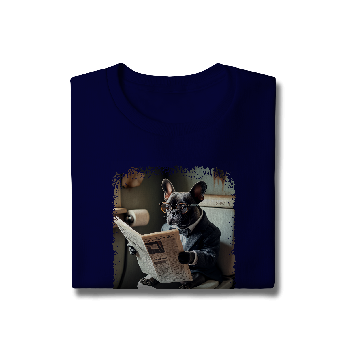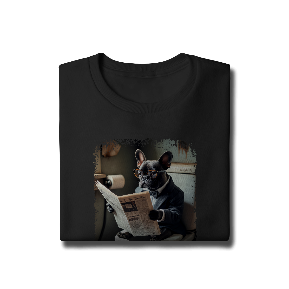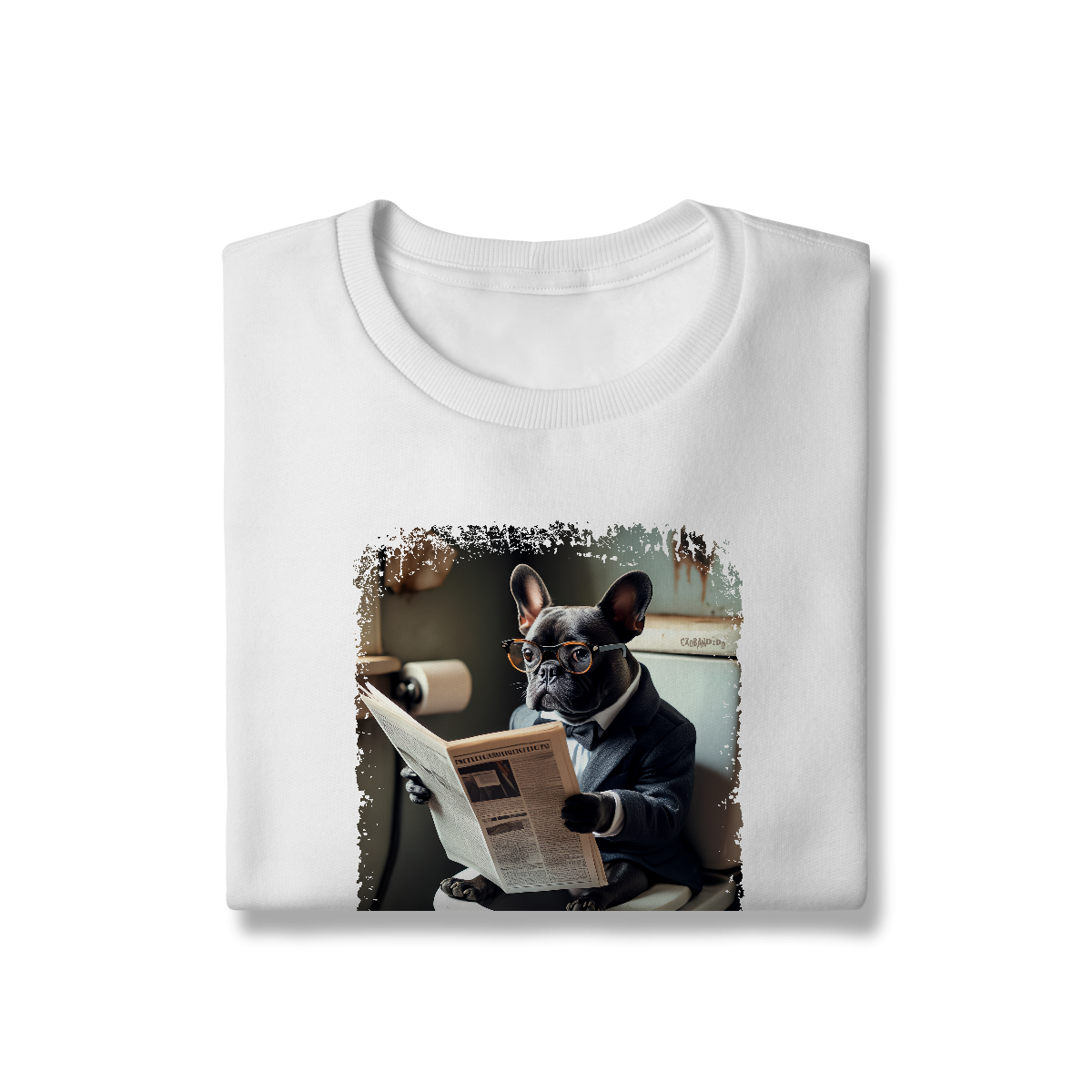 Agasalho de Moletom com Buldogue Francês no banheiro, ele está sentado na privada e lendo jornal.