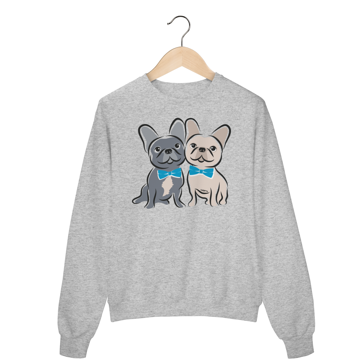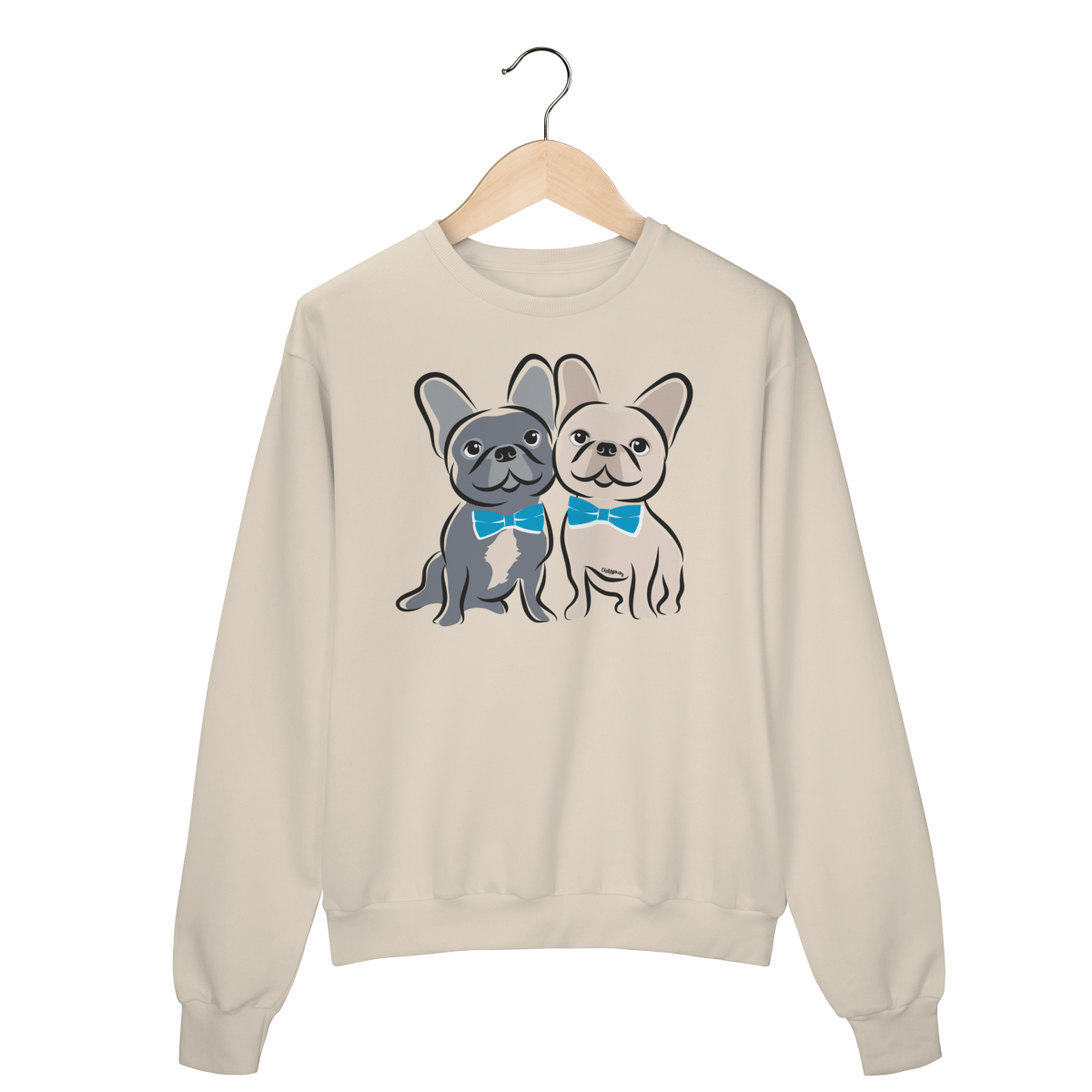 Estampa fofa de um casal de Buldogue Francês usando gravatinhas azuis.