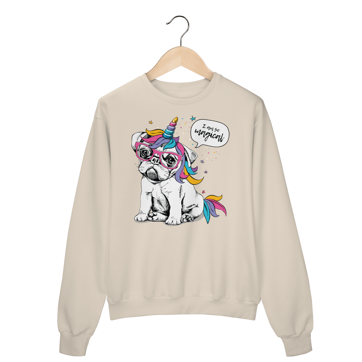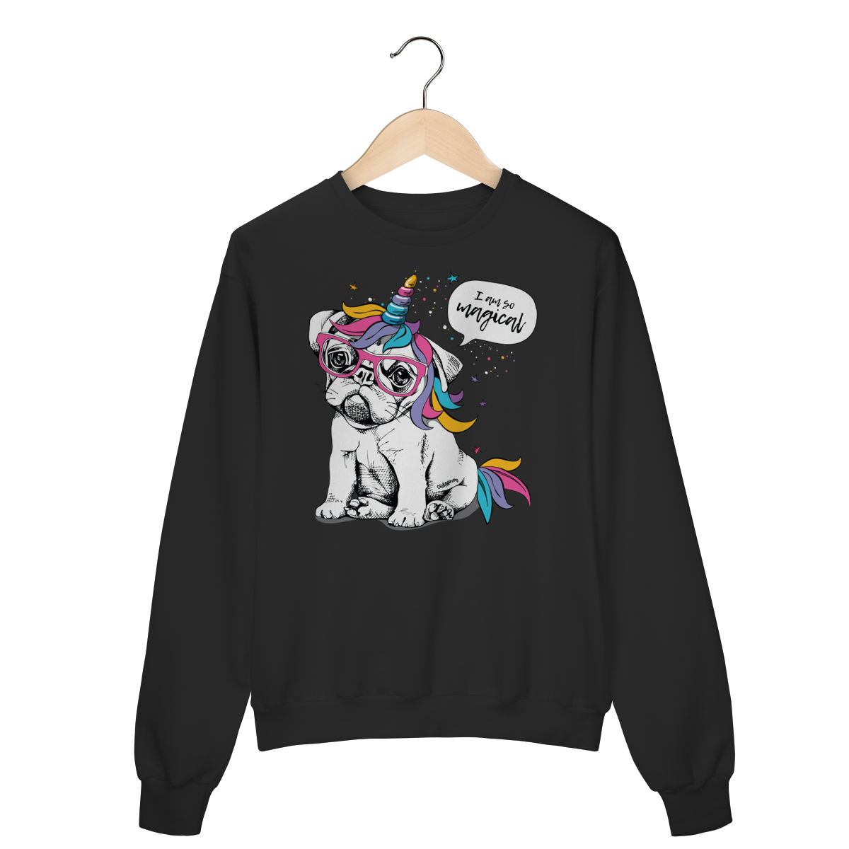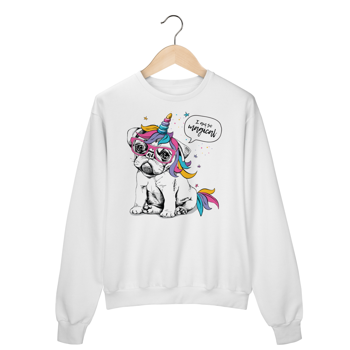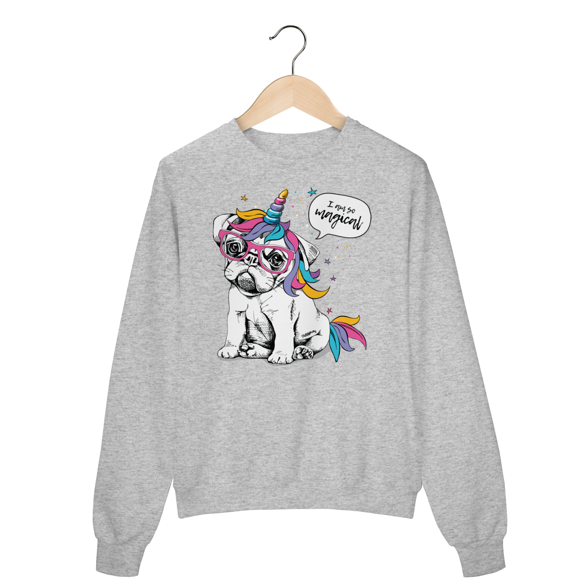 Moletom com estampa divertida de um cachorrinho usando óculos e um chifre de unicórnio, com crina e detalhes coloridos.
