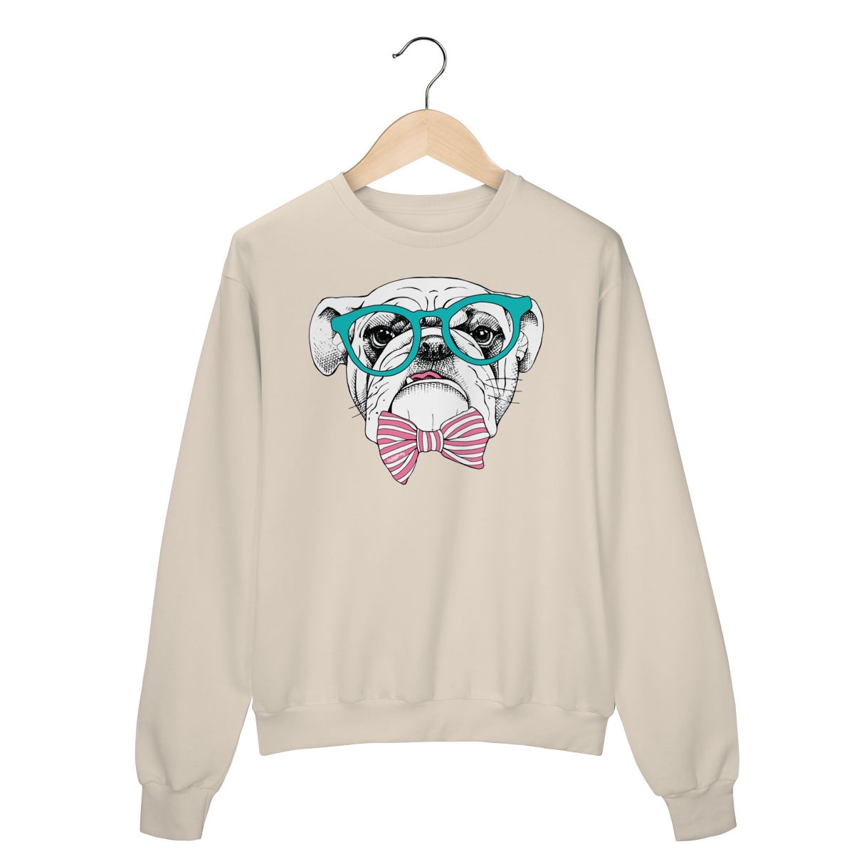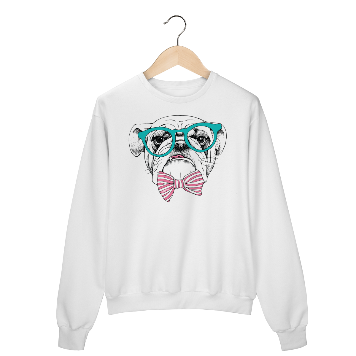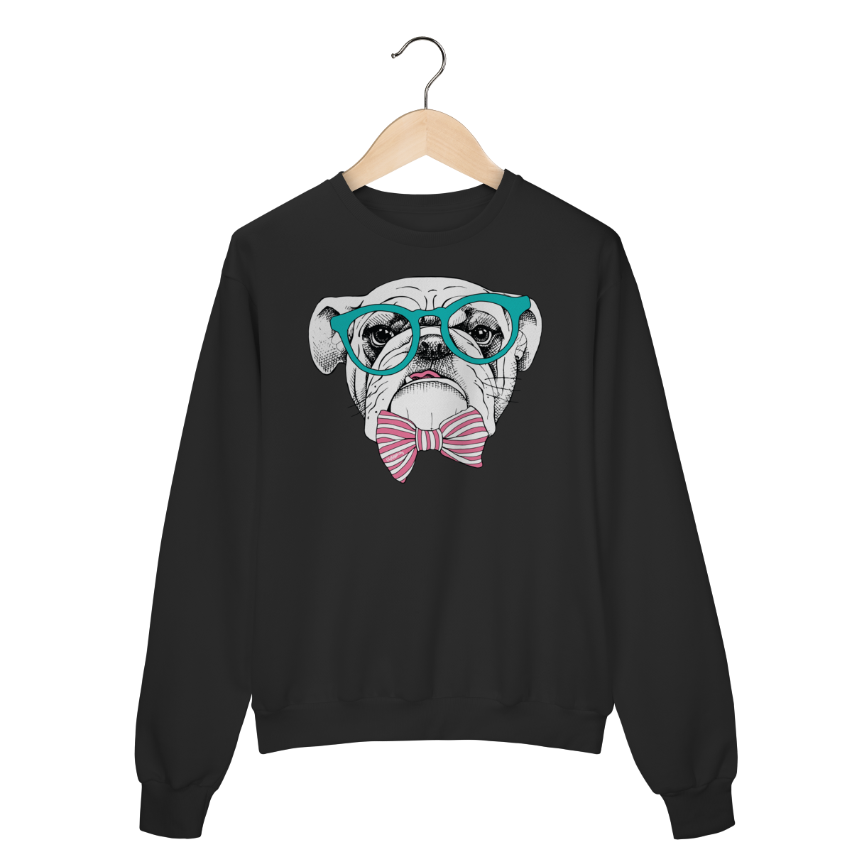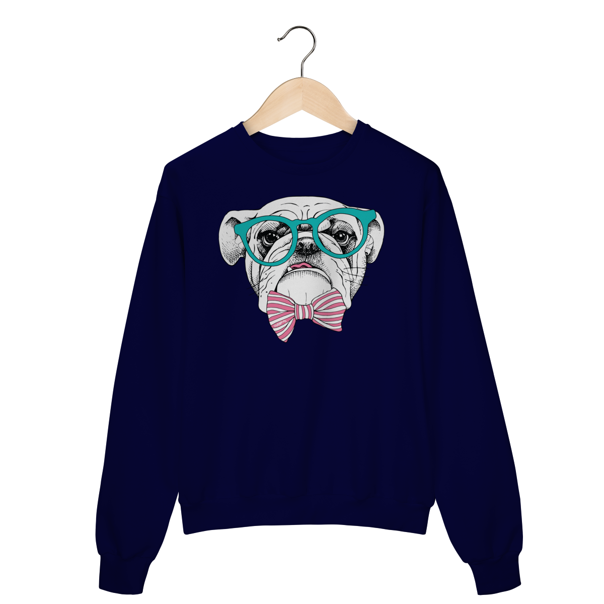 Para quem ama cachorro e também curte um visual cheio de personalidade. Estampa super charmosa de um bulldog inglês com óculos e gravata borboleta listrada, em um estilo moderno, divertido e elegante ao mesmo tempo.