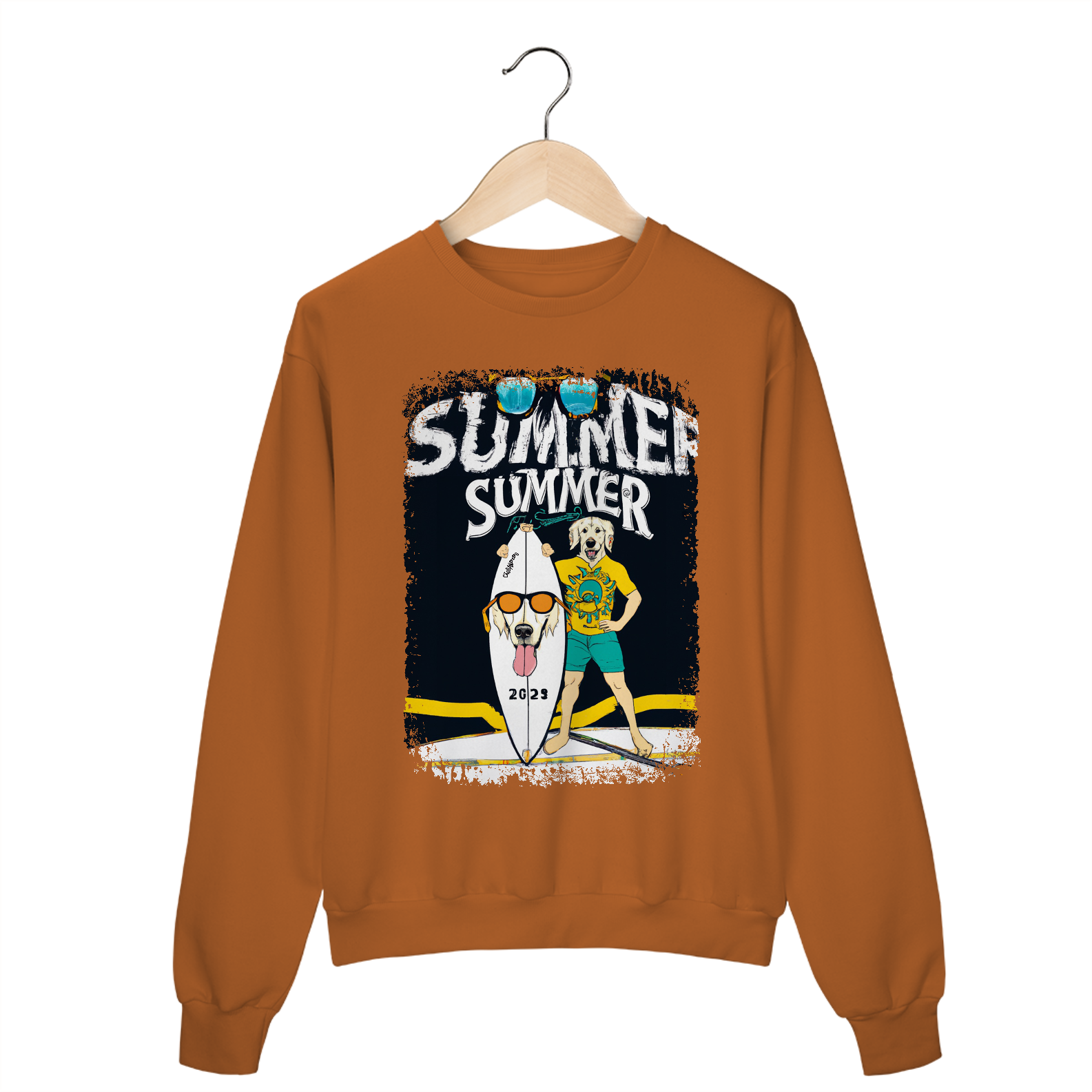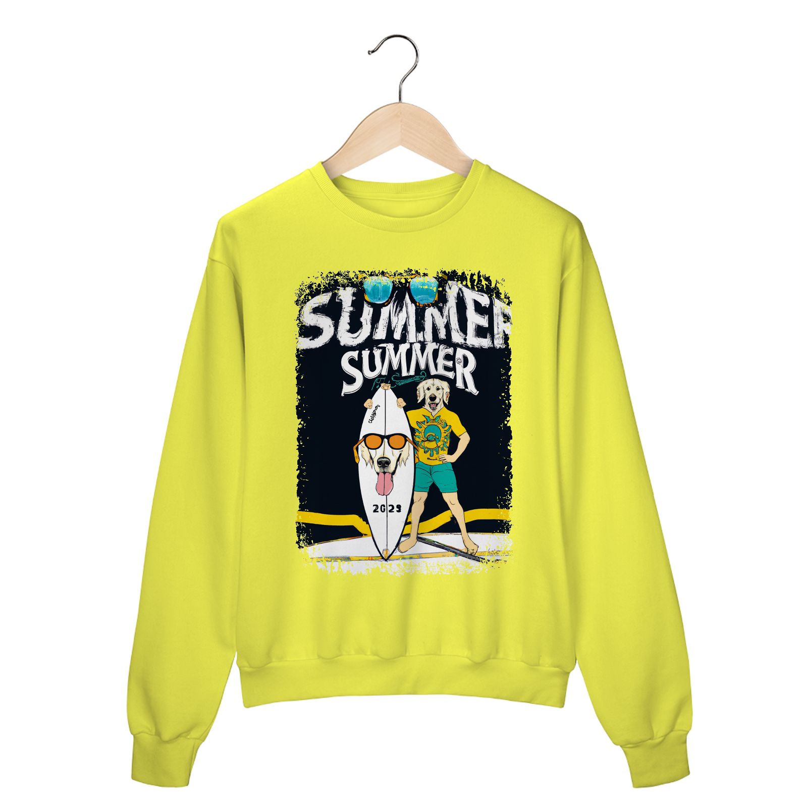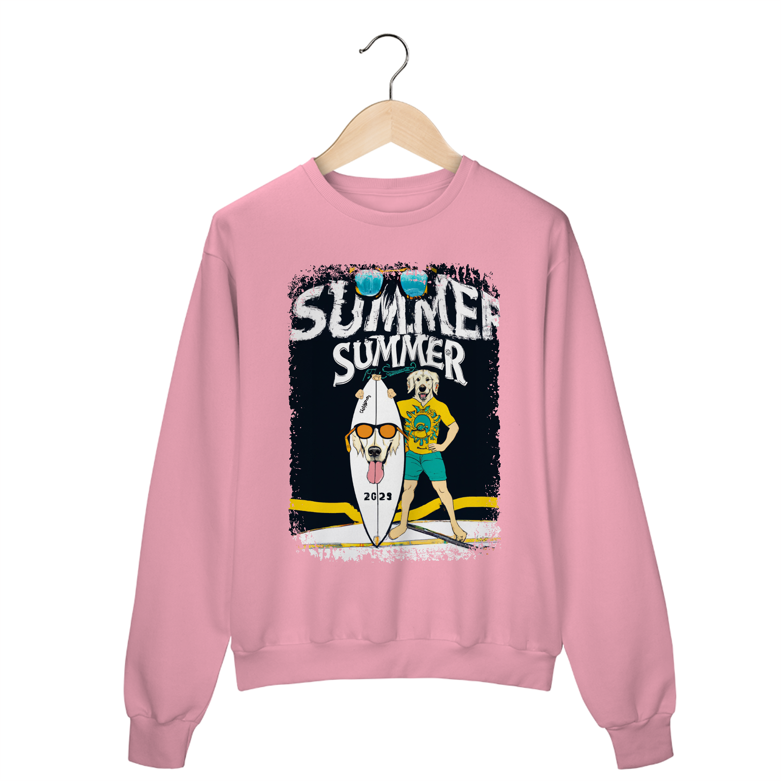Estampa criada por Inteligência Artificial, com um cachorro da raça Golden Retriever segurando uma prancha de surf.